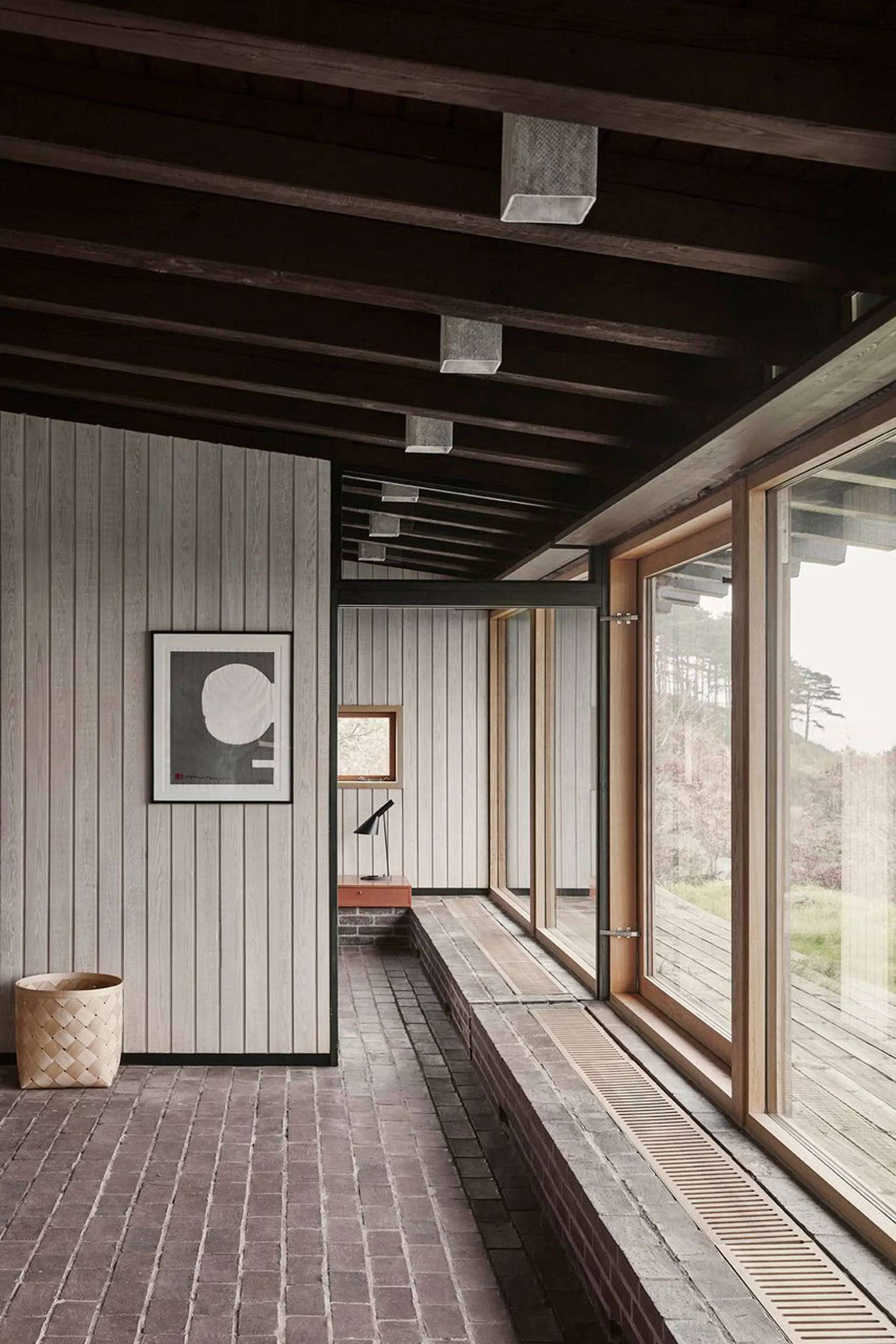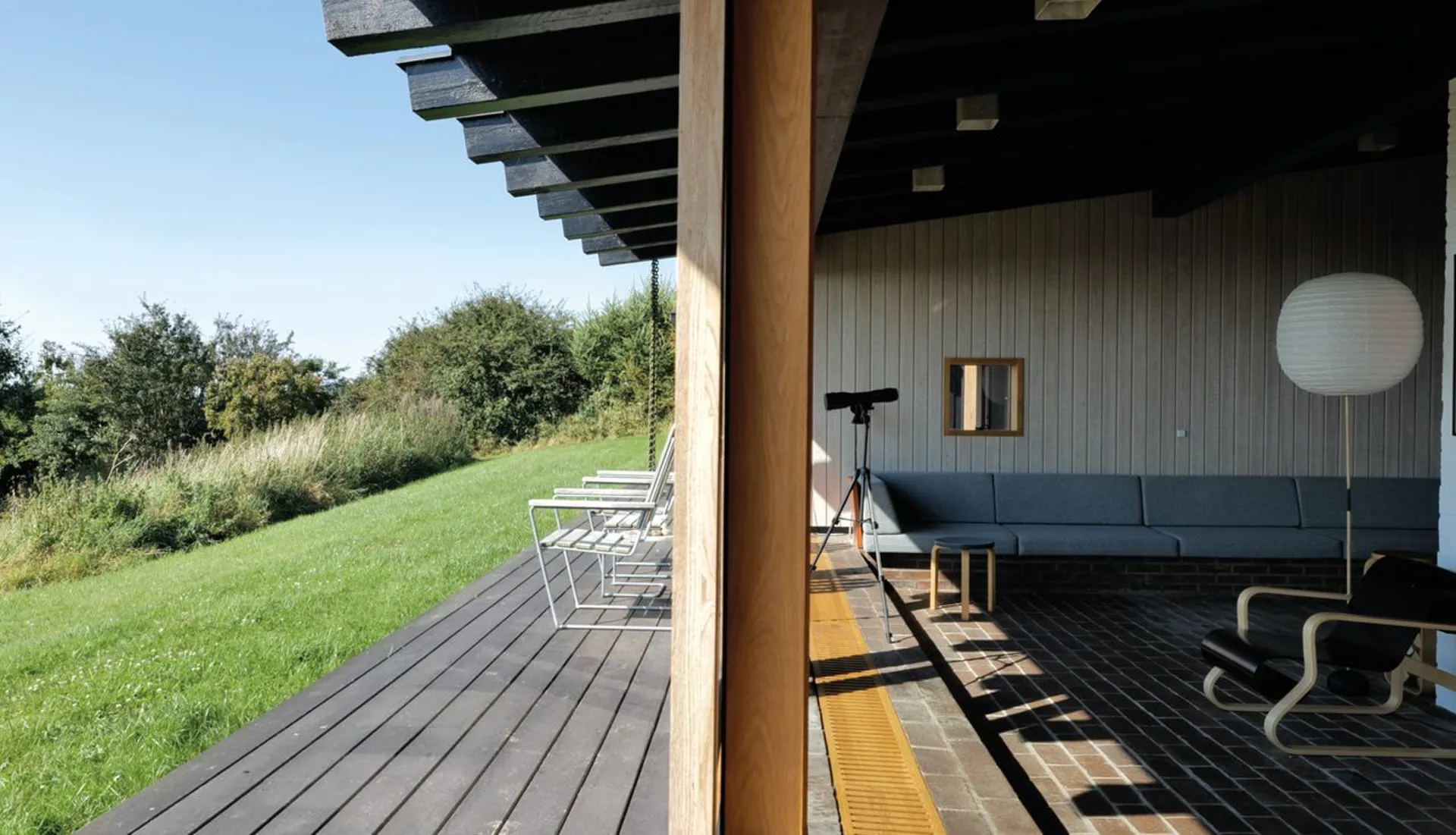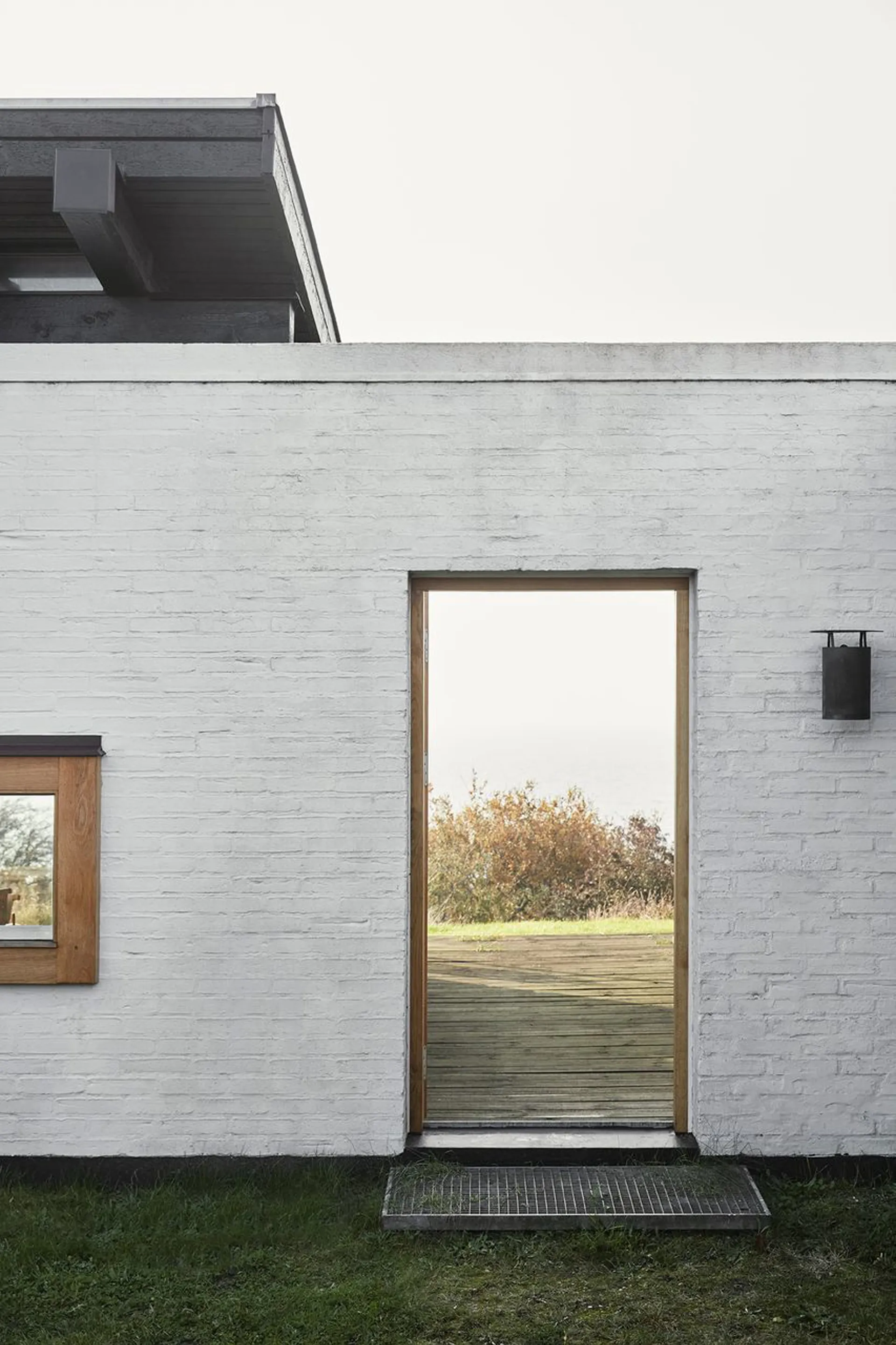 Ikke nok med at dette er et arkitekturhistorisk ikon i vores kulturarv, så er dette også et perfektioneret bygningsværk, der uden sin mage placerer sig på den absolut øverste hylde. Et fritidshus og et leverum – opført i 1975, med arkitektonisk inspiration fra 50’ernes minimale formsprog. En udsigtspost uden indsyn – og en 6.800 m² stor grund, der igennem tiden er blevet kultiveret til et naturrigt landskab med velplaceret terrasseområder, haverum og varieret beplantning. (Der er anlagt nyt terrasseområde siden fotografen var forbi). Et bygget kunstværk, der med sin elegante geometriske forståelse placerer hovedhus og en mindre sideliggende bygning i en nærmest vægtløs tilstand på toppen af det kuperet landskab, der fra afstand ligner opstigningen til Mols Bjerges National Park. Kompetent leges der med afstanden mellem de hvide vægges minimalistiske placering ved og omkring bygningsmassens sorte kubistiske former. Et elegant greb, der tvinger os som iagttagere til at forholde os til mødet mellem det abstrakte og konkrete og en visuel effekt, der håndfast griber om den omkringliggende natur. Uden at blive sær og uden at miste sig selv som bygningsværk. Respektfuldt og uhyre velplaceret.