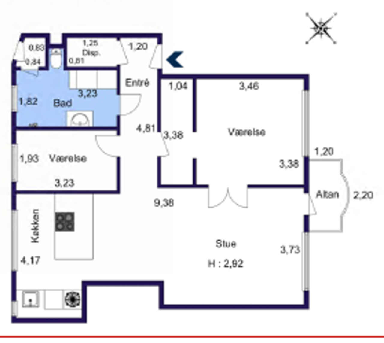 Indretning: Entré til to skønne soveværelser – det ene orienteret mod øst, det andet mod vest. Stort alrum, som forbinder køkken, spiseafdeling og opholdsstue med de skønneste lysindfald fra den vestvendte altan og køkkenets orientering mod øst. Lejligheden har af nuværende ejer fået tilført nogle virkelig lækre, snedkerbyggede skabsløsninger, der blandt andet inkluderer et eksklusivt indrettet walk-in i passagen mellem forældresoveværelset og entréen.