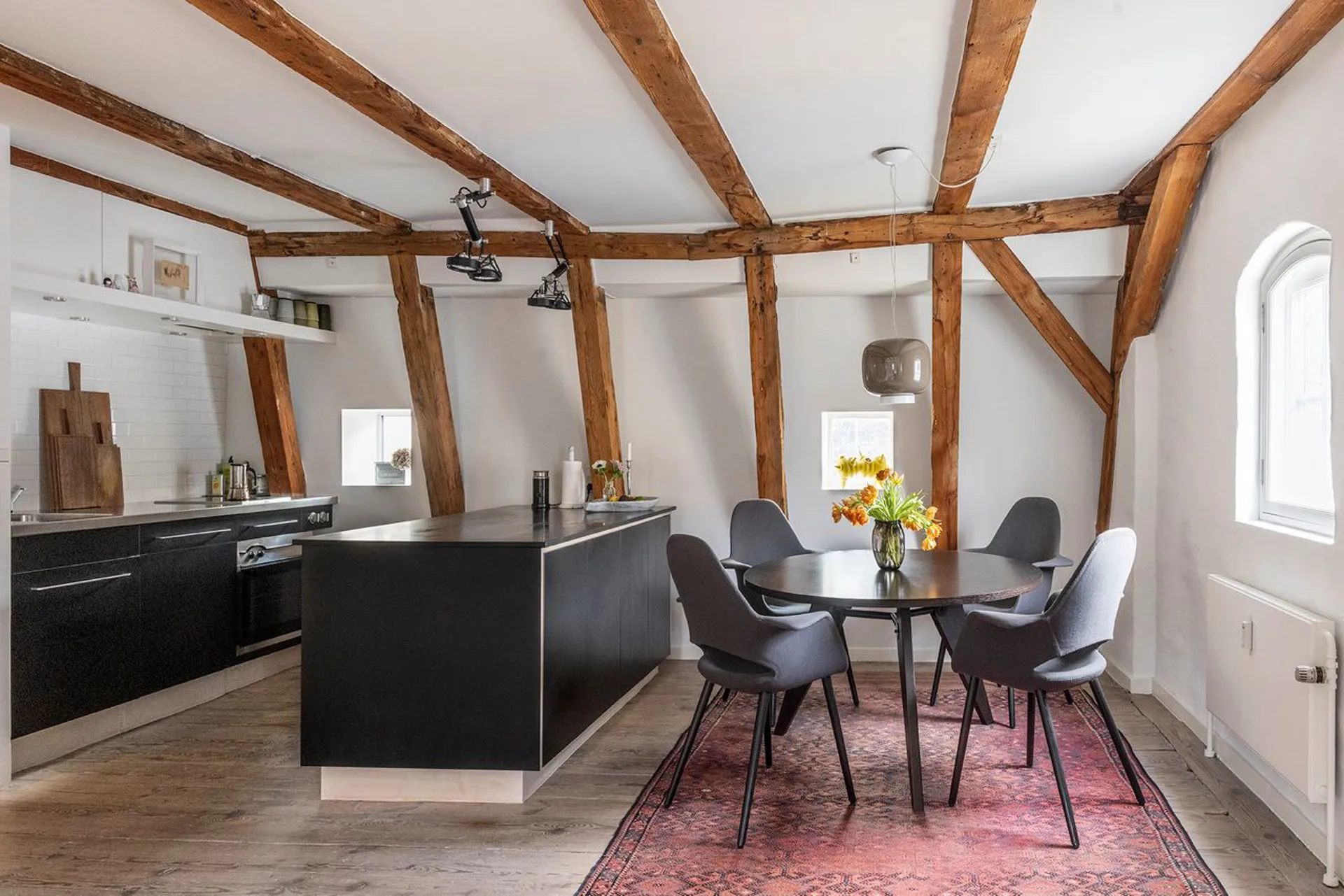 Lejligheden fordeler entré, hvorfra der er adgang til stort soveværelse, smagfuldt badeværelse med brus og grundplanets store alrum med funktionelt indrettet køkken, spiseafdeling og opholdsstue. Herfra trappeløb til lejlighedens øvre niveau, der i dag er indrettet som stor opholdsstue på mere end 40 m² med loft til kip – et fantastisk rum, som omfavner en med nærhed og hjertelighed.