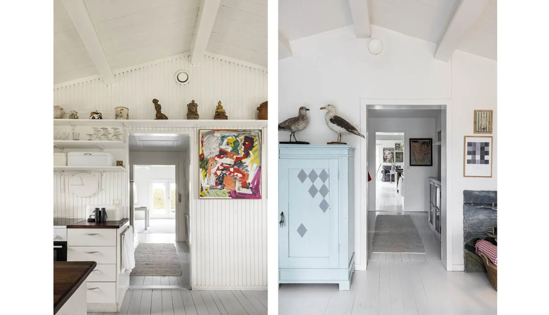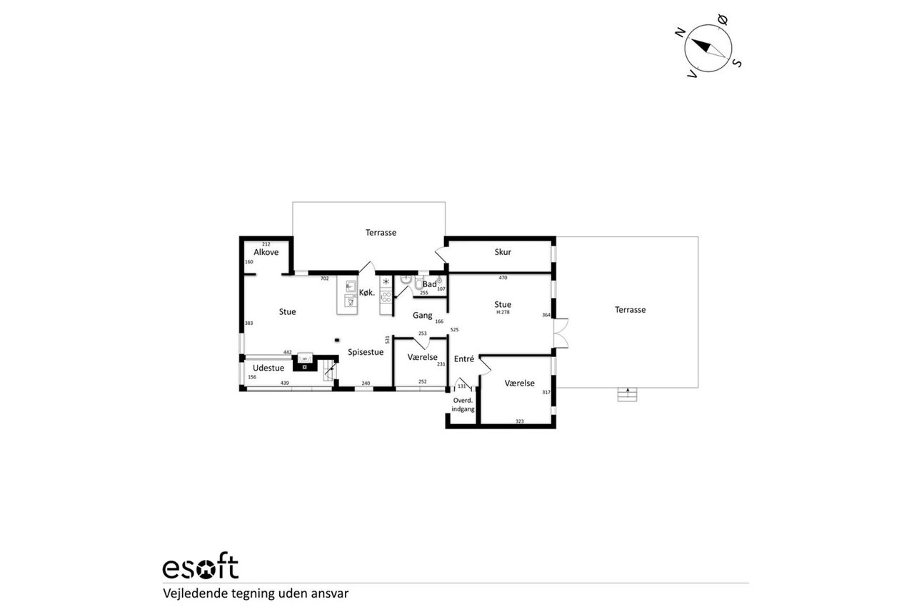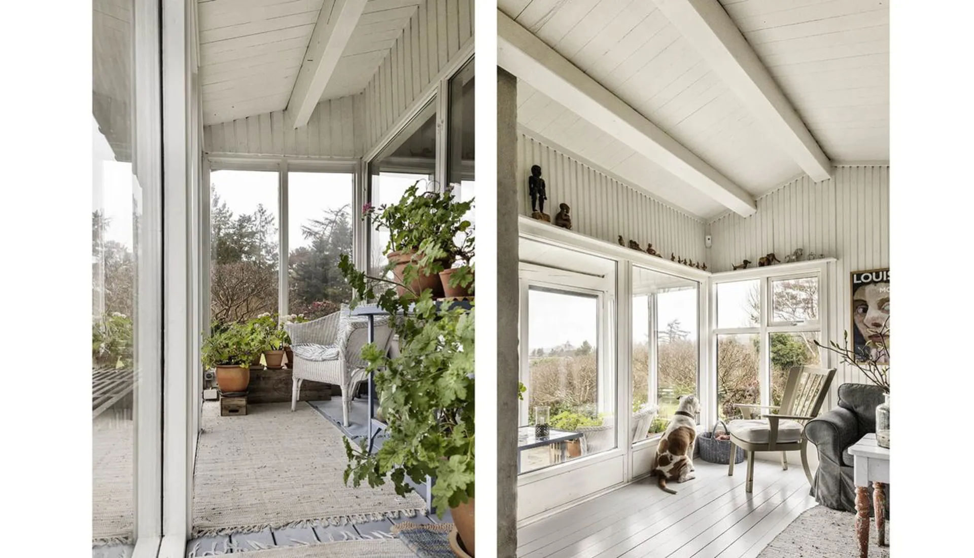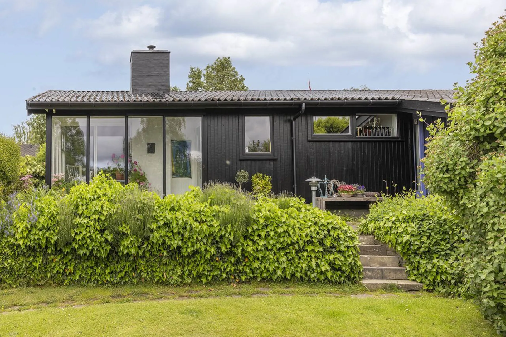 Indretning: entré til mindre mellemgang, hvorfra der er adgang til soveværelse og stueområde med udgang til stort sydvendt terrasseområde, der ligger som genbo til kupperede marker og himmelkig. Passage med adgang til badeværelse med brus og mindre soveværelse, videre til husets store alrum med funktionelt indrettet køkken, hvorfra der udgang til østvendt terrasseområde og stort stueområde med pejs, alkove og den skønneste udsigt ud over områdets bugtede landskab. På siden af alrummet er der orangeri/opholdsrum for mennesker og planter og i forlængelse af den østvendte terrasse er der isoleret skur, ideelt som viktualierum, og naturligvis fint til alverdens opbevaring.