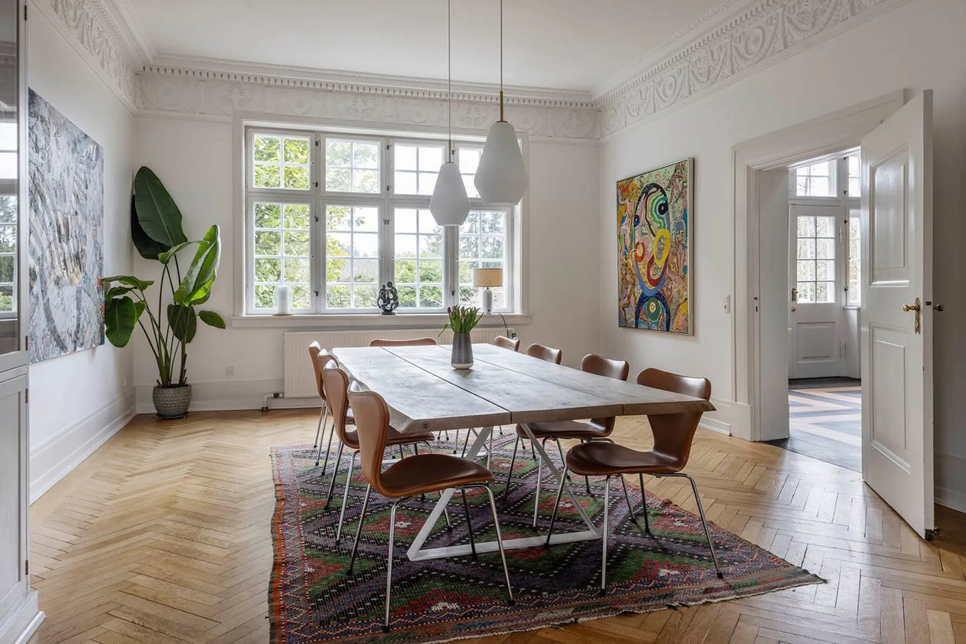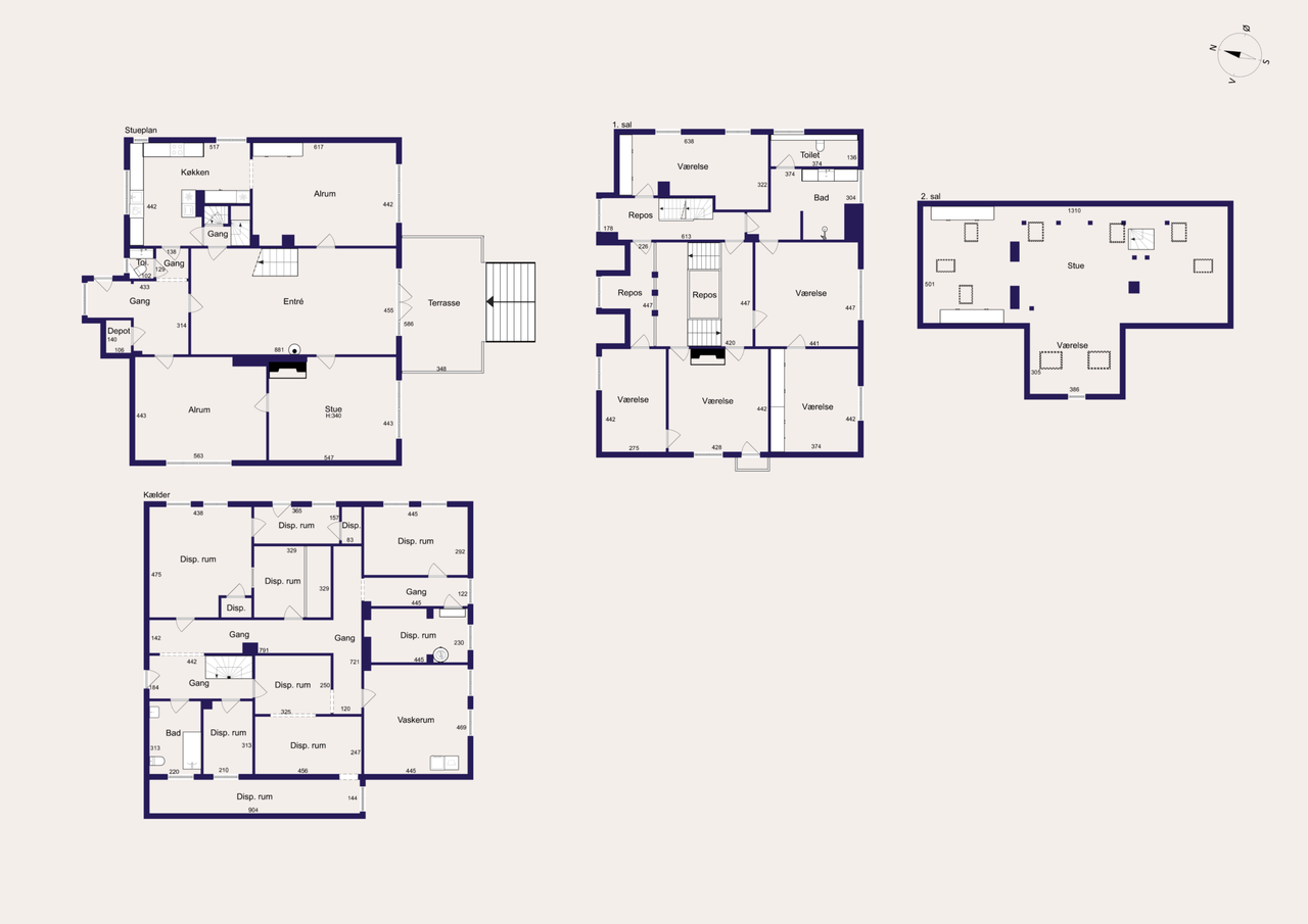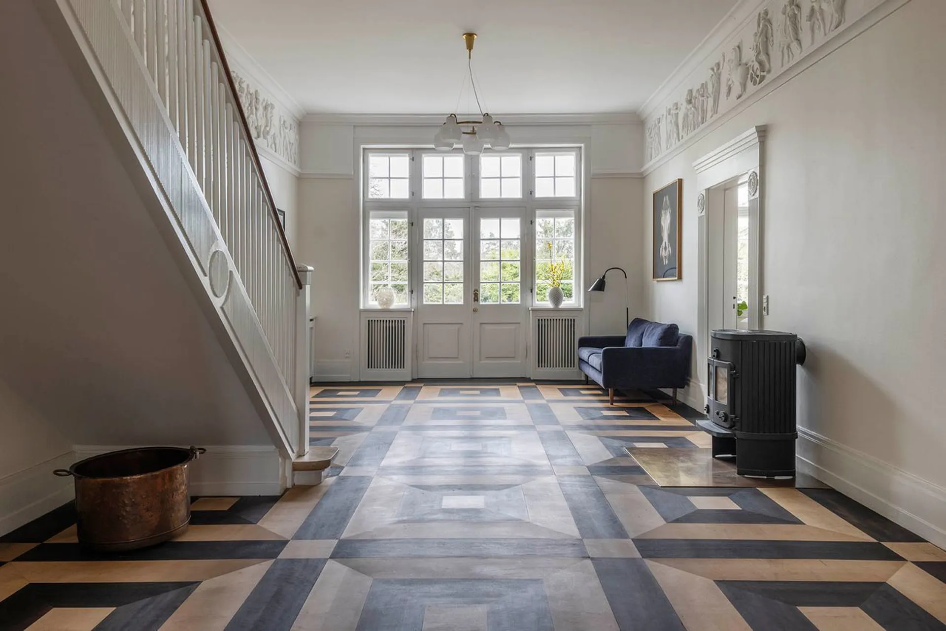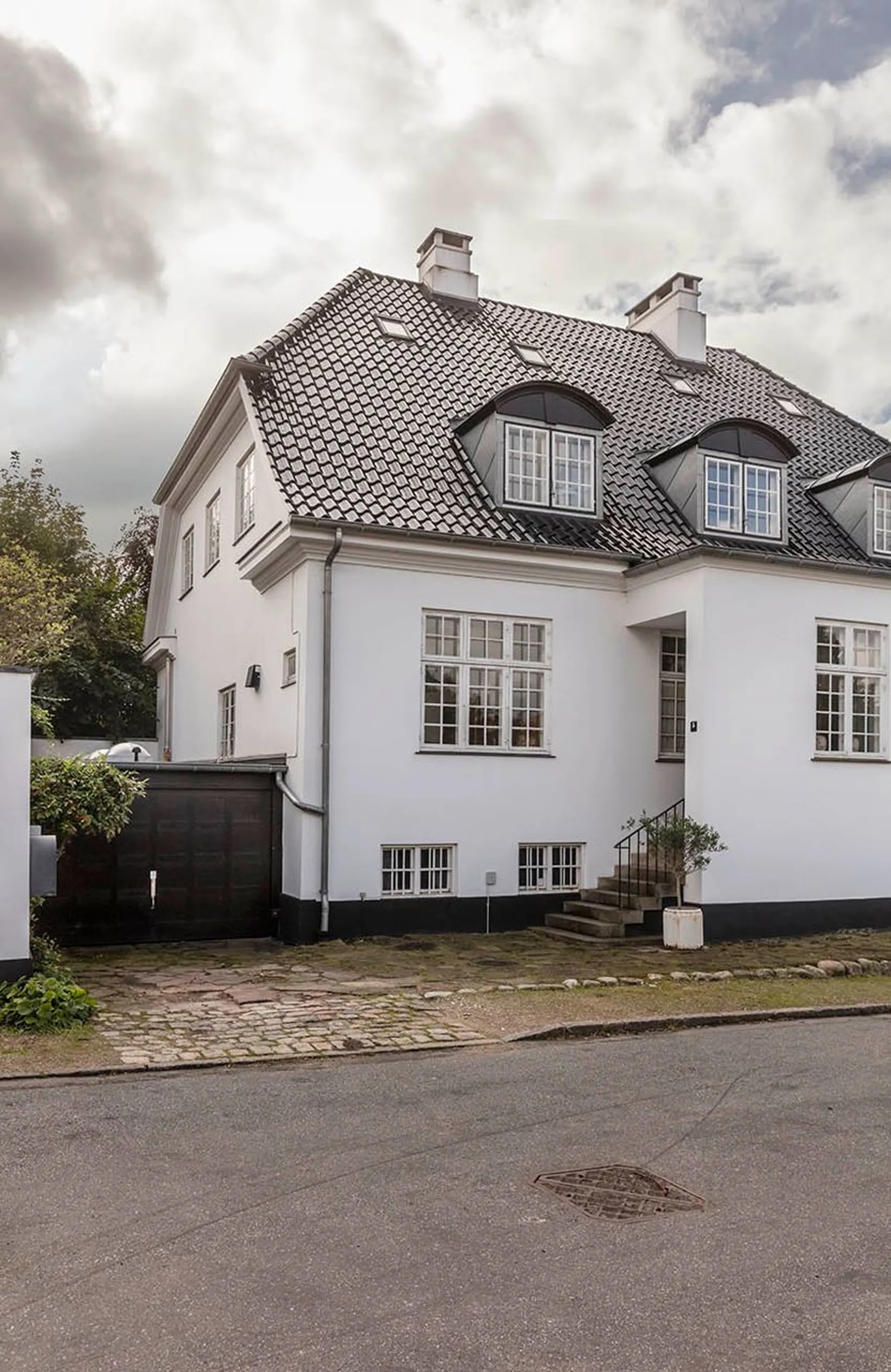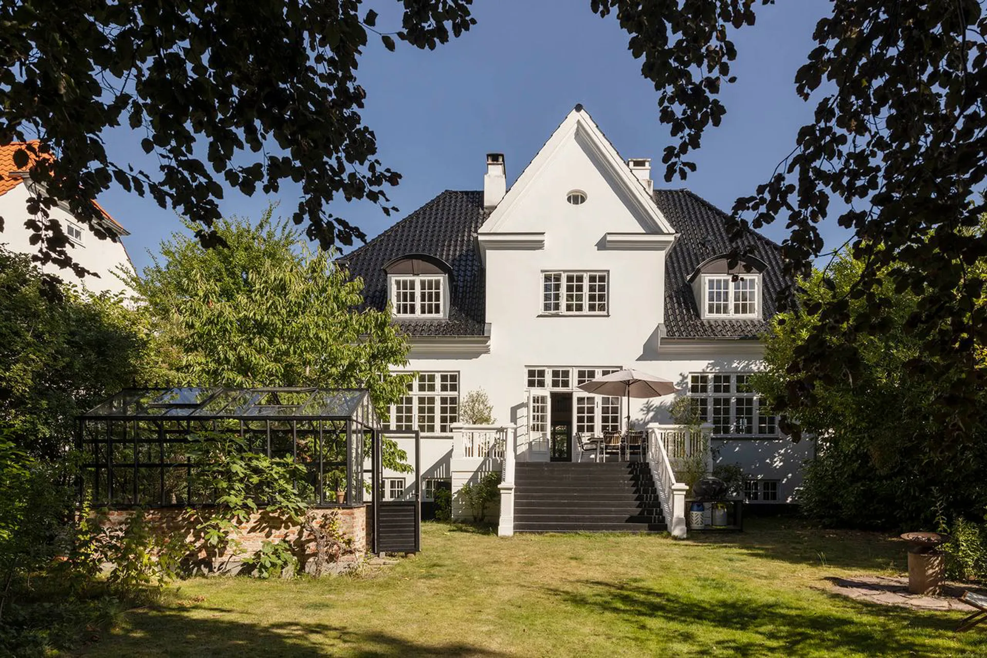 Indretning: Entré til en imponerende hall med Alexanderfrise, gæstetoilet og trappeløb med repos til 1. sal og det smukkeste trægulv, som forventeligt er originalt fra husets opførelse. Desuden udgang til stort solbeskinnet nyere opført terrasseområde, der i sin udførelse står som kopi af husets originale terrasse (der dog var noget mindre). To herskabelige stuer en suite til mellemgang, der fører til funktionelt og smagfuldt indrettet køkken, som ligger i åben forbindelse med stor spisestue. 1. salen er indrettet med fem gode værelser, hvor to er lagt sammen til forældreafdeling med eget luksuriøst badeværelse og walk-in. 2. salen er indrettet som ét stort åbent alrum med loft til kip og de skønneste lysindfald fra tagvinduerne. I sin helhed en suveræn fordeling af værelserne, som giver plads til både privathed og fællesskab for den store familie. Husets underetage er godt disponeret med værelser, vaskefaciliteter, vinkælder og alverdens muligheder for teenageafdeling, gæsteafdeling, motionsrum mv. Yderligere sideliggende garagebygning på 42 m2 med gode anvendelsesmuligheder. Dette er en villa i særklasse. En bolig, der ud over det sædvanlige giver rammerne for at indrette sig med massere af plads i historiske smukke omgivelser.