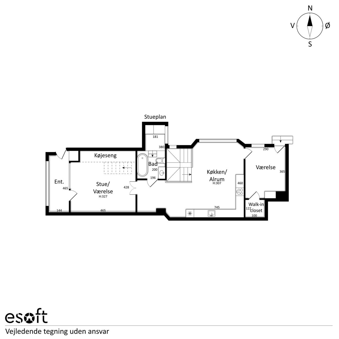 Indretning: Privat indgangsparti til entré med garderobeplads (eneste rum orienteret mod Bülowsvej). Herfra indgang til alsidigt rum, hvilket i dag benyttes som værelse. Køkken alrum med elegant trappeløb til lejlighedens underetage med disponibelt rum og opbevaringsrum. Herudover har lejligheden et masterbedroom med direkte udgang til hyggelig gårdhave. Niveaufordelt stilrent badeværelse med vaskefaciliteter.