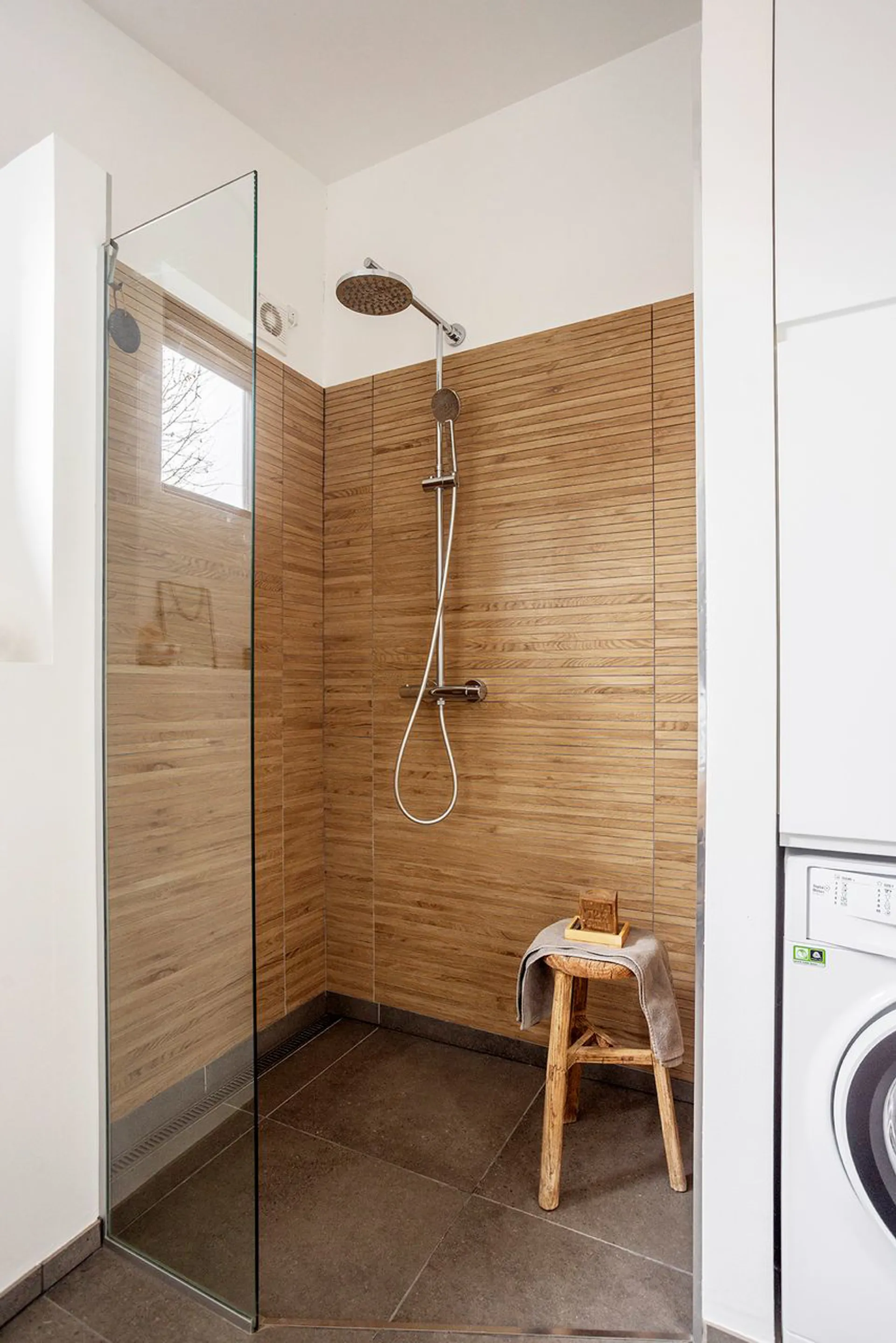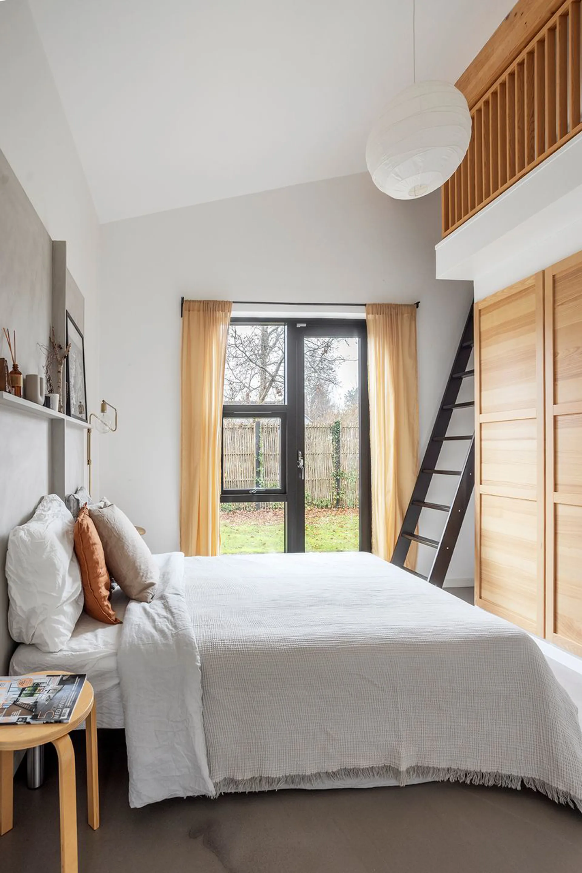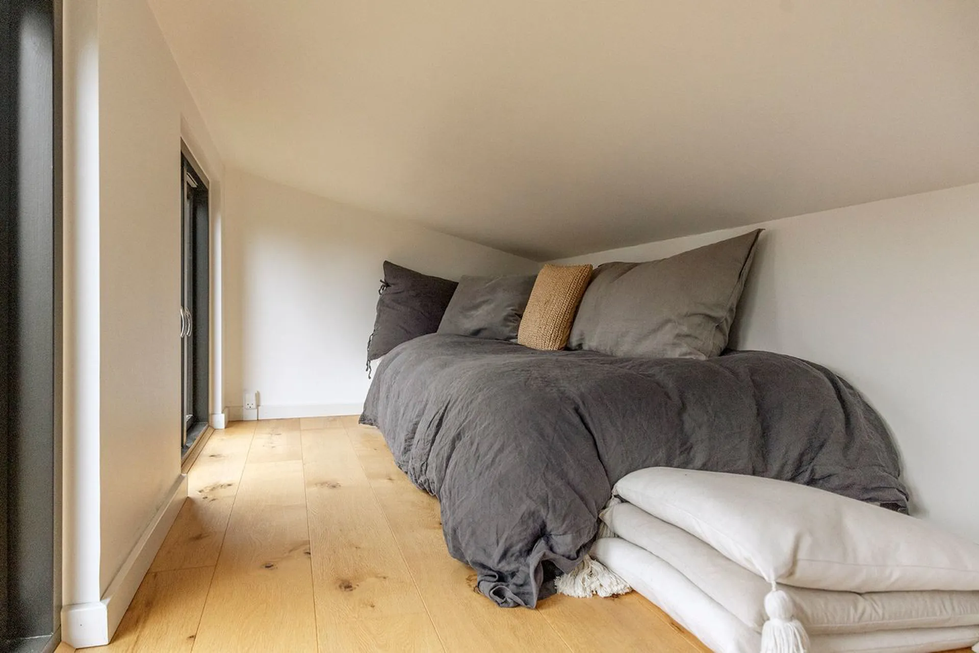 Pladsen er udnyttet med stor omtanke. To soveværelser med hver sin hems giver fleksibilitet og gør huset anvendeligt året rundt. Badeværelset ligger enkelt og velplaceret ved entréen.