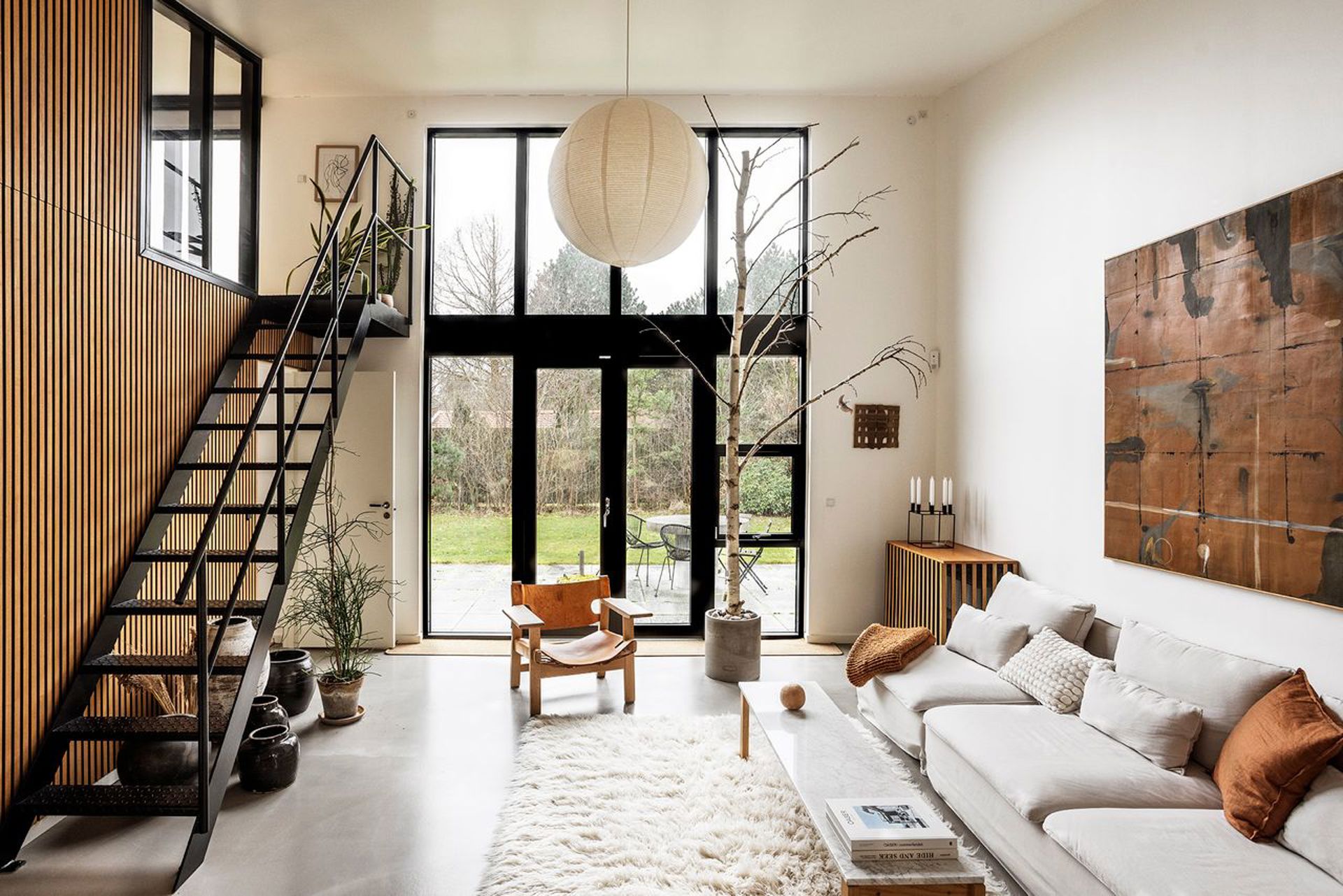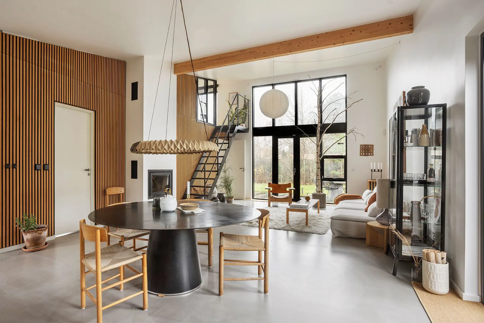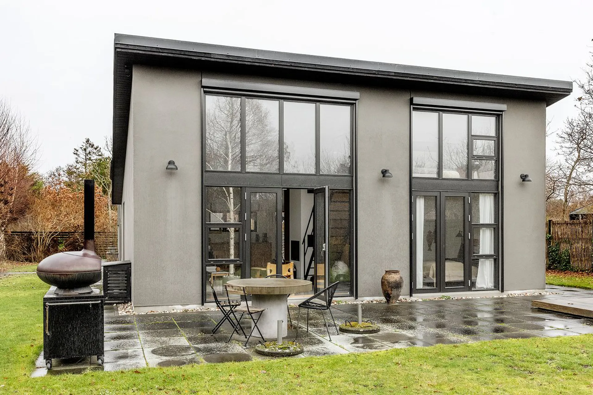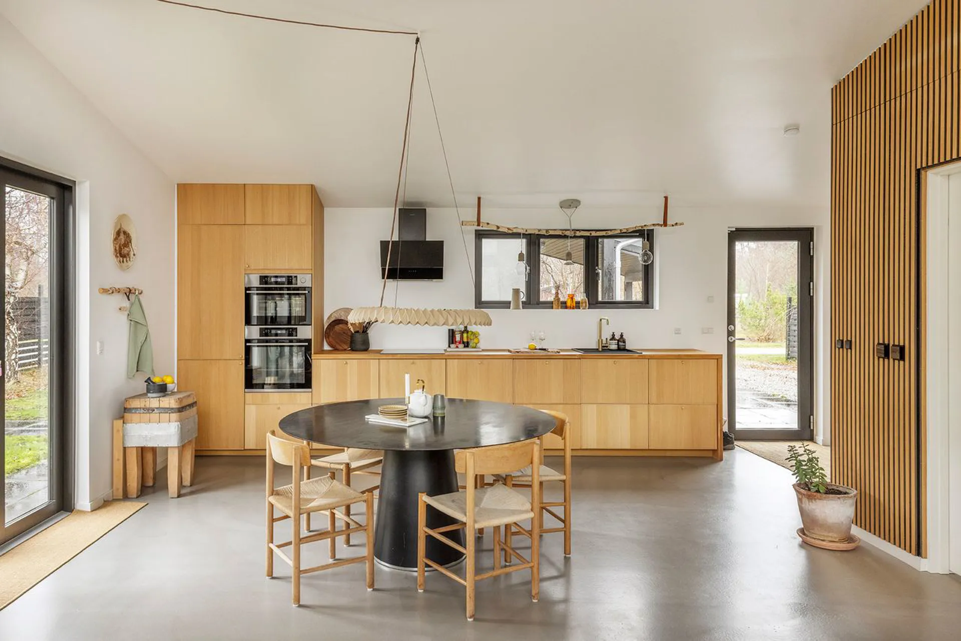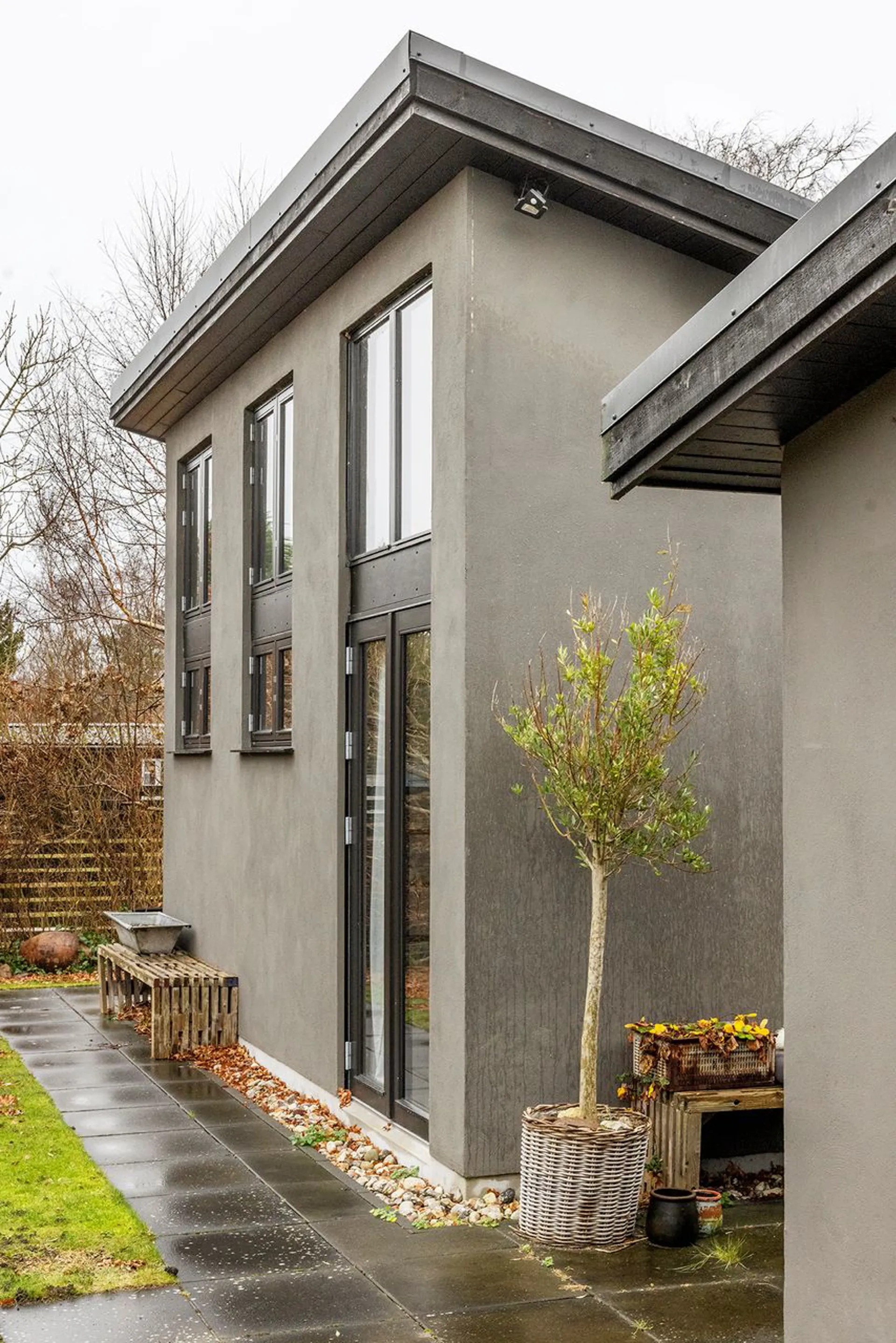 De 90 boligkvadratmeter suppleres af et 14 m² anneks og fremstår som én sammenhængende helhed. Store vinduespartier åbner opholdsrummene mod haven og lyset, og køkken og stue samler huset i ét naturligt leverum, lige velegnet til ro, samvær og hverdagsliv.