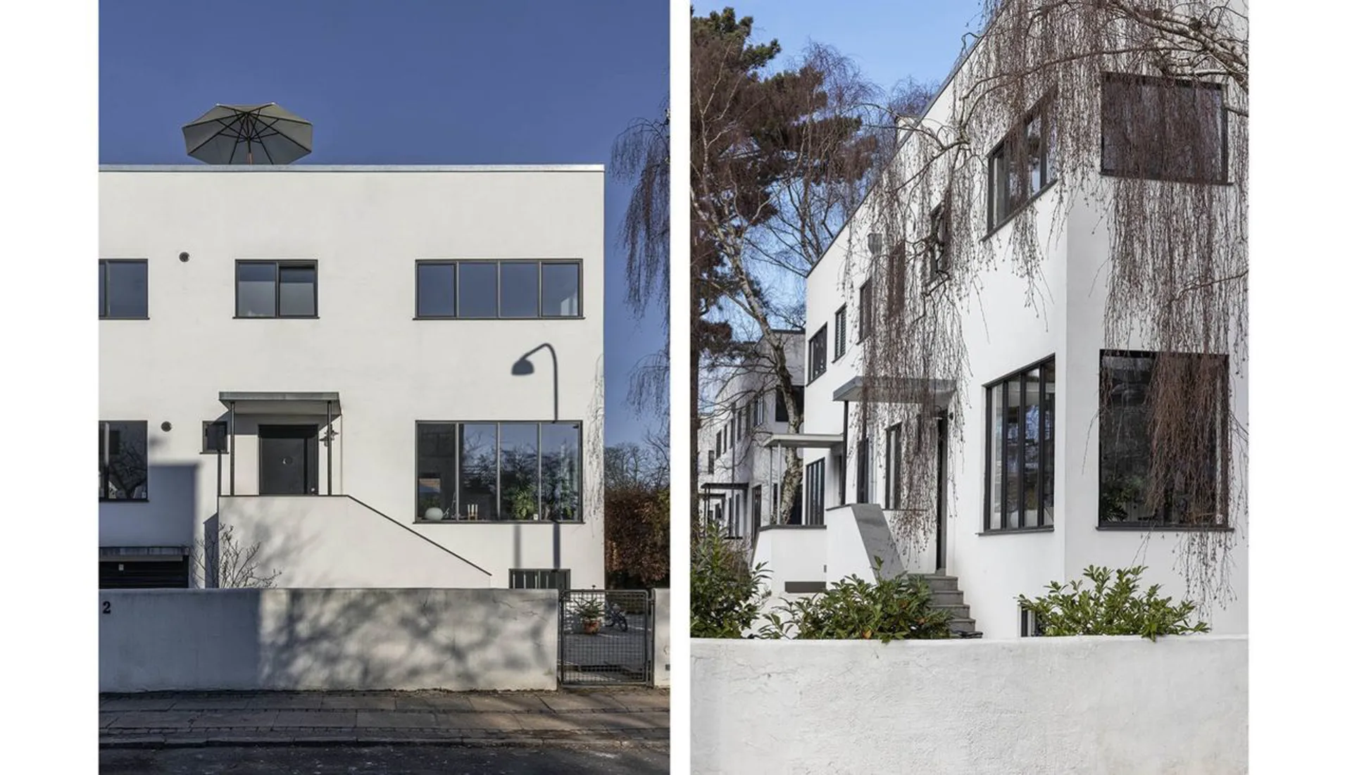 Alle husene fremstår i dag hvide, malet i ét med de omkringliggende mure mod vejen. Det må ikke være anderledes, men oprindeligt blev de opført i en farveskala efter stilperiodens ikoniske le Corbusier. Kraftige farver, inspireret af Bauhaus-skolens tre grundfarver: gul, rød og blå. Husene var gulpudsede, vinduer og døre var rødmalede, mens undersiden på altaner og balkoner var marineblå. Det var et sandt eldorado for datidens forbipasserende. Et tilflugtssted for mange, der kunne komme her og pege fingre ad de revolutionæres uforstandighed. I dag står vi tilbage og må ubetinget konstatere, at det, der dengang blev grinet hånefuldt ad, er det samme, som siden har været pejlemærke for hele vores moderne selvforståelse, hvad angår design og arkitektur. Sådan ser vi det ofte med forandring, og sådan skal det nok også være, før det virker forvandlende.