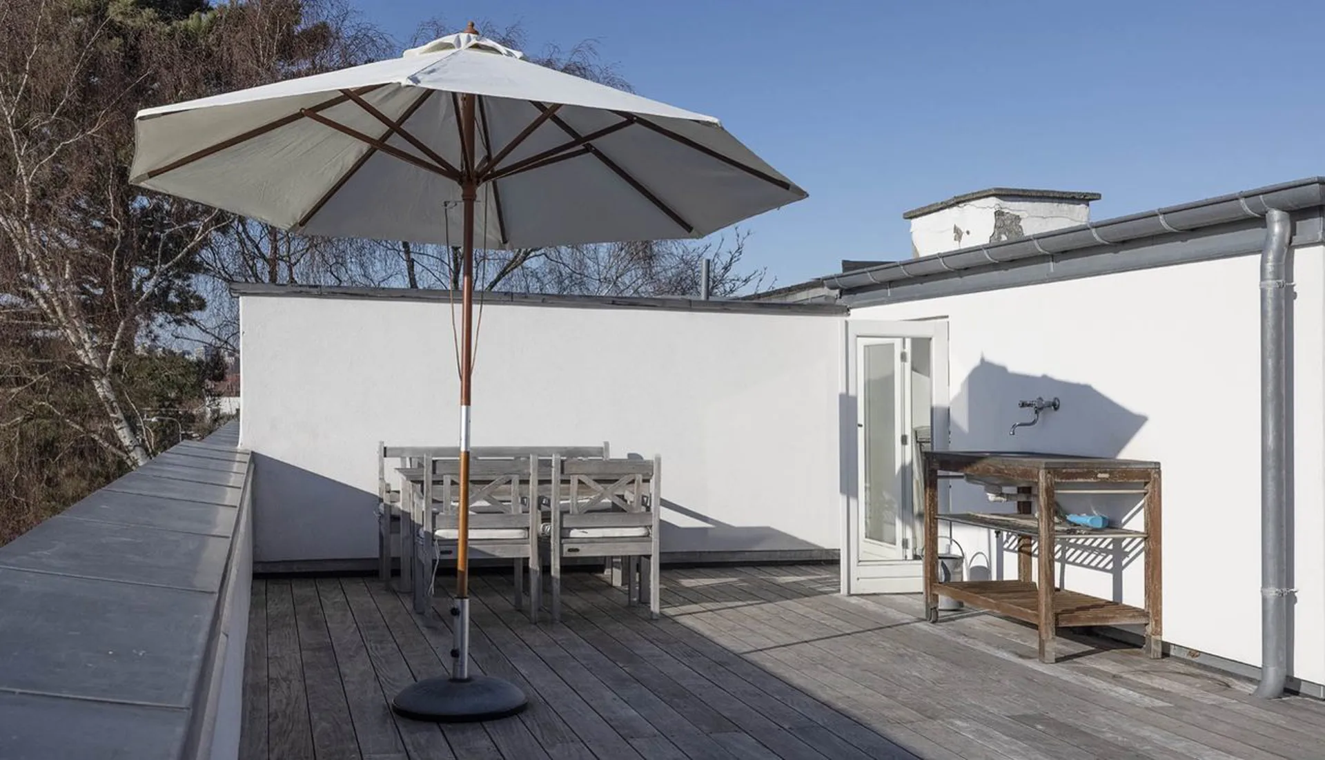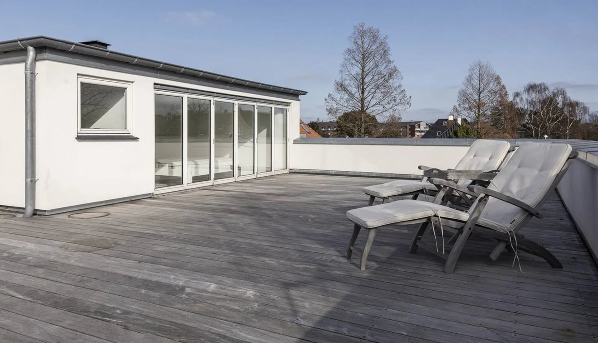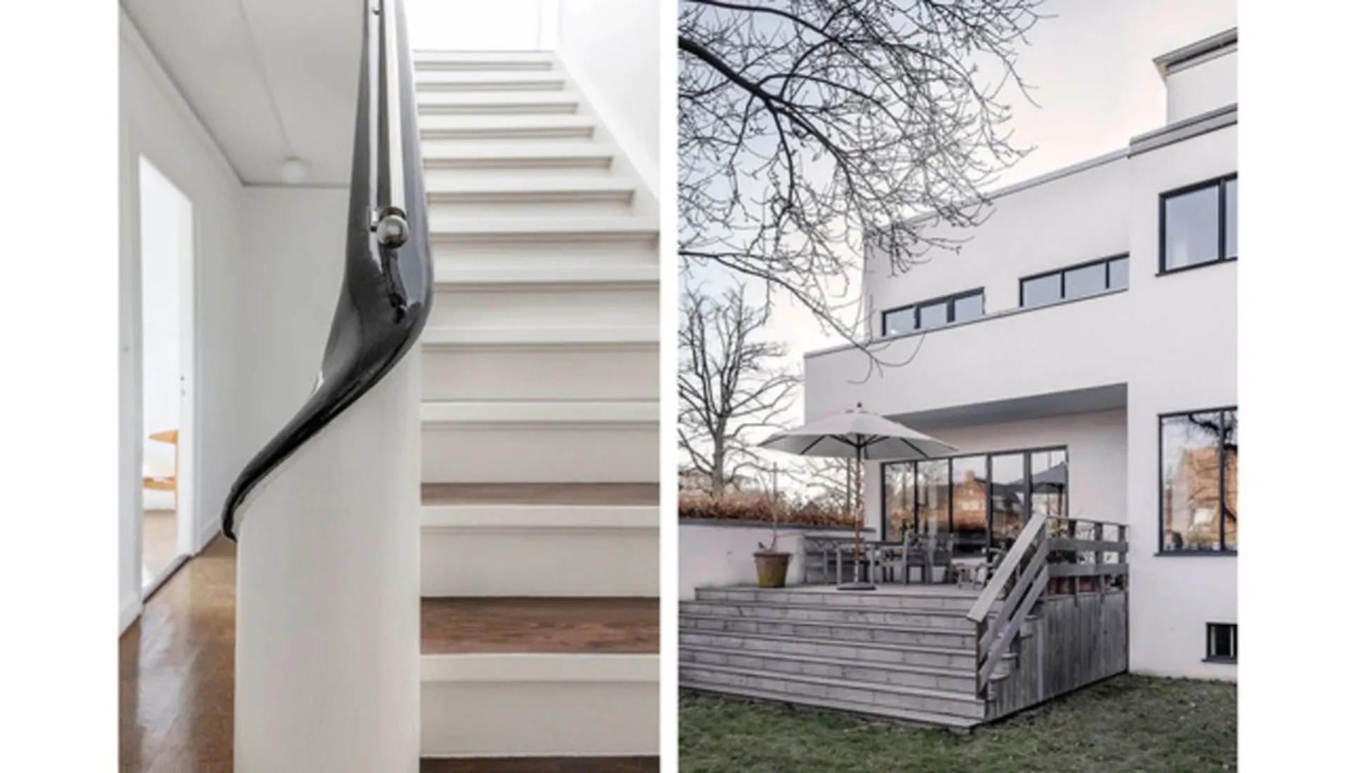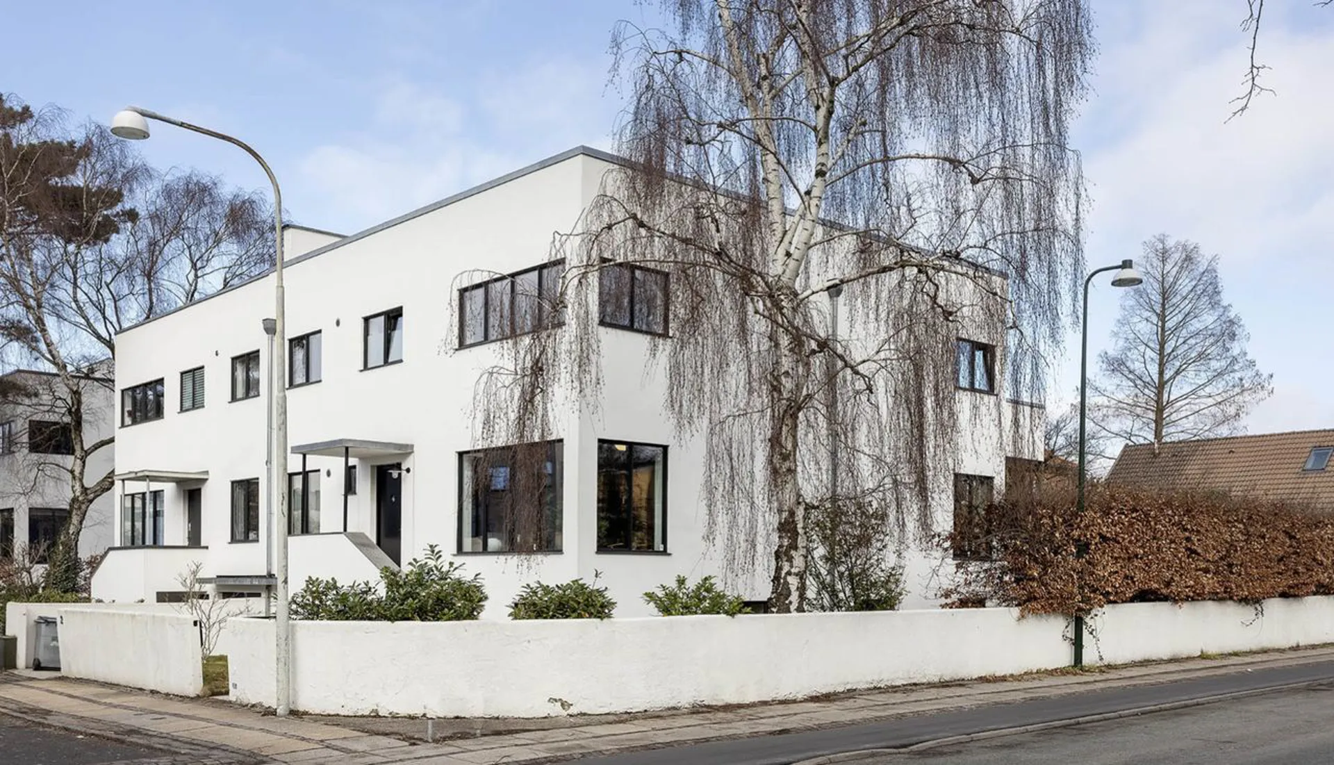 Ikonisk halvt dobbelthus på 388 etagemeter (BBR: 268 m2) med have og stor privat tagterrasse. Funktionalistisk arkitektur fra 1933 tegnet af mesterarkitekten Hans Dahlerup. Ejendommen er beliggende i et af Frederiksbergs mest attraktive kvarterer tæt på Femte Juni Plads, tæt på skoler og tæt på indkøb. Indretning: Entré med gæstetoilet. Funktionelt indrettet køkken, som ligger i åben forbindelse med stort stue-alrum, hvor man oplagt kan indrette spisestue med brændeovn og opholdsstue i ét med udgang til stort terrasseområde orienteret mod privat have. Yderligere en opholdsstue med et fantastisk vinduesparti orienteret mod sydvest. 1. salen er indrettet med fire gode værelser, hvor to af dem har udgang til nordøstvendt altan, det ene med walk-in og et andet med direkte adgang til sjældent smagfuldt restaureret badeværelse med kar. Badeværelse kan tillige tilgås fra fælles gangareal, hvor der også er indbygget skab og smukt trappeløb til 2. salen. 2. salen består af et værelse, hvorfra der er udgang til enorm solbeskinnet og tagterrasse på ca. 76 m2. Højloftet suveræn istandsat underetage på 120 m2 med egen indgang, indrettet med to store disponible rum, bryggers med vaskefaciliteter, ekstra ovn, fryseskab og indbygget skabe, smagfuldt indrettet badeværelse med brus, vinkælder og indbygget garage på ca. 14 m2. En forrygende bolig til den store familie eller det pladskrævende par og en arkitektonisk triumf og et arkitekturhistorisk stjerneskud, der uden tvivl fortjener sin status som et af moderne tids ikoniske bygningsværker.
