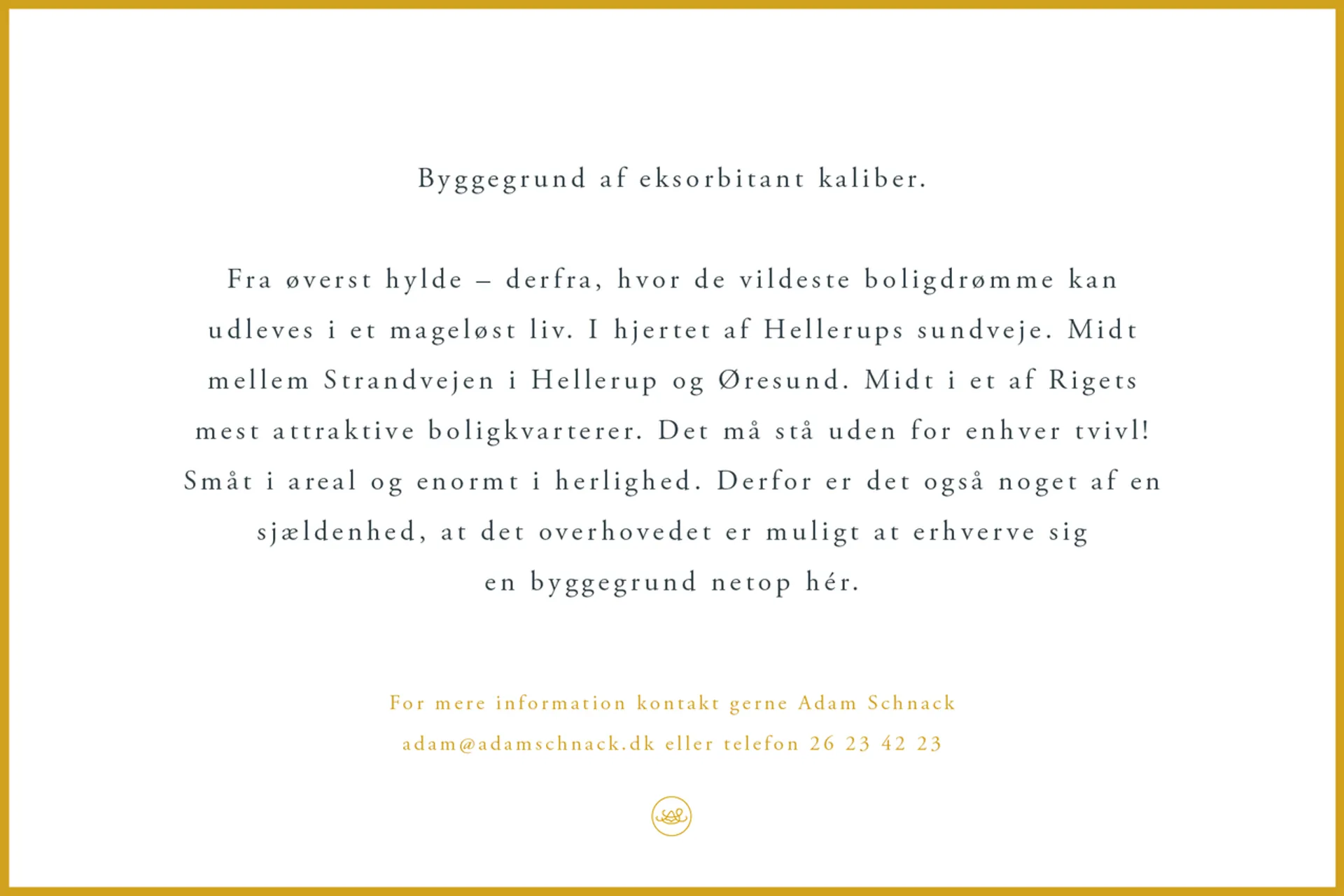 Byggegrund af eksorbitant kaliber. Fra øverst hylde – derfra, hvor de vildeste boligdrømme kan udleves i et mageløst liv. I hjertet af Hellerups sundveje. Midt mellem Strandvejen i Hellerup og Øresund. Midt i et af Rigets mest attraktive boligkvarterer. Det må stå uden for enhver tvivl! Derfor er det også noget af en sjældenhed, at det overhovedet er muligt at erhverve sig en byggegrund netop hér.