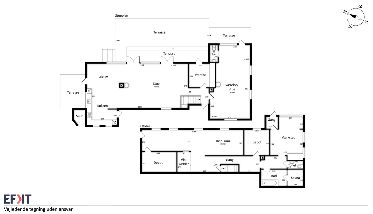 Huset strækker sig over 240 etagemeter (BBR: 132 m²) i to etager. Begge etager er spændende, og begge etager tilbyder noget særligt til huset. Det meget generøse stueplan med sine åbne rumligheder og fantastiske udsigt ud over det omkringliggende landskab, og underetagen, der er mere lukket, men absolut særdeles brugbar. Det ene rum er i dag indrettet som værksted med skøn udsigt og egen udgang til haveområdet.
