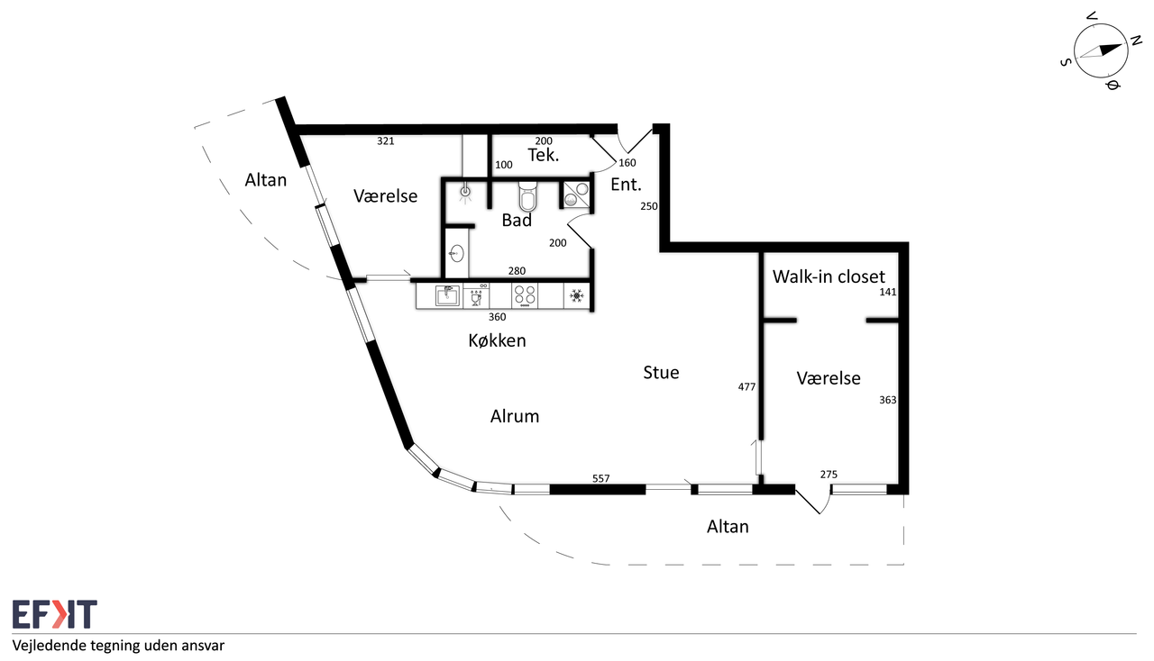 Elegant og meget eksklusivt. Veludnyttede kvadratmeter fordeler sig på et stort alrum med funktionelt indrettet køkken, spiseplads og opholdsstue i ét. Dertil kommer to soveværelser og et smagfuldt indrettet badeværelse med brus.
