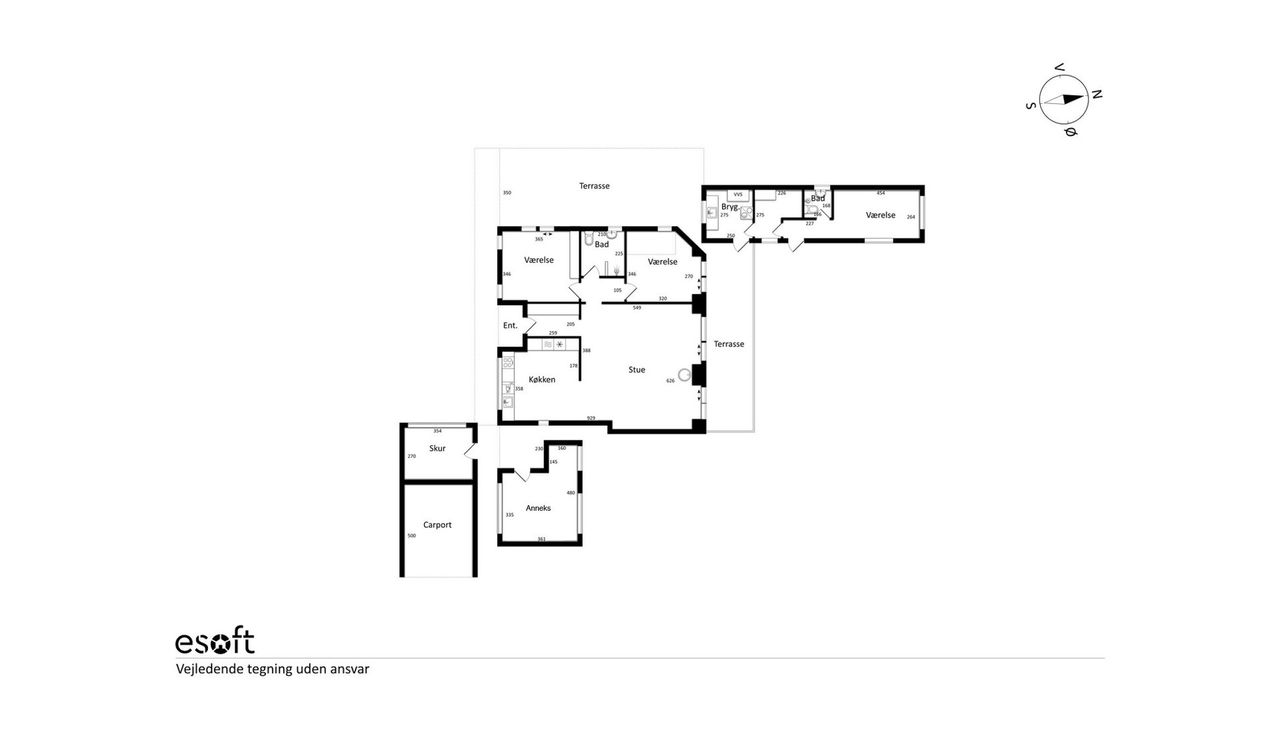 Indretning: Fra hovedhuset er der entré med garderobeplads til husets store alrum, som fordeler smagfuldt snedkerkøkken, spisestue og opholdsstue, med direkte udgang til den solbeskinnet terrasse og haven. Via fordelingsgang tilgås soveværelse med udgang til endnu et terrassemiljø, stilrent badeværelse og soveværelse - også med udgang til terrassen og haven. Sideliggende del af boligen er indrettet i selvstændig bygning, der indeholder tekøkken/bryggers, badeværelse og stort soveværelse/alrum. Herudover godt indrettet udhus og carport.