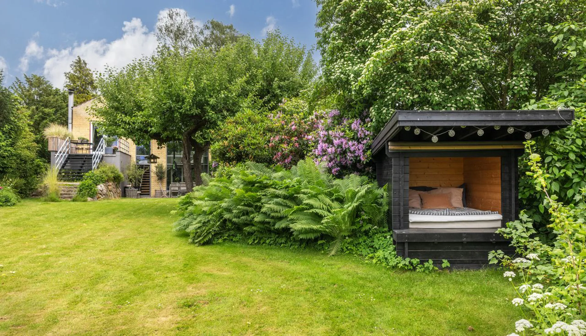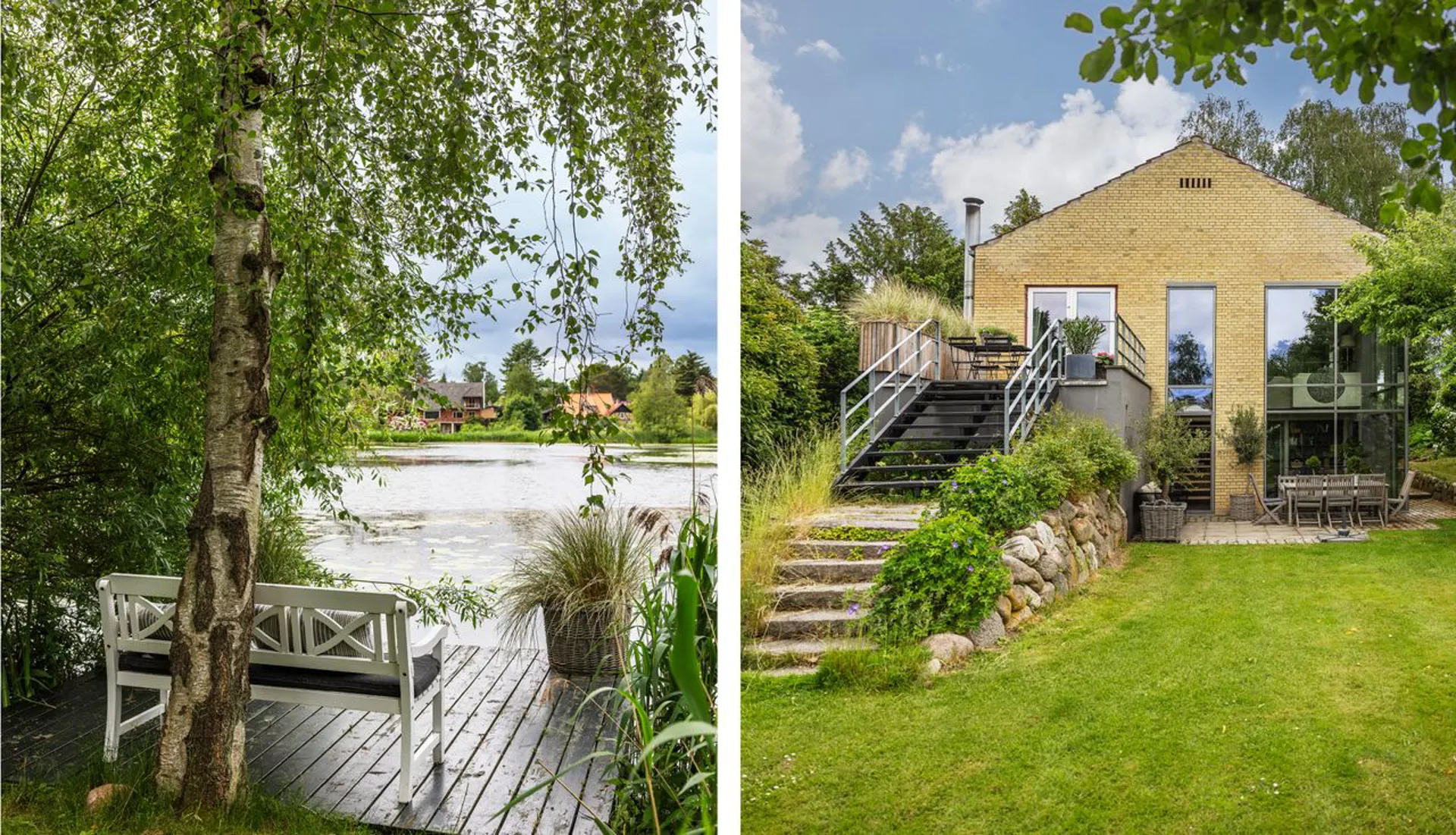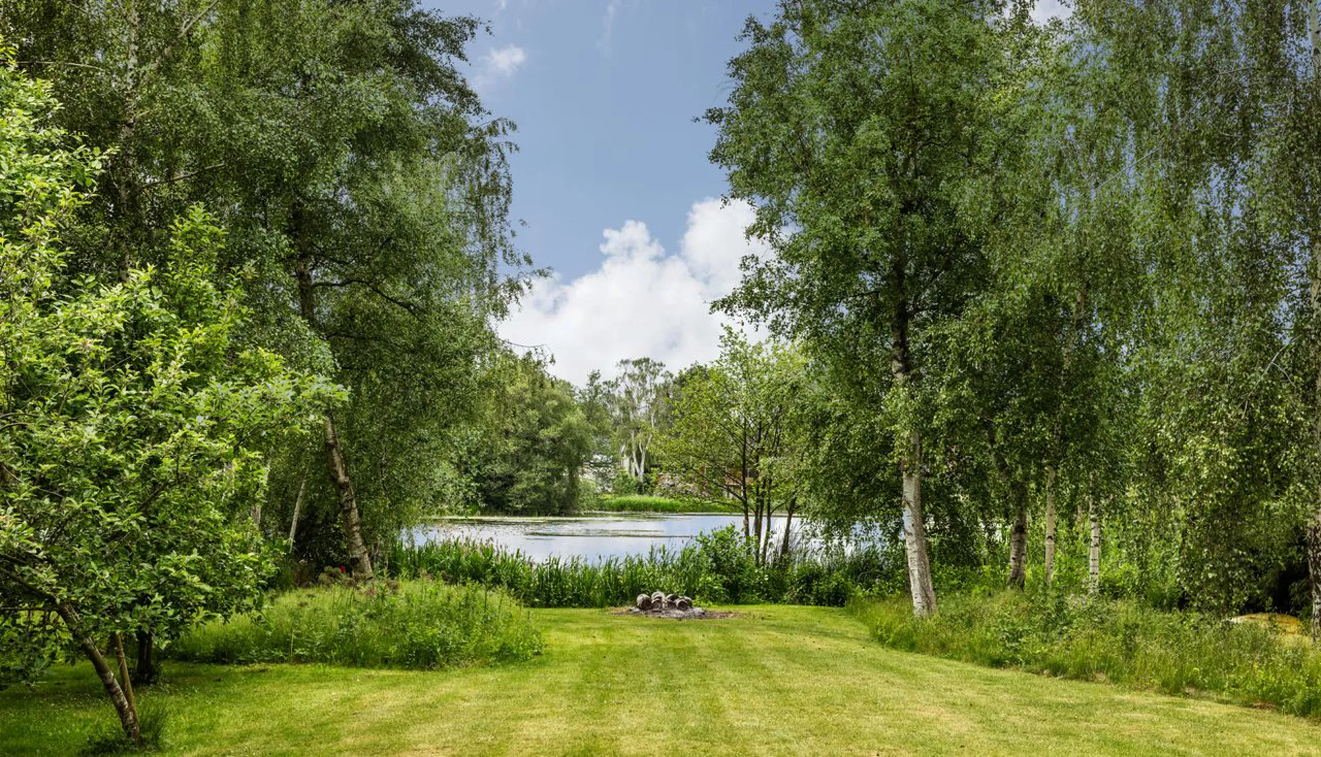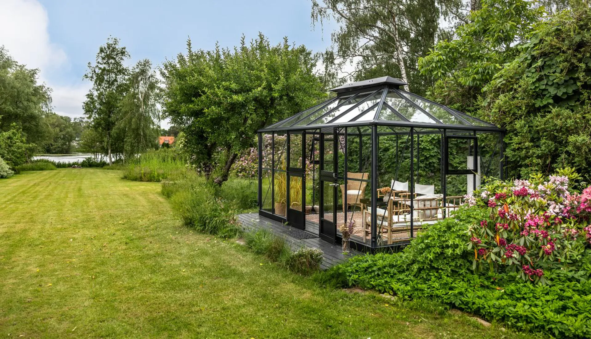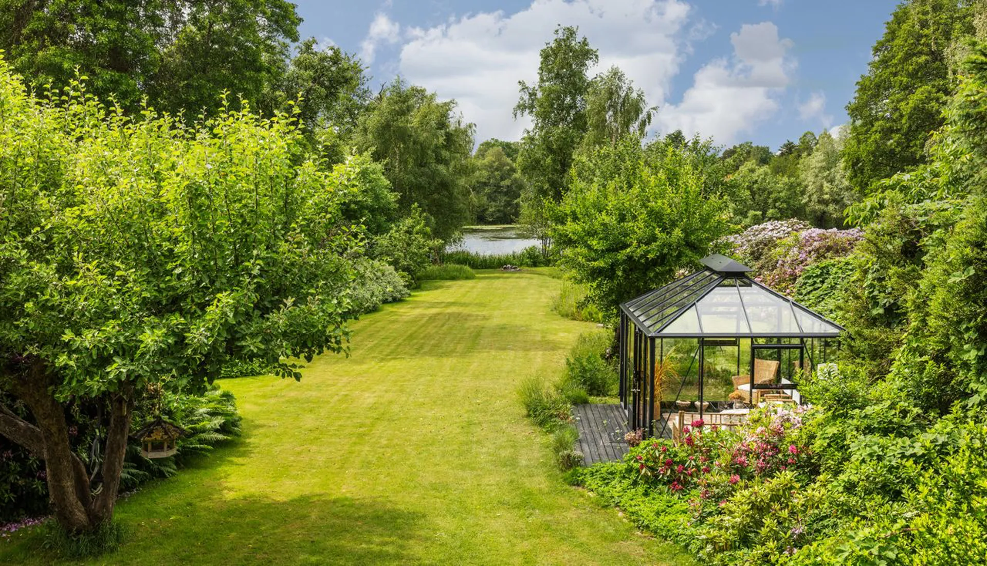 Ejendommen ligger på en ugenert 2.160 m2 stor grund afgrænset af smukke træer, generationsgamle rododendron, frugttræer, stauder og smukke roser på begge sider ned mod søen. Og får man lyst lidt større naturscenerier end den lille pittoreske mose, er både Furesø, Geelskov og Mølleådalen lige i nærheden. Det haveentusiastiske øje vil med det samme bemærke de smukt anlagte haverum, der udstrækker afstanden mellem boligen, og dens omkringliggende terrasseområder, og søbredden, der er smukt markeret med sine slanke siv, bregner og åkander. Et skønt orangeri og en niche med et shelter bryder taktfast det lange ugenerede kig ned gennem grunden.
