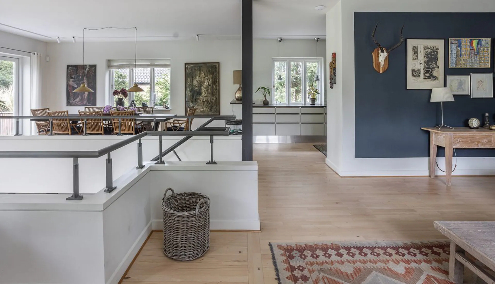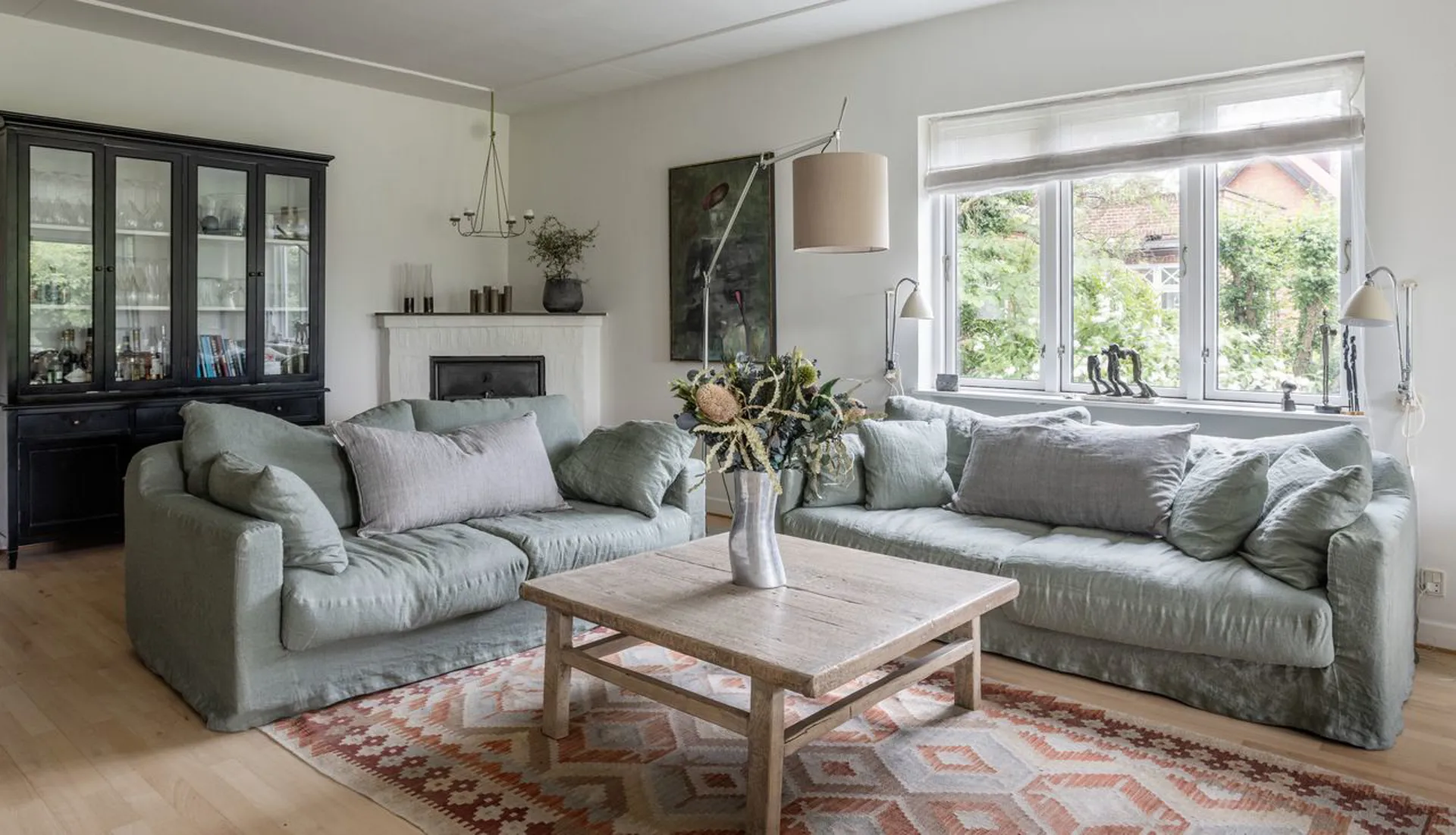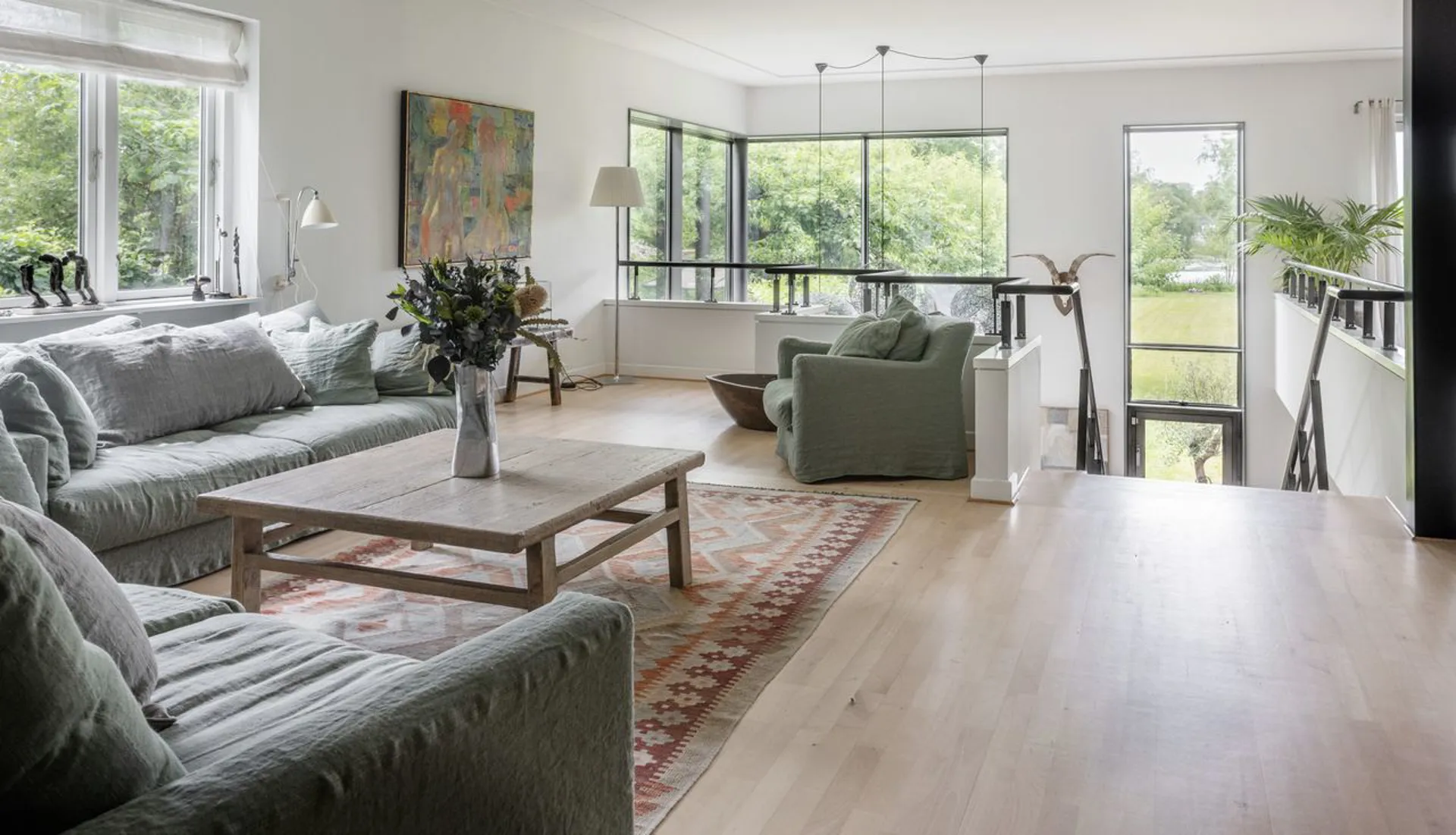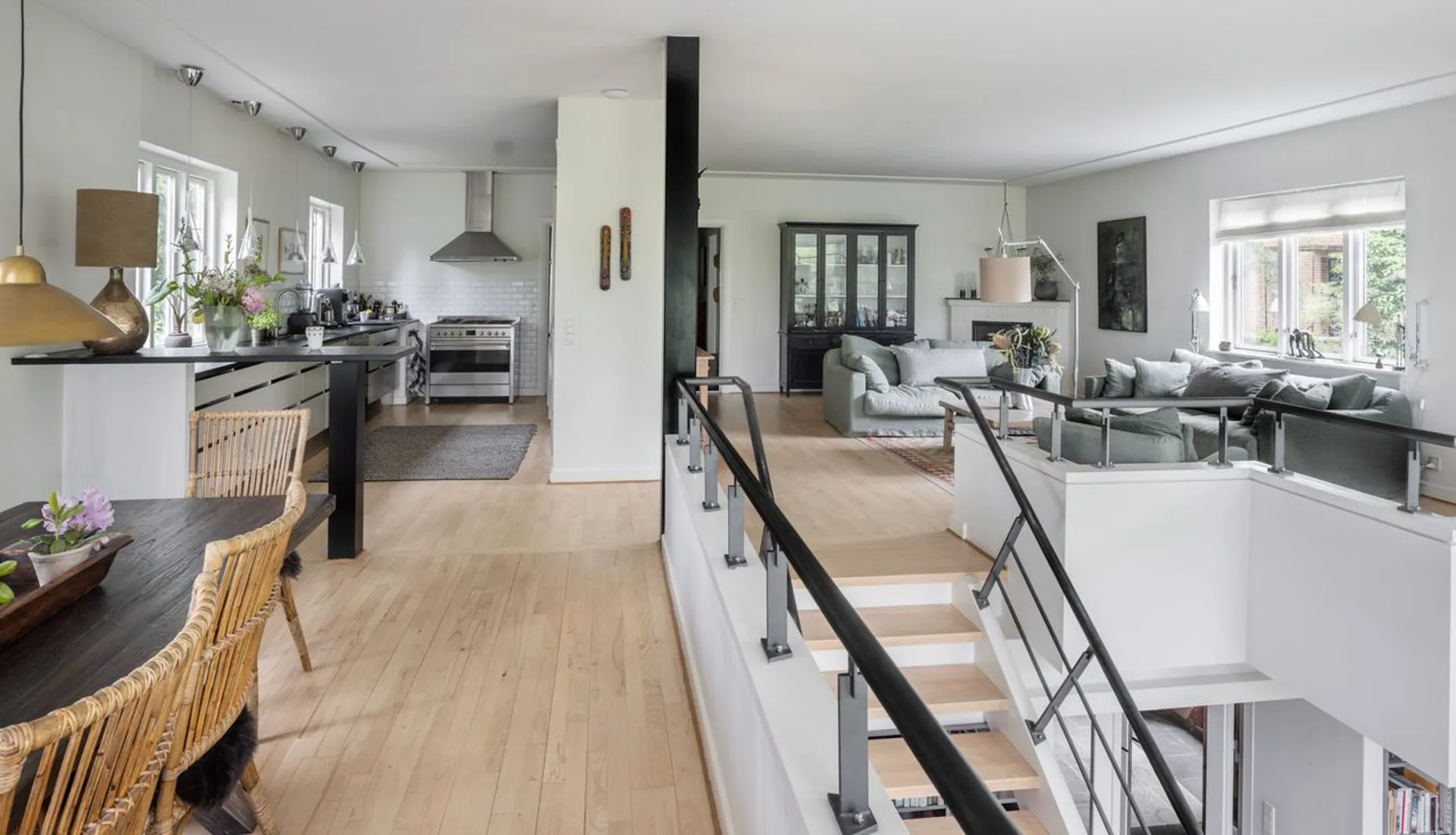Køkkenet er gedigent og moderne, og den rummelige opholdsstue har en muret pejs. Gulvet i stueetagen er massive plankegulve, mens kælderetagen har et flot stengulv med store klinker. Og sådan er det hele vejen rundt i denne ekstraordinære bolig. Faktisk er huset gennemgående udtryk for god smag med et væld af ikke tilfældigt valgte kvalitetsløsninger. Alt virker i balance - som om, at det ikke kunne være anderledes.