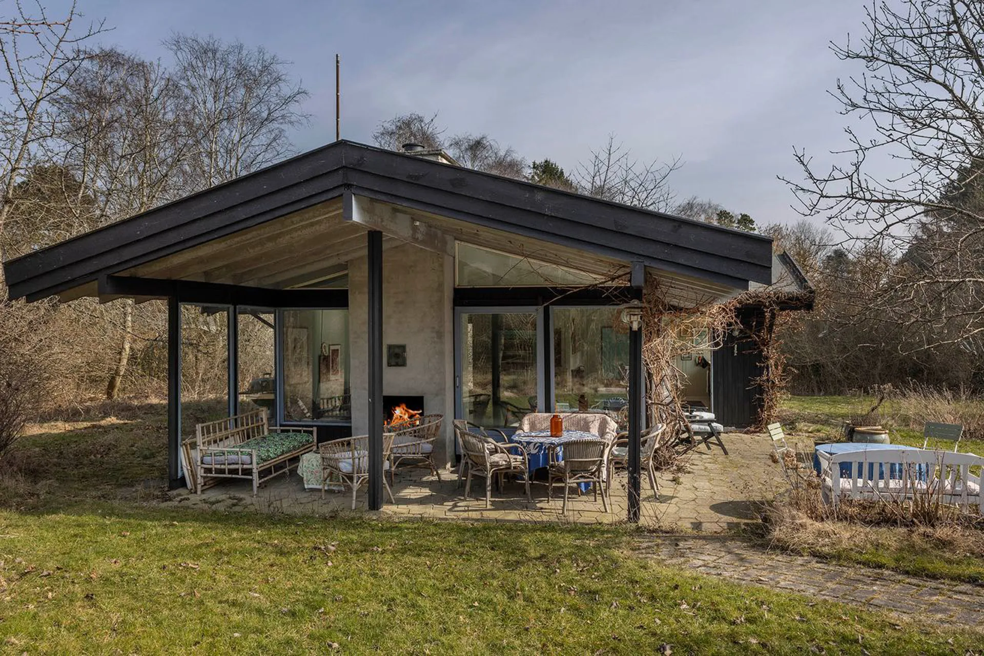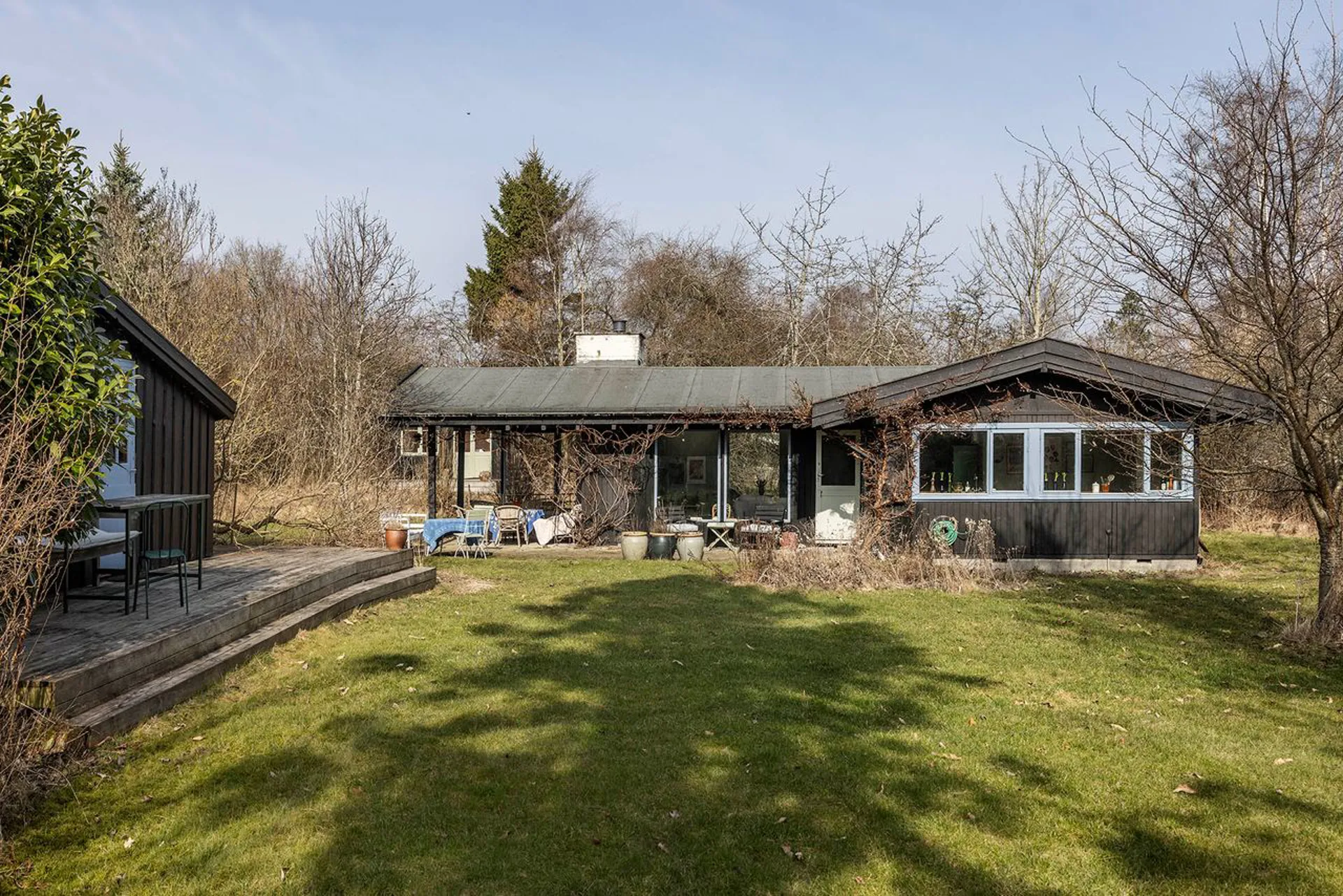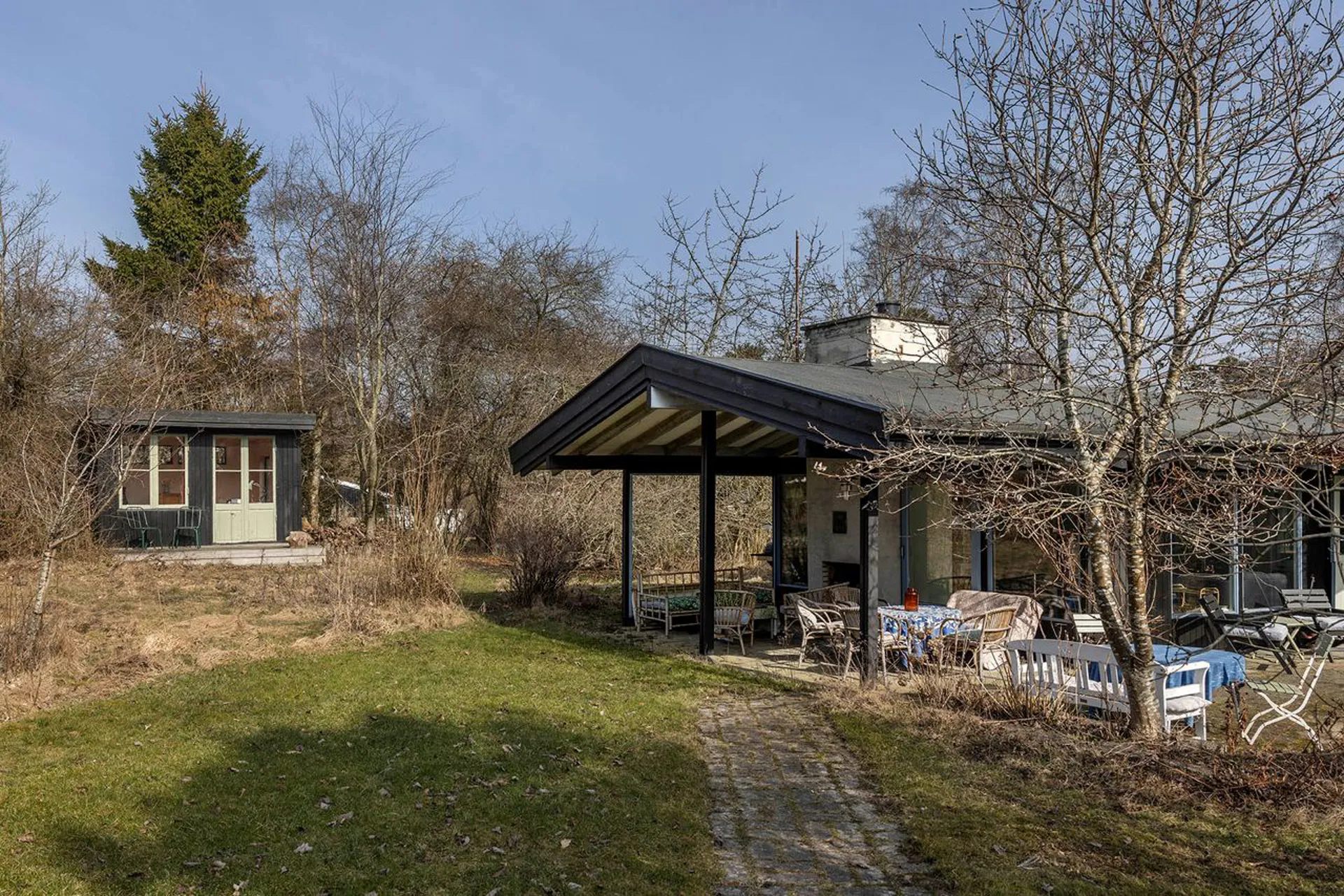Hovedhuset på 64 m² (BBR) er opført i 1971 og fremstår i dag med en sjælden sans for den enkle, nordiske sommerhusæstetik. Hjertet er det store alrum med brændeovn og udgang til overdækket terrasseområde med pejs(!) beliggende en suite med køkkenalrum, hvorfra der er udgang til sydvendt terrasseområde, der lægger sig som overgang til skønt have område. Herfra flyder inde- og udeliv naturligt sammen.