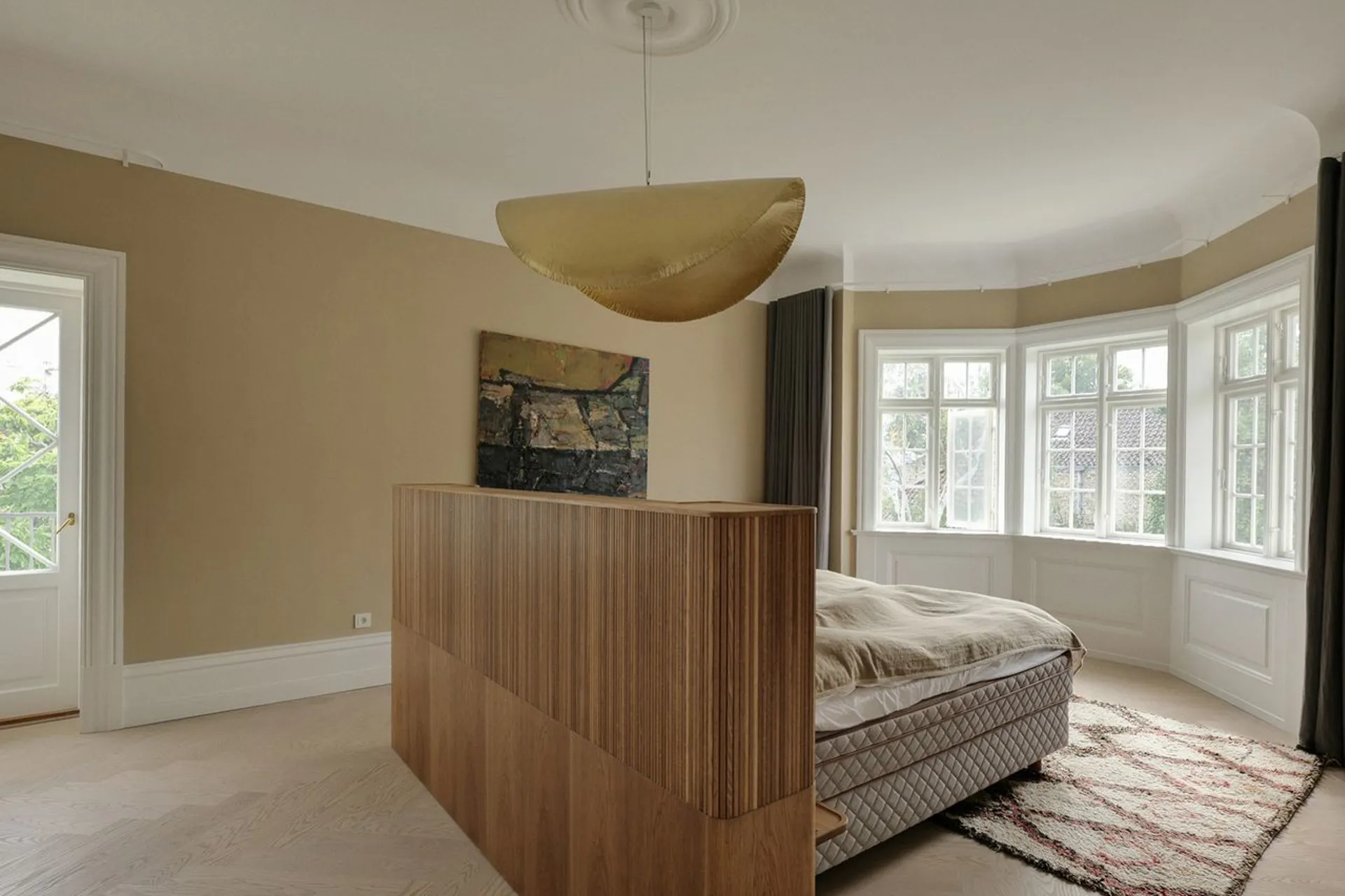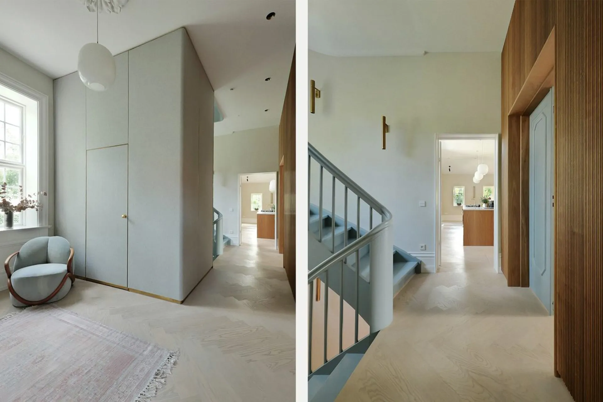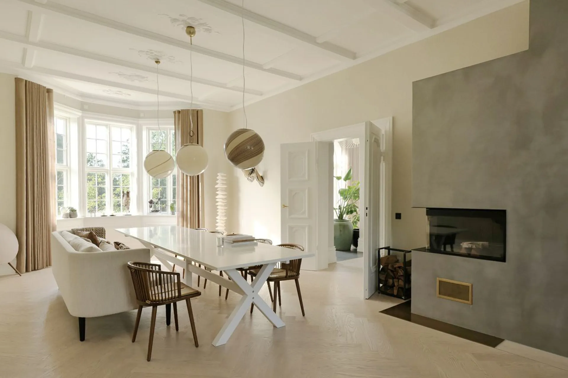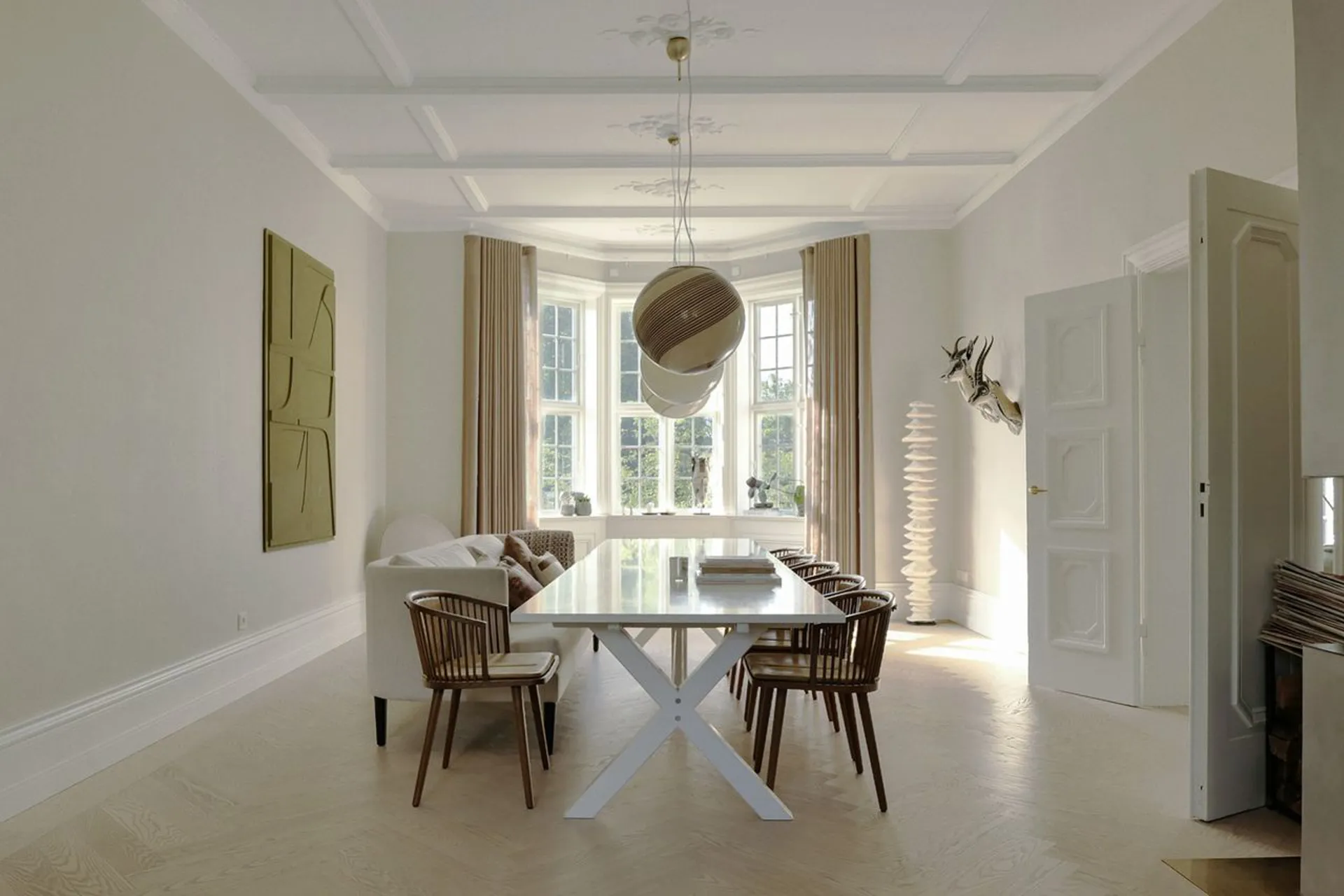 Sublimt i enhver detalje og en lektion i, hvordan man lykkes med at skabe et naturligt flow igennem en stor historisk villa uden at ofre bygningens oprindelige idé. Det ene rum inviterer til det næste, og fra hvert et hjørne og hvert et opholdssted i huset er der skønne lysindfald og kig igennem husets rumligheder.