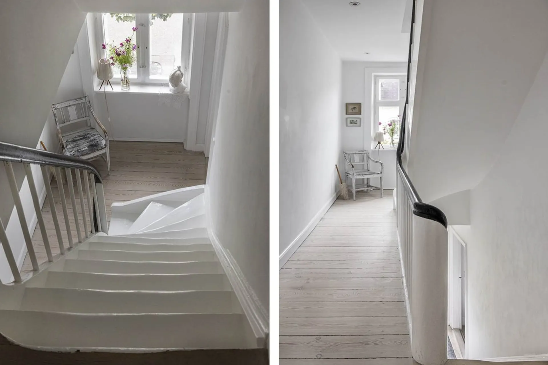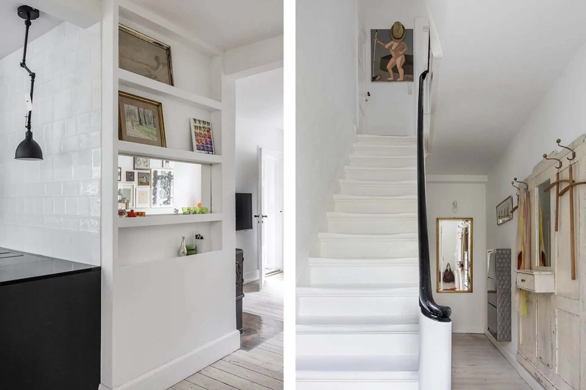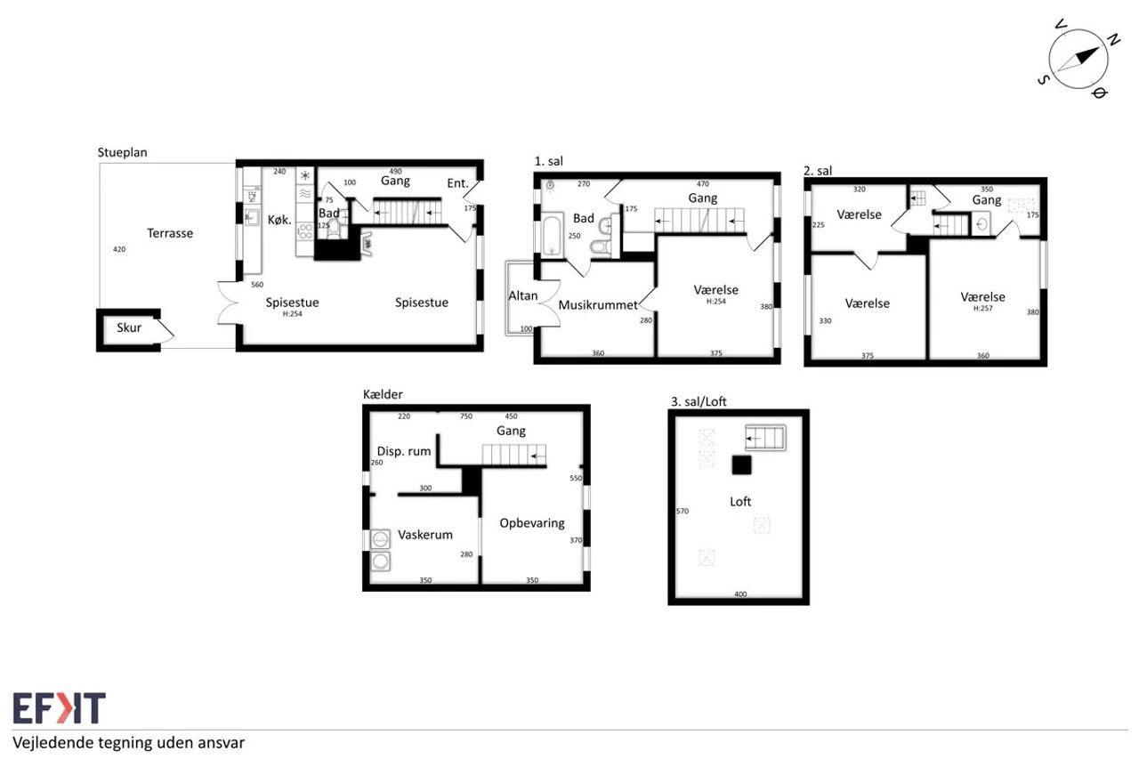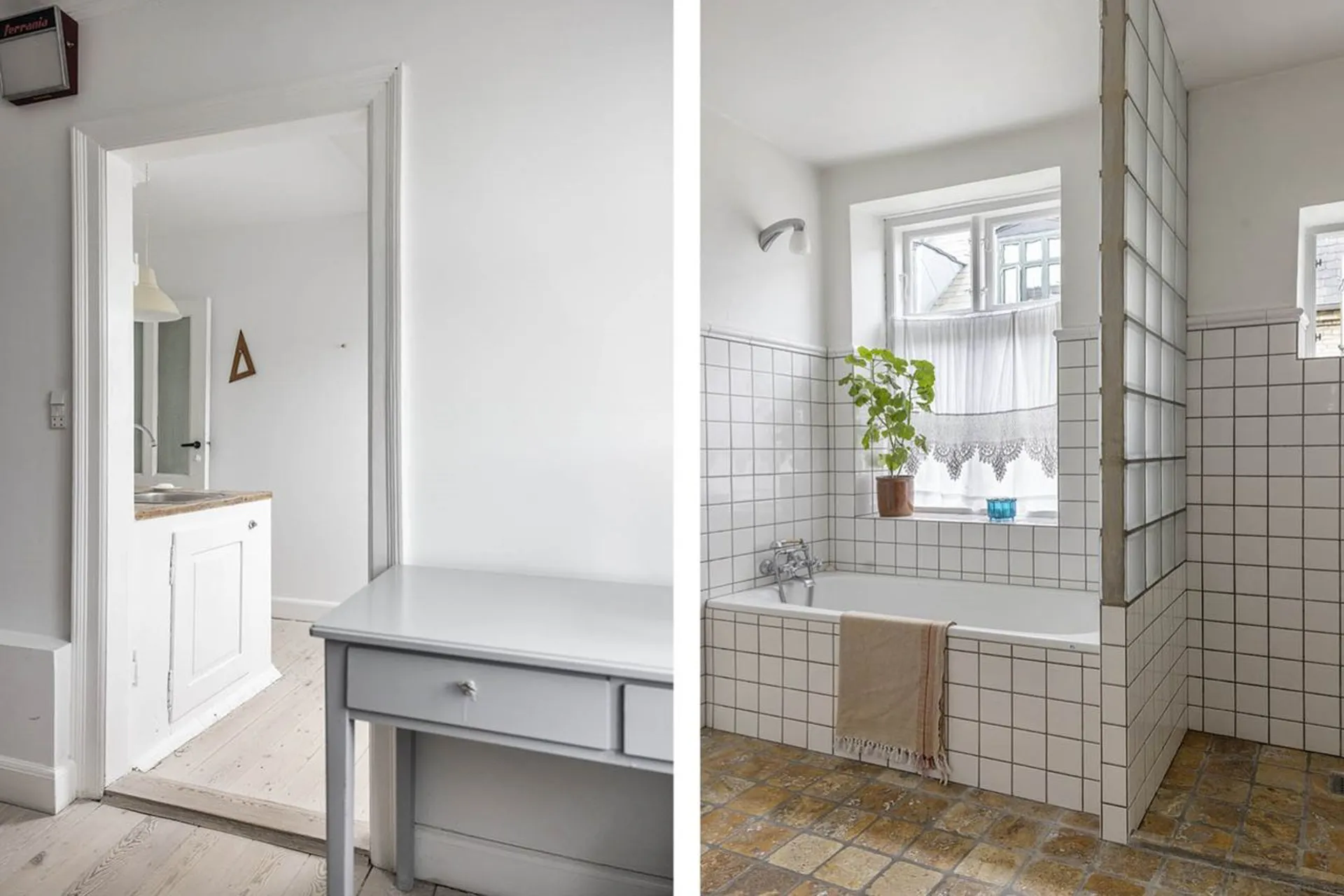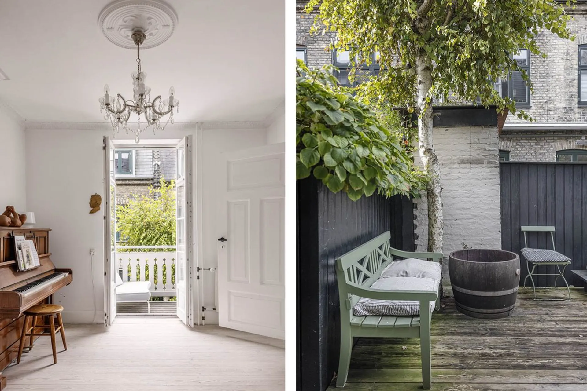 Indretning: Entré til stort alrum, der fordeler smagfuldt og funktionelt indrettet køkken og opholdsstue med brændeovn. Fra køkkenet er der udgang til den skønneste gårdhave med eftermiddags- og tidlig aftensol. På stueetagen er der yderligere disponeret et gæstetoilet. 1. salen er indrettet med to skønne værelser/stuer - det ene er indrettet som musikværelse/opholdsstue med udgang til altan og adgang til badeværelse med kar, det andet har vinduer ud mod de charmerende facader på den anden side af rækken. På 2. salen er der indrettet tre soveværelser, sådan som huset oprindeligt er disponeret. Det er oplagt at lade denne rumfordeling bestå og muligt at åbne op til kip, og på den måde få inddraget husets 3. sal/loftareal ved at åbne op til kip og dermed skabe en endnu mere storslået overetage.