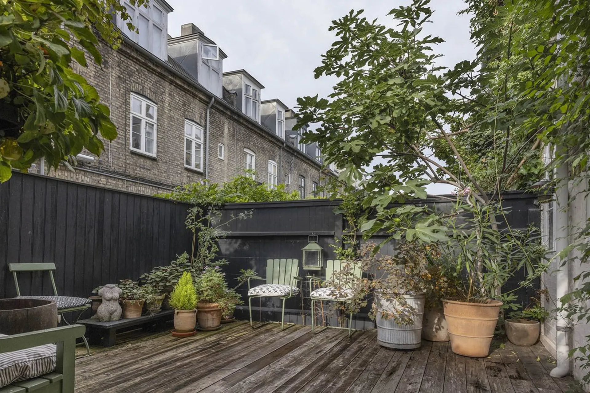 Den omkringliggende gårdhave, med udgang fra køkkenalrummet mod vest og fra entréen mod øst, er anlagt med æbletræ, fignetræ, roser og slyngplanter, akkompagneret med fint anlagte blomsterbede, der blomstrer fra tidligt forår til sent efterår. Et udemiljø af en særlig kaliber, der giver en naturlig bevægelse fra inde til ude. Et miljø, der med sine fine referencer hylder kvarterets fortællinger, hvor havens æbletræ fortæller om dengang, der var æbleplantage på stedet.