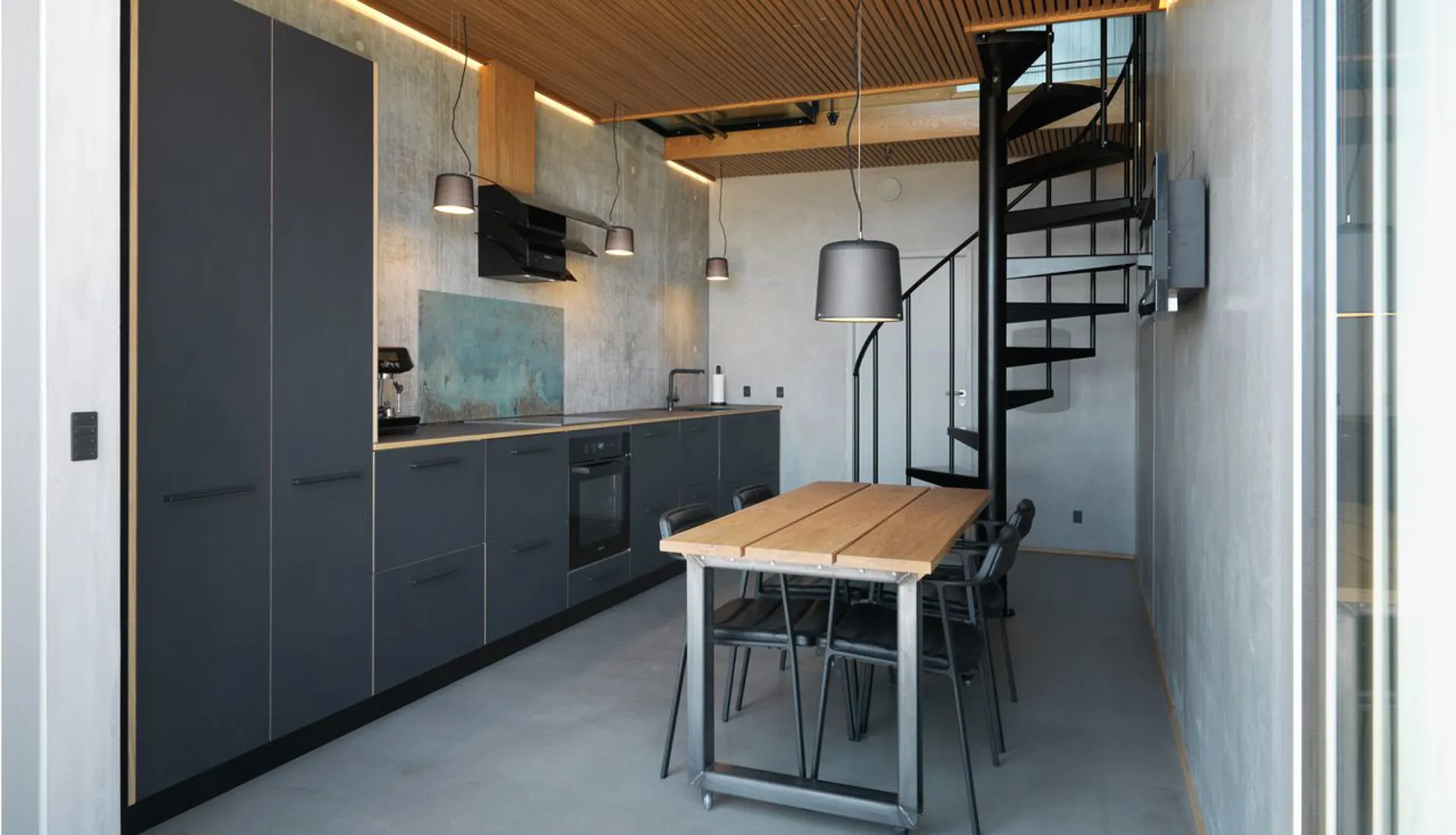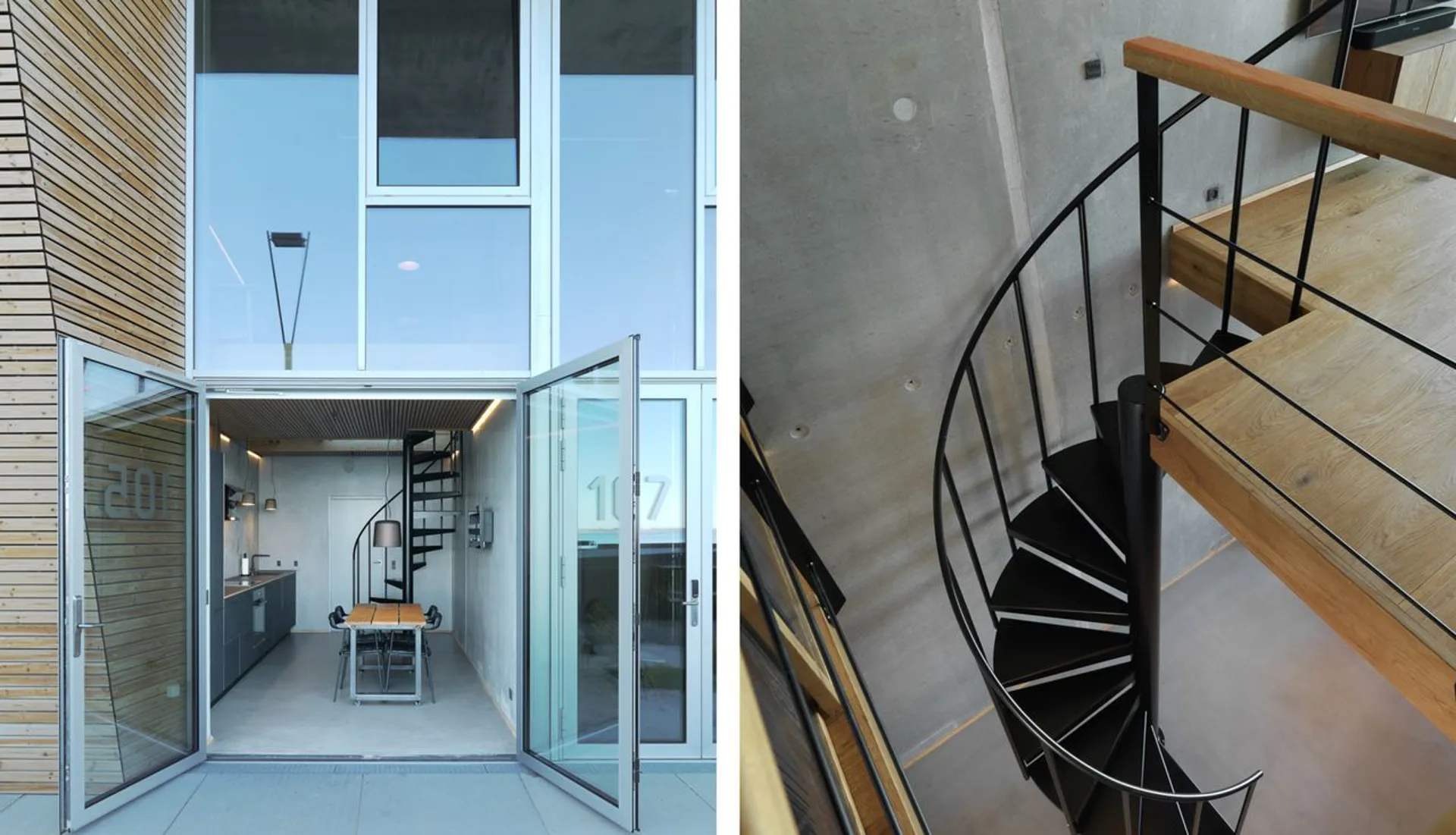 Vindeltrappen og de håndlavede løsninger – herunder den glasplade, der giver et kig ned til stueetagen – er vidnesbyrd om en opmærksomhed på håndværk og detaljer, der gennemsyrer hele boligen. Det gælder f.eks. den specialbyggede, komfortable seng i Dinesen-planker og poleret betongulv med gulvvarme og indbyggede LED-lys.
