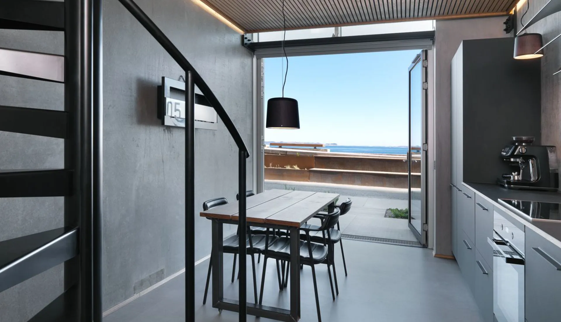 De franske døre åbner sig ud mod himmel og hav som en inviterende favn, og lige udenfor har du dit eget lille område - som en mini-terrasse – hvor du kan placere et skrivebord i dagtimerne og arbejde under åben himmel eller et spisebord, hvor I kan nyde aftensmad med udsigt til bugten.