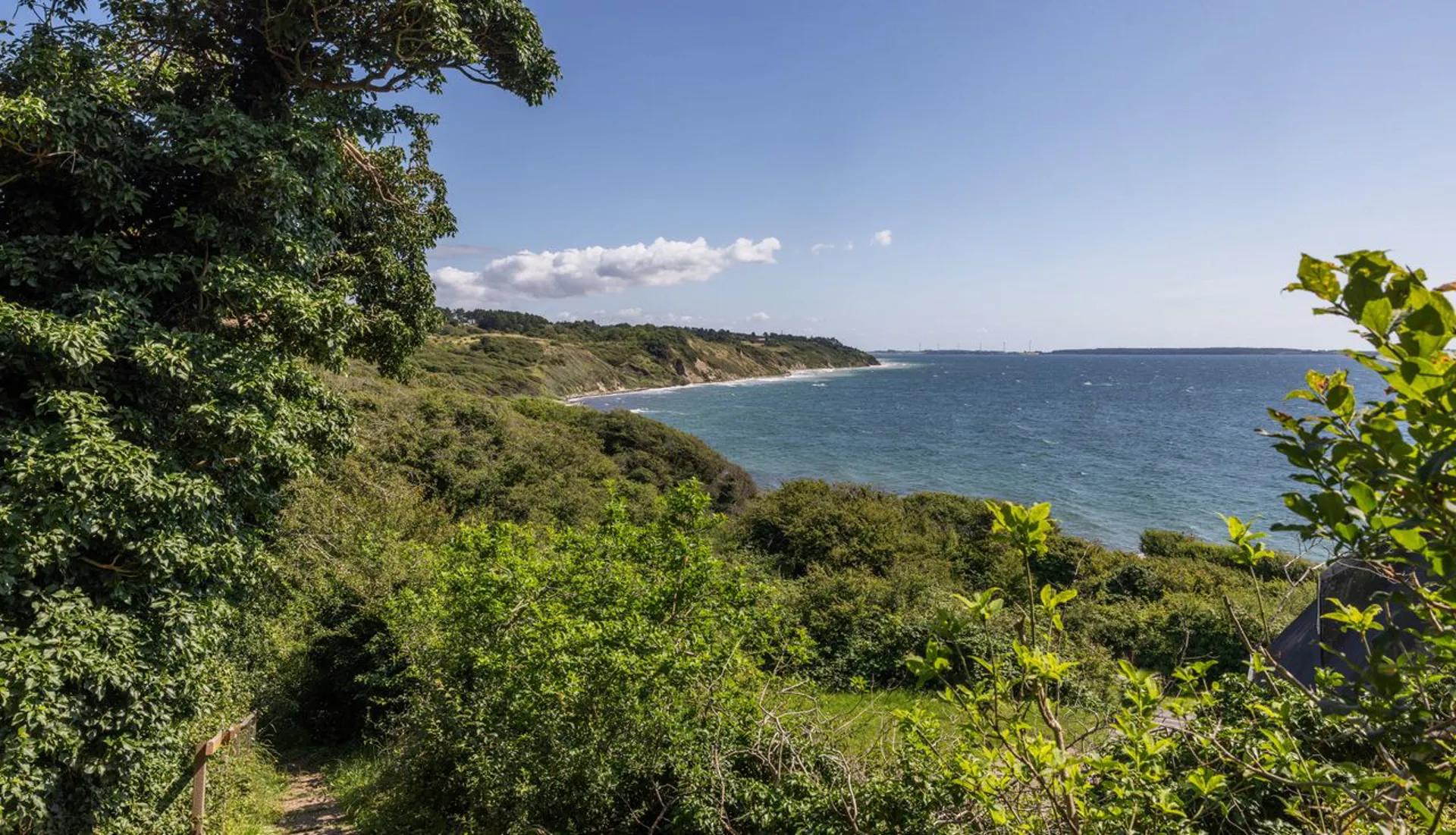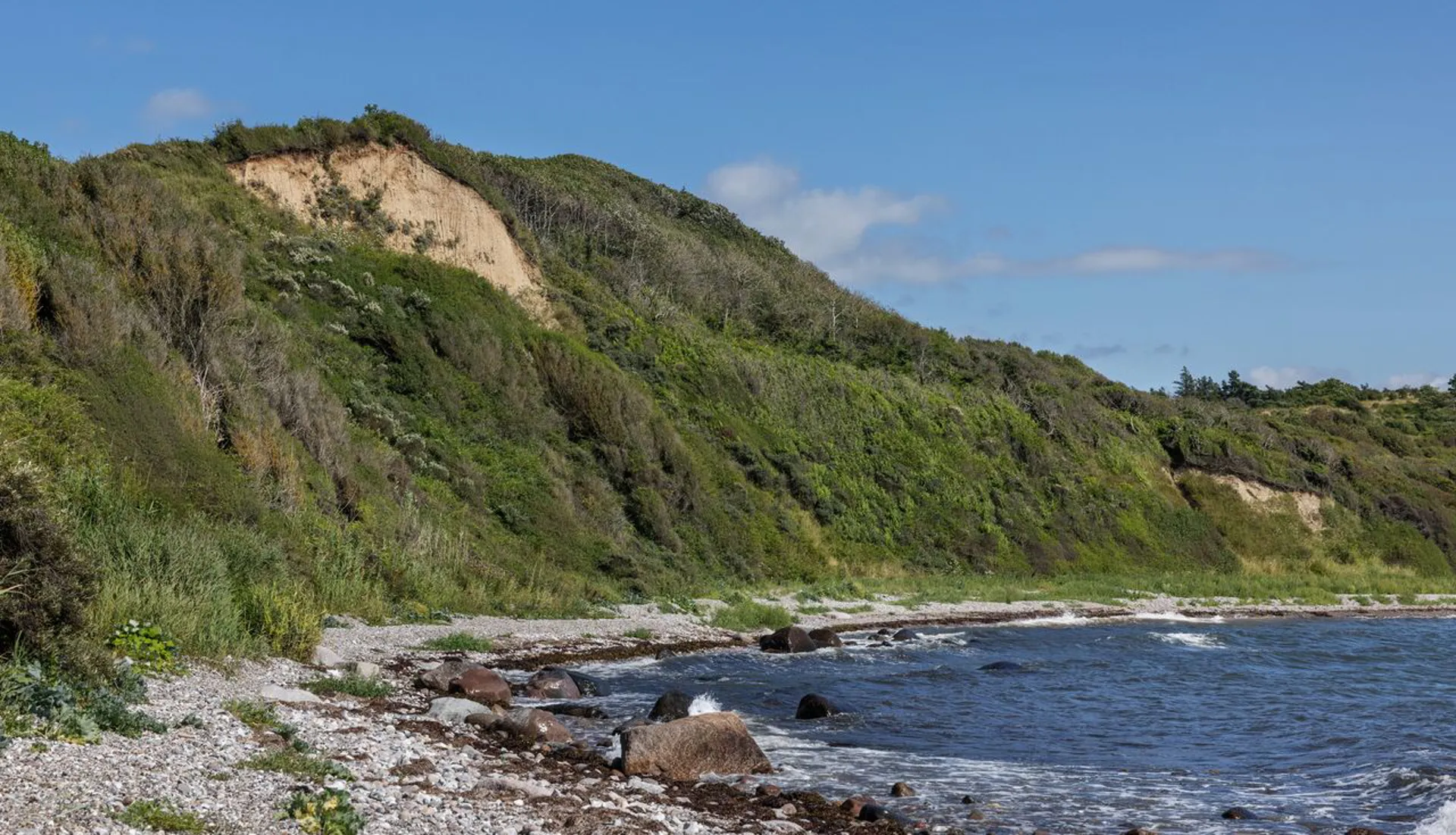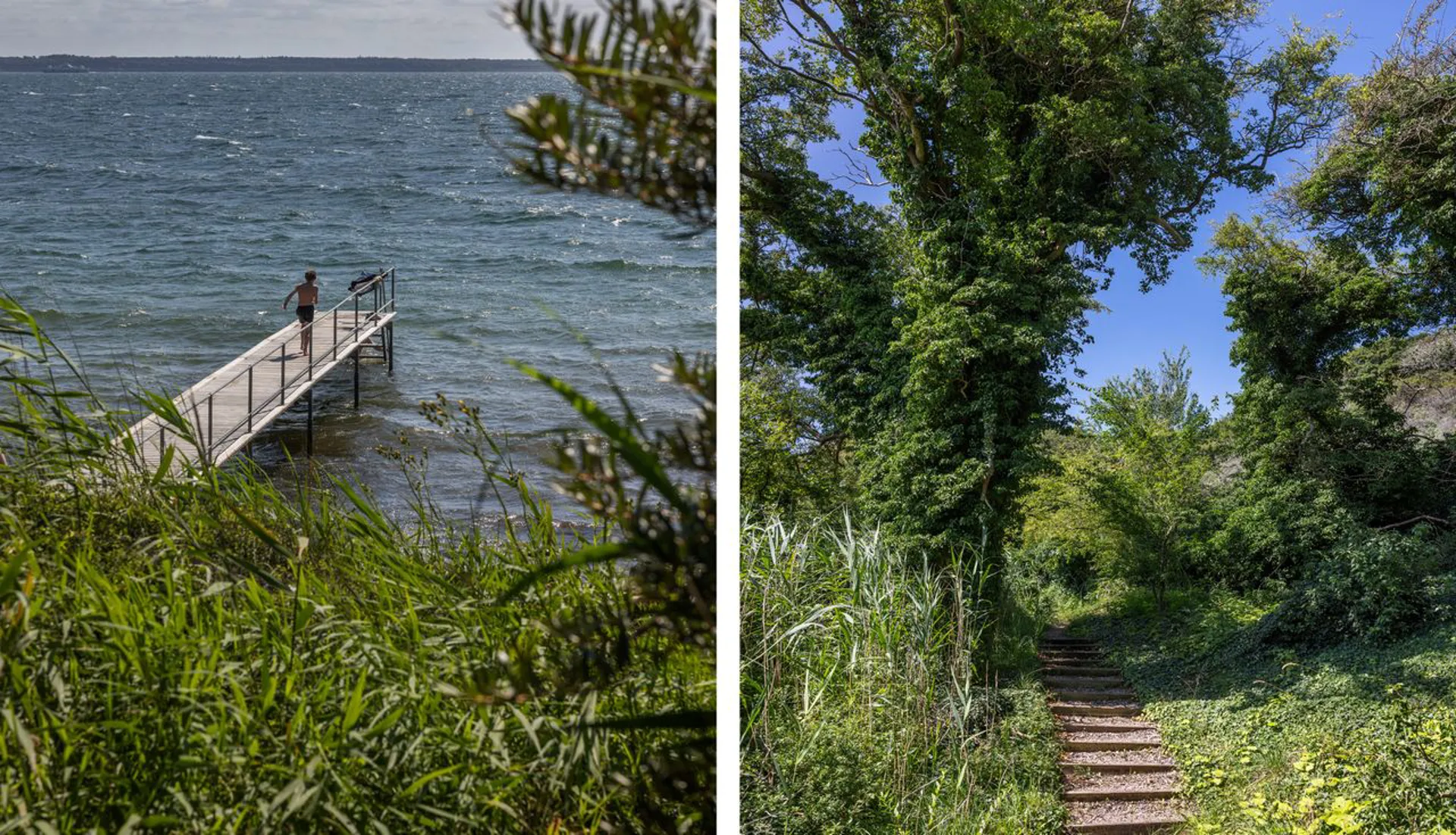 Blot 3 minutters gang gennem en uforlignelig natur kommer man ned til stranden og badebroen, som indbyder til en frisk dukkert i det dejlige og klare vand.