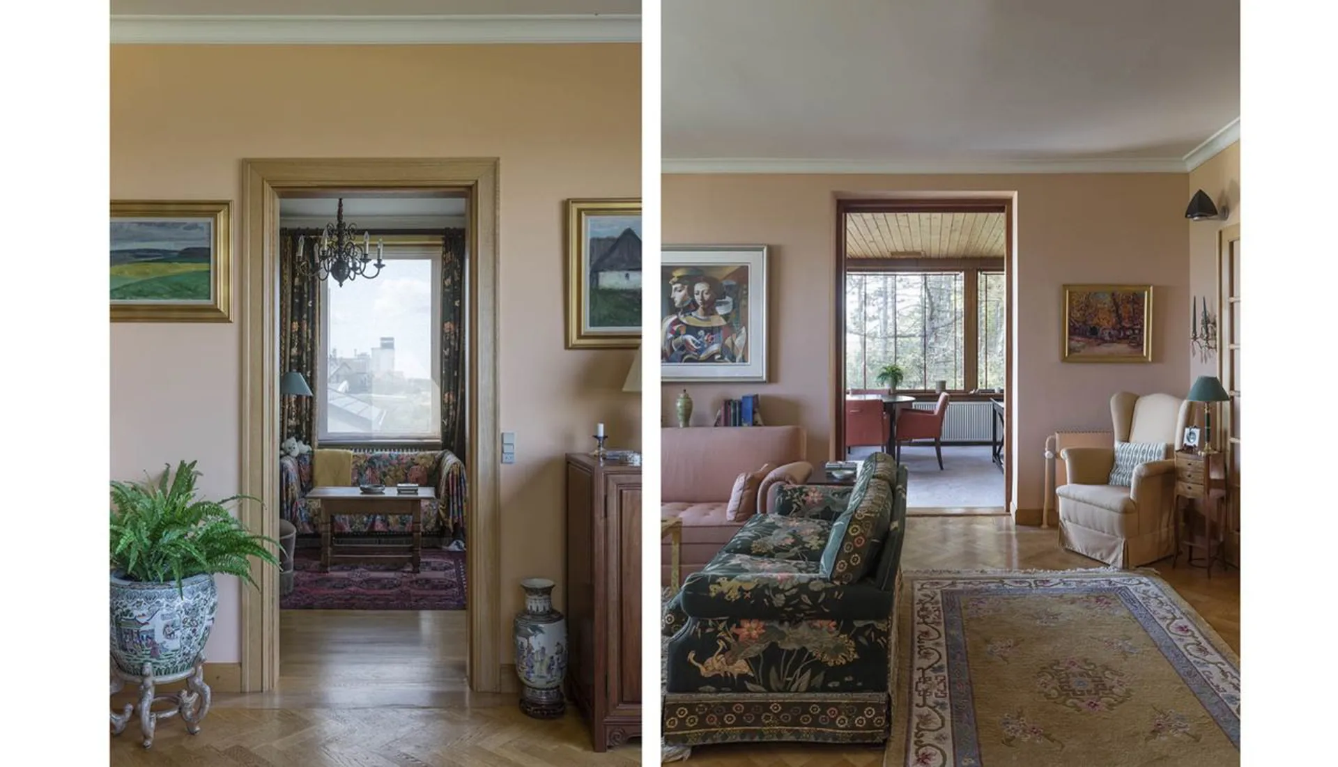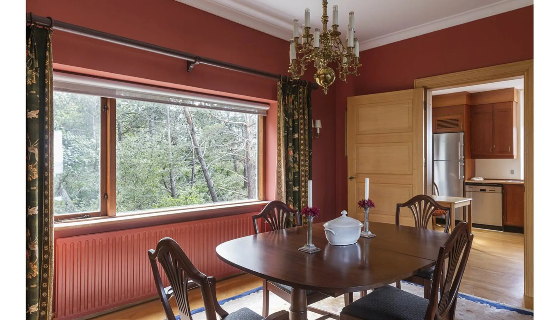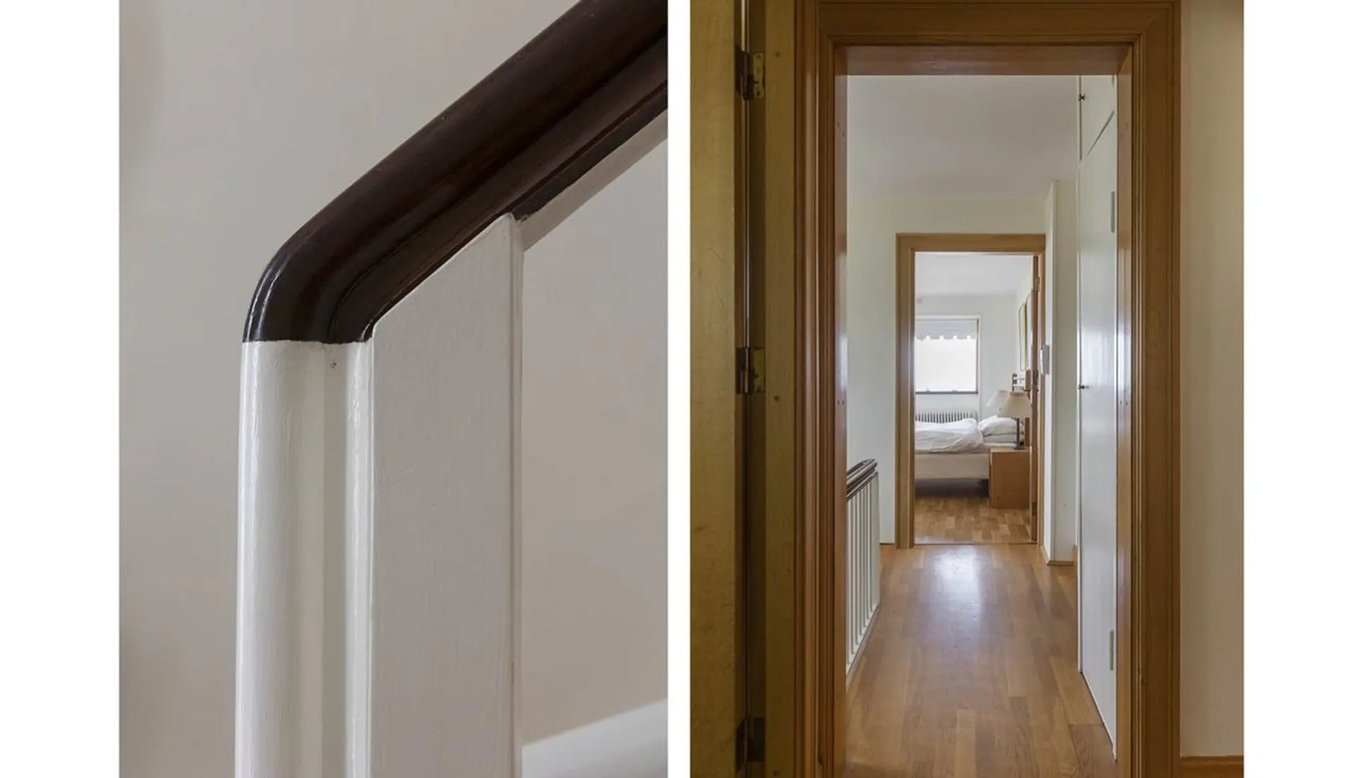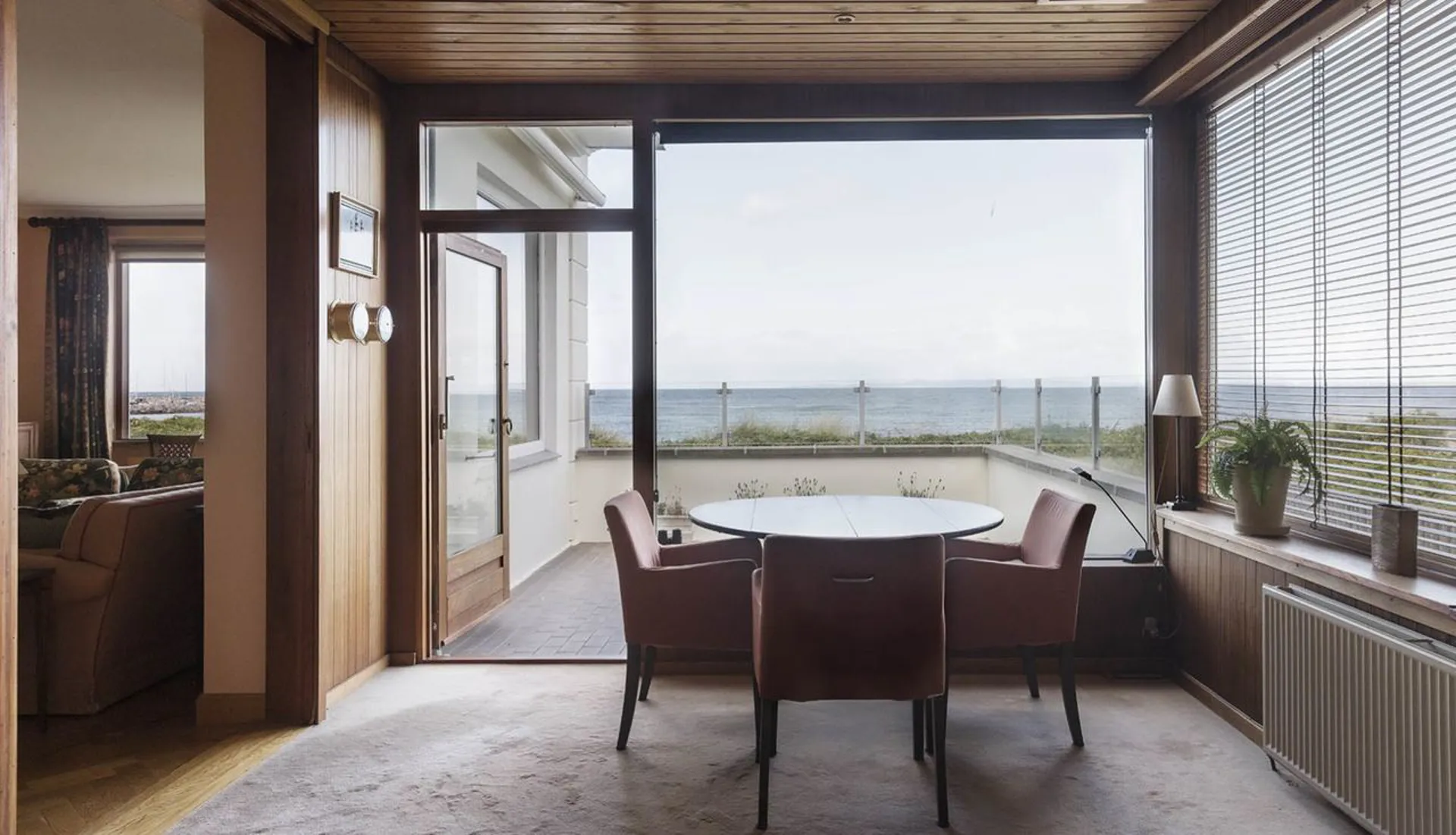 Indretning: Entré med trappe til husets stueetage og underetage. Fra gangen i stueetagen er der til den ene side adgang til et værelse mod syd, som ligger i åben forbindelse med den store pejsestue med panoramavinduer mod vandet. Til den anden side er der adgang til toilet og køkken, som ligger i åben forbindelse med spisestuen. Herfra er der åbnet op til den store stue med pejs. Fra stuen er der udgang til stor terrasse. Hér er der både udsigt til den omkringliggende skov, stranden og havet mod nord. 1. salen fordeler fire store værelser, der alle har udgang til altan – det ene med udgang til to altaner. Desuden stort badeværelse og toilet. Underetagen byder på seks disponible rum og stort badeværelse/bryggers med sauna. Dertil nyere opført garage på 34 m2 med elektronisk port og plads til to biler.