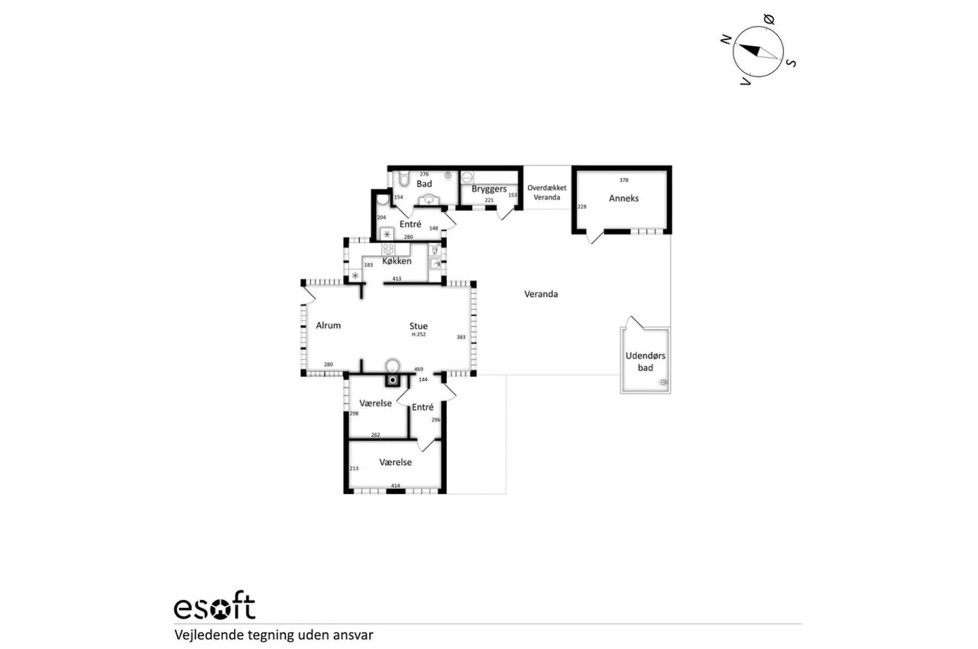 Indretning: Entré, hvorfra der er adgang til to hyggelige soveværelser og husets alrum, der fordeler opholdsstue og spisestue. Sideliggende veldisponeret køkken til entré, med udgang til stort sydvendt terrasseområde og badeværelse med brus. Fra terrassen er der adgang til bryggers, overdækket veranda og hyggeligt anneks, hvor der kan indrettes flere sovepladser.