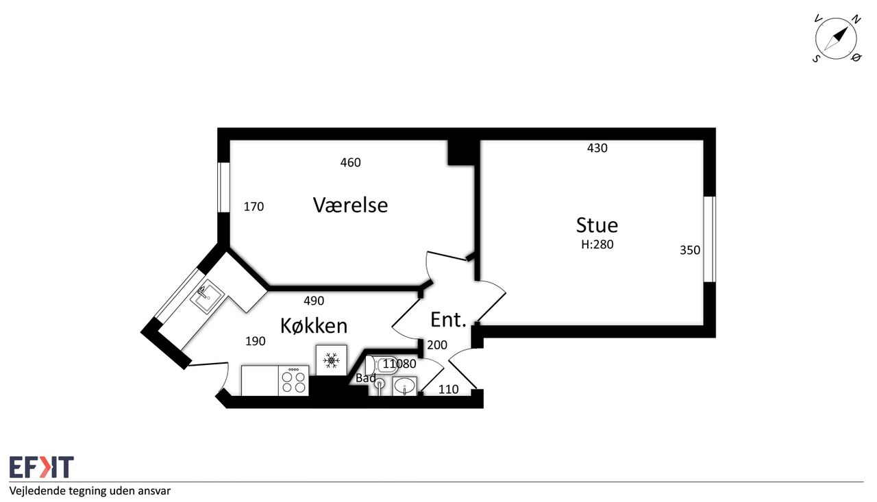 Boligens plantegning fordeler entré til funktionelt indrettet køkken og 2 værelser/stuer, hvilket gør den til en suveræn delelejlighed og ideel til parret eller singlen. Desuden badeværelse.