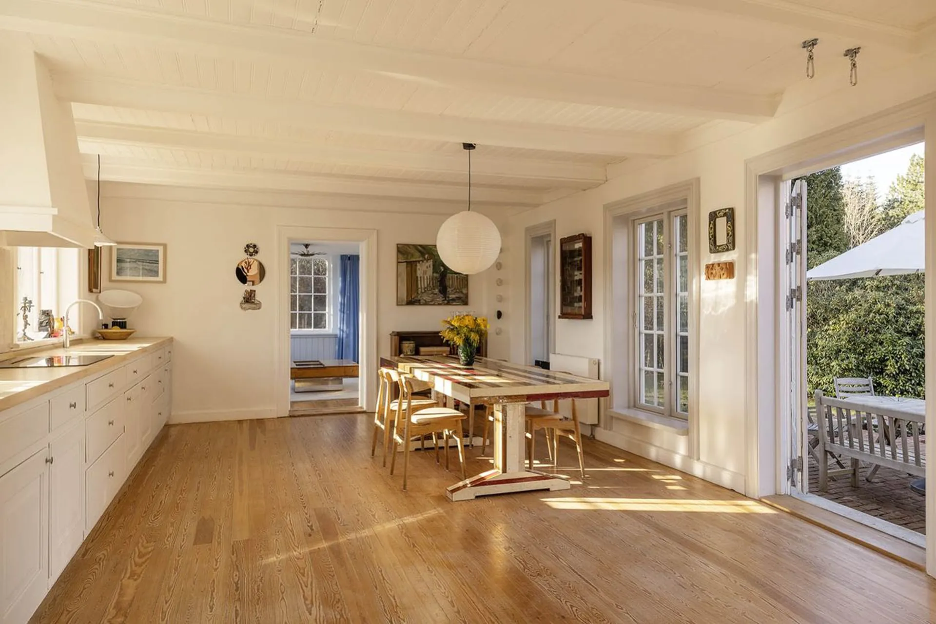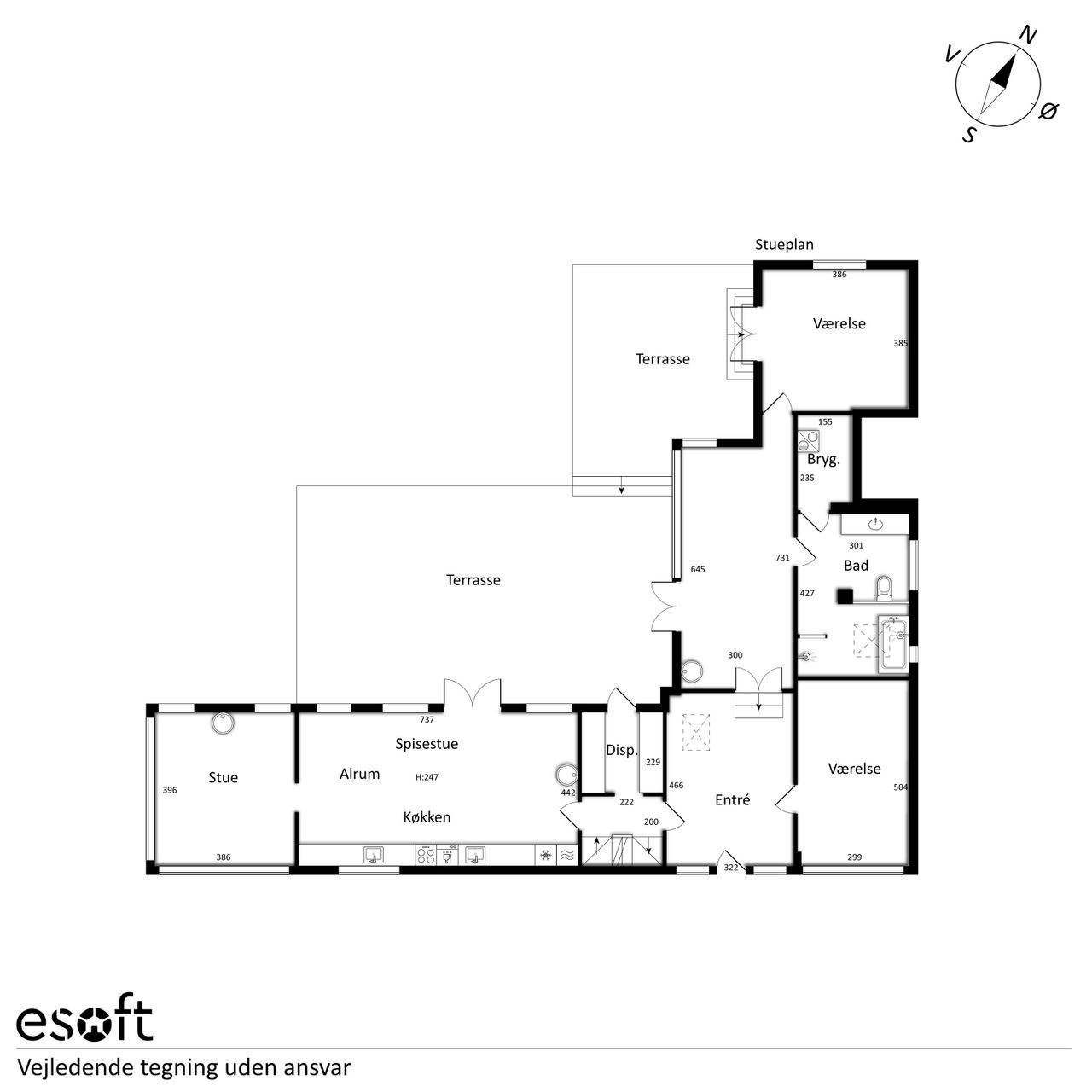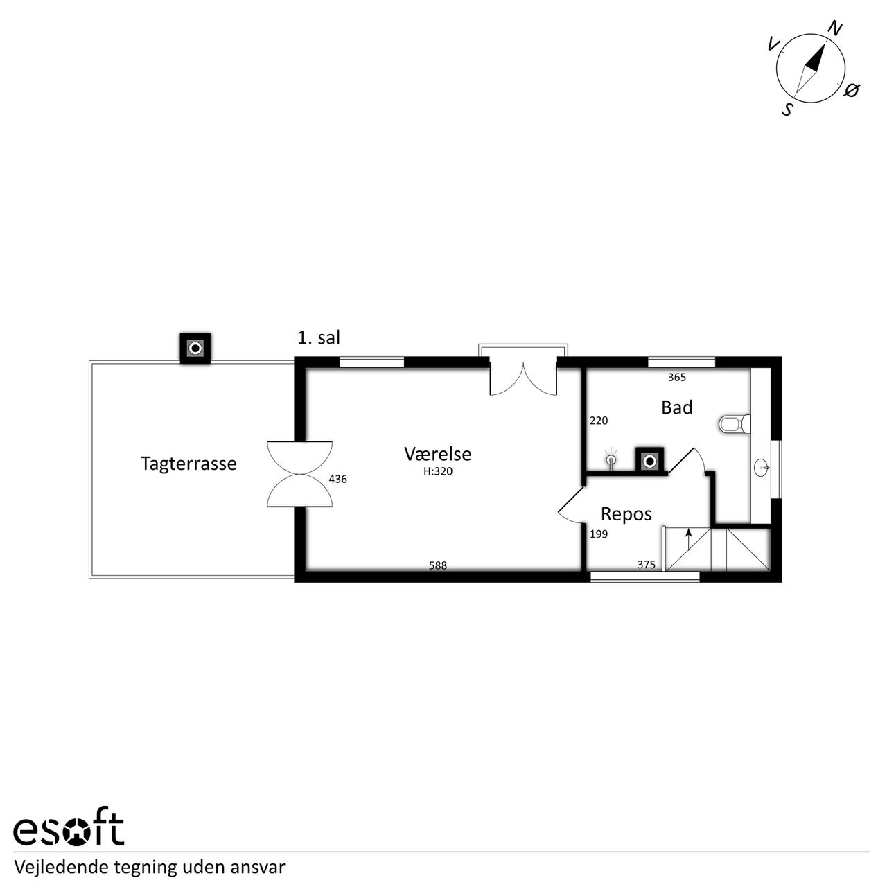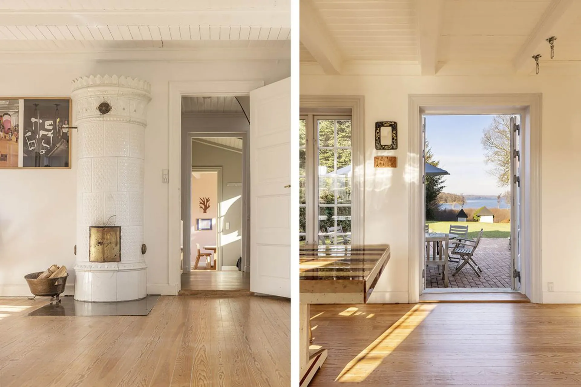 Stor lys entre med gennemgående kig gennem stueetagens to længer. Fra entre gang til børneværelse, mellemstue med vinduer fra gulv til loft, badeværelse og kontor/børneværelse. Fra entre til modsatte længe, værelse i dag indrettet som walk-in, alrum med stort funktionelt indrettet køkken og et magisk udkig, der sætter lyset dagsordenen - og en tilstødende stue. På 1.salen findes stort forældresoveværelse/master bedroom med udgang til stor terrasse og badeværelse. Foran ejendommen er der lagt en smuk rødstensterrasse. Haven er et mekka af plantning! Her er der plads til leg, ro og nydelse, fester og store middagsselskaber for flere generationer. Midt på grunden, ned mod søen, står i dag to små "badehuse" som trænger til en kærlig hånd - men får de det, vil de helt afgjort fuldende grundens, i forvejen ekstraordinære indbydende, udelivs indretning. Fortsætter man videre ned mod søen, gennem et mindre skovareal, findes der to bådebroer, som deles af fire ejendomme. Her kan man have sin båd eller kajak liggende og svømme en tur i den rene sø. Et enestående sted, tæt på natur og kultur, tæt på indkøb, daginstitutioner, skoler og en kun en køretur fra København.