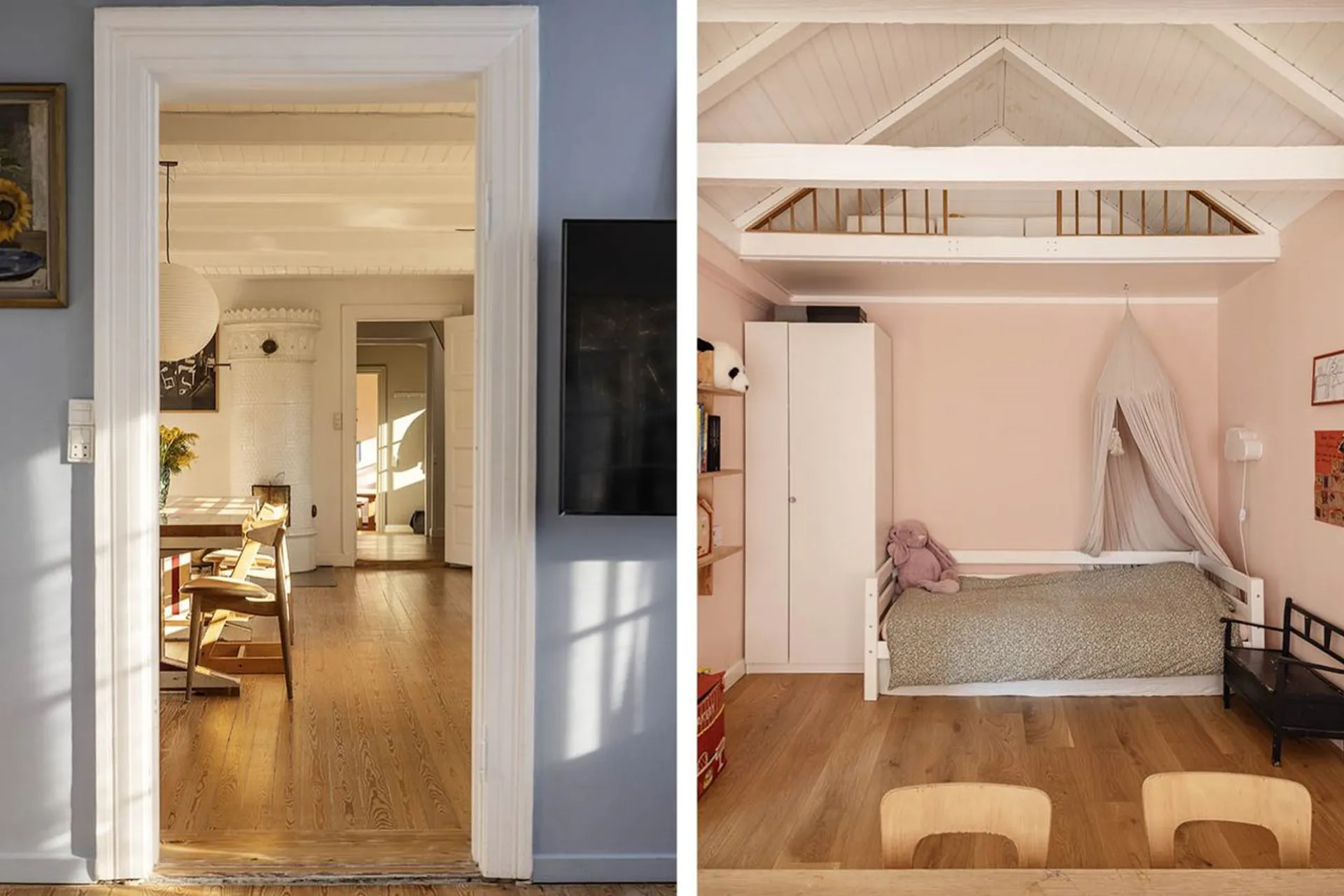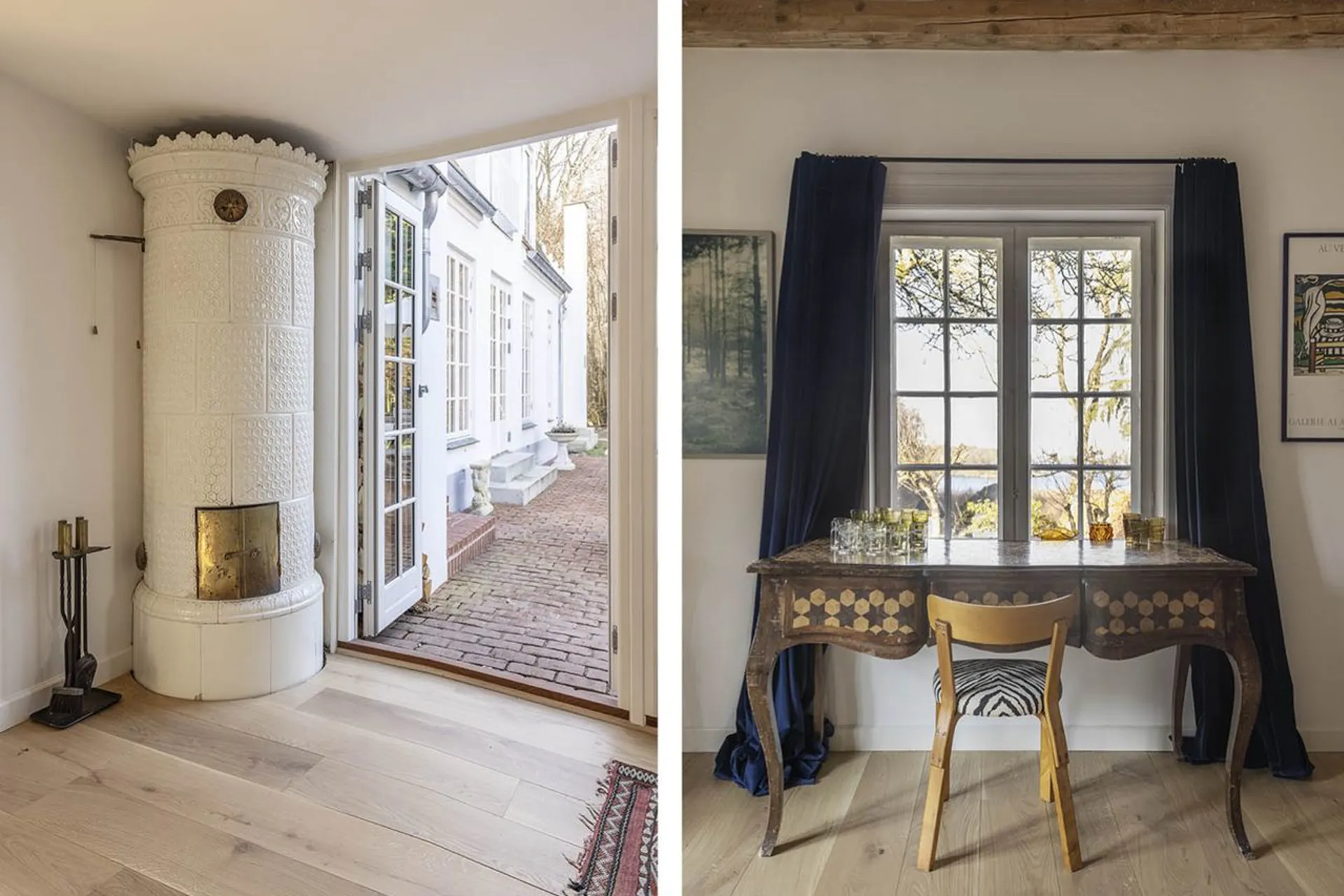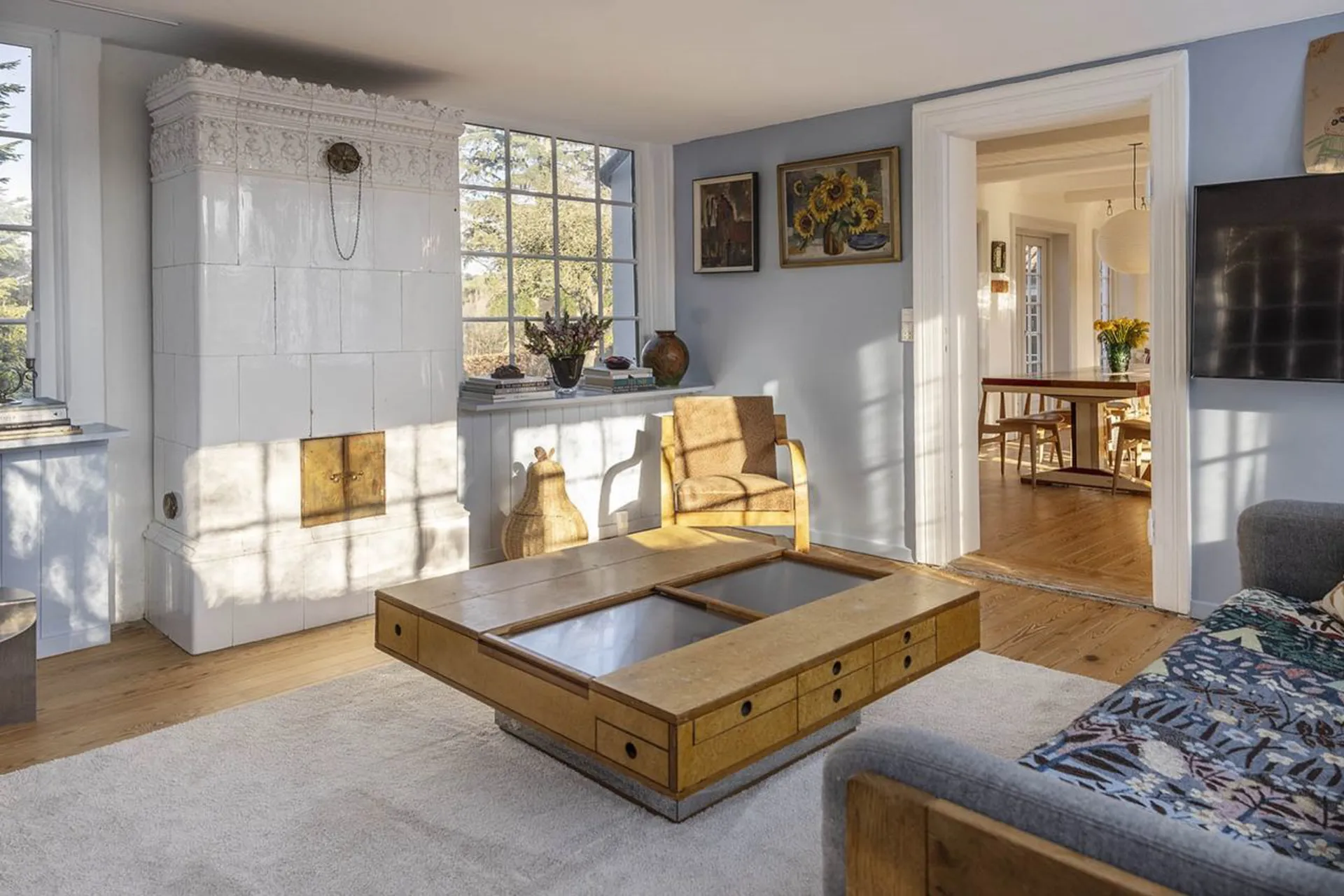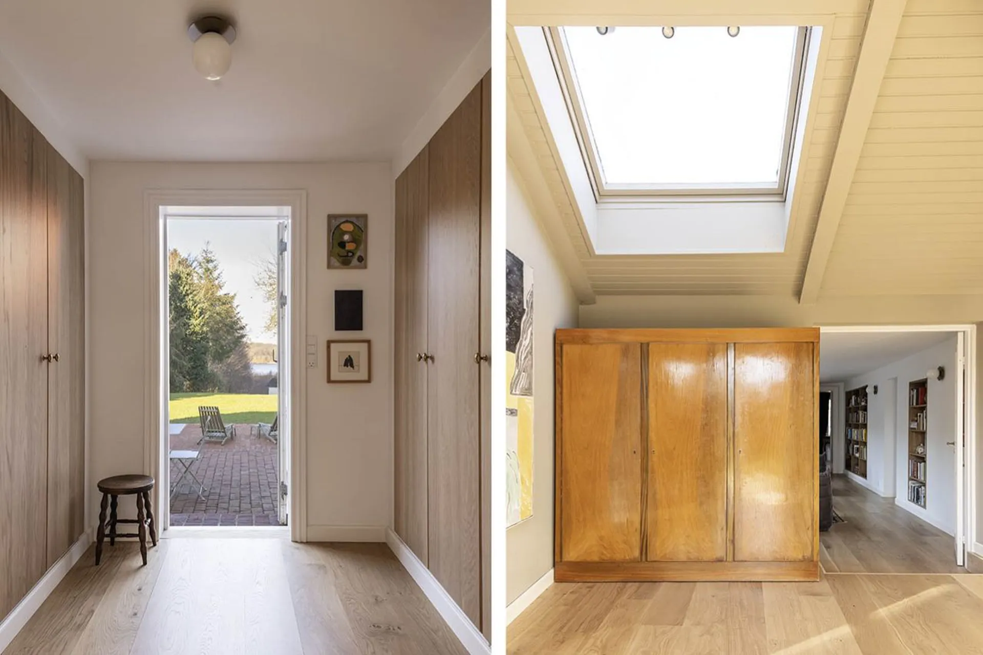 Stor lys entre med gennemgående kig gennem stueetagens to længer. Fra entre gang til børneværelse, mellemstue med vinduer fra gulv til loft, badeværelse og kontor/børneværelse. Fra entre til modsatte længe, værelse i dag indrettet som walk-in, alrum med stort funktionelt indrettet køkken og et magisk udkig, der sætter lyset dagsordenen - og en tilstødende stue. På 1.salen findes stort forældresoveværelse/master bedroom med udgang til stor terrasse og badeværelse. Foran ejendommen er der lagt en smuk rødstensterrasse. Haven er et mekka af plantning! Her er der plads til leg, ro og nydelse, fester og store middagsselskaber for flere generationer. Midt på grunden, ned mod søen, står i dag to små "badehuse" som trænger til en kærlig hånd - men får de det, vil de helt afgjort fuldende grundens, i forvejen ekstraordinære indbydende, udelivs indretning. Fortsætter man videre ned mod søen, gennem et mindre skovareal, findes der to bådebroer, som deles af fire ejendomme. Her kan man have sin båd eller kajak liggende og svømme en tur i den rene sø. Et enestående sted, tæt på natur og kultur, tæt på indkøb, daginstitutioner, skoler og en kun en køretur fra København.