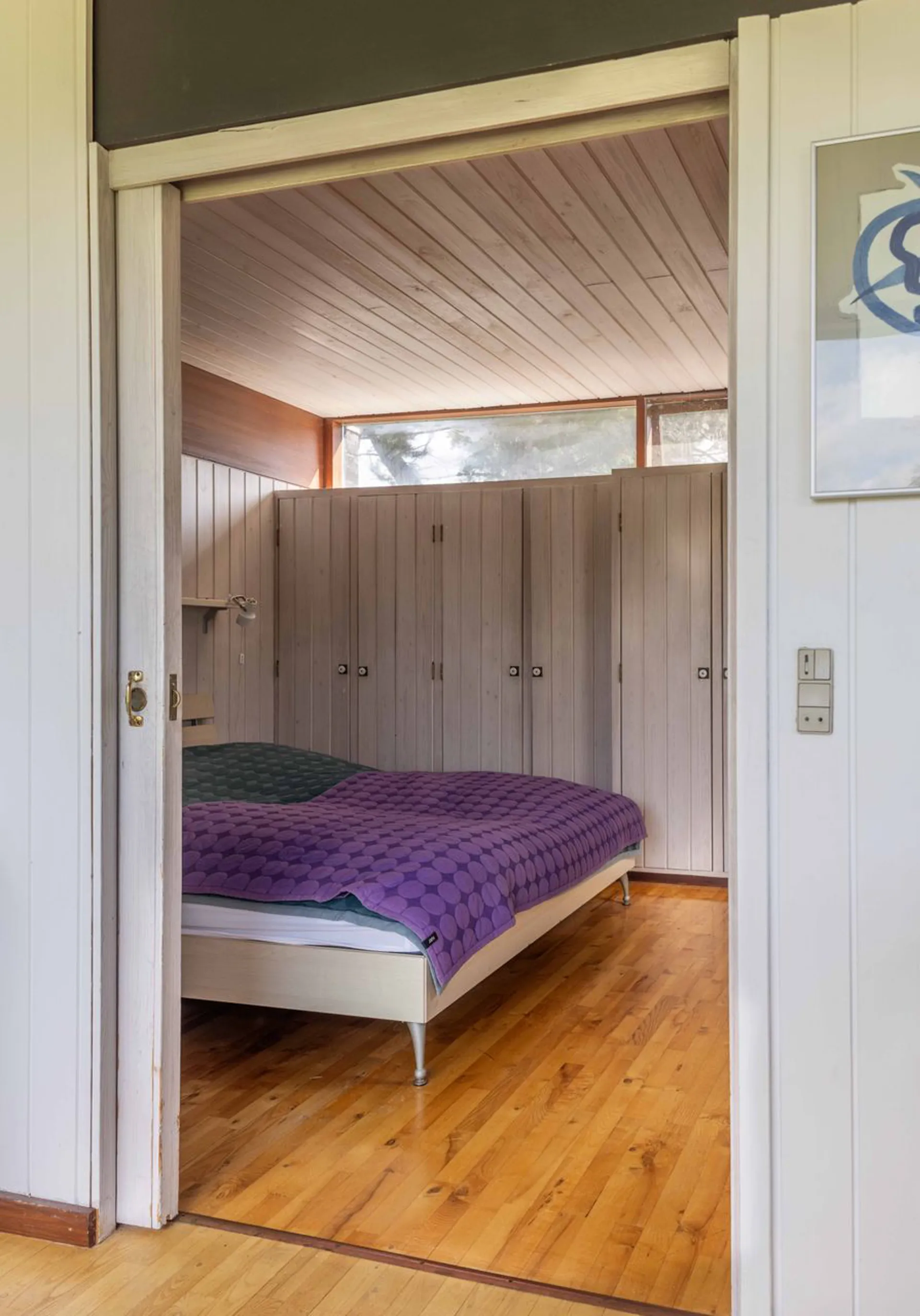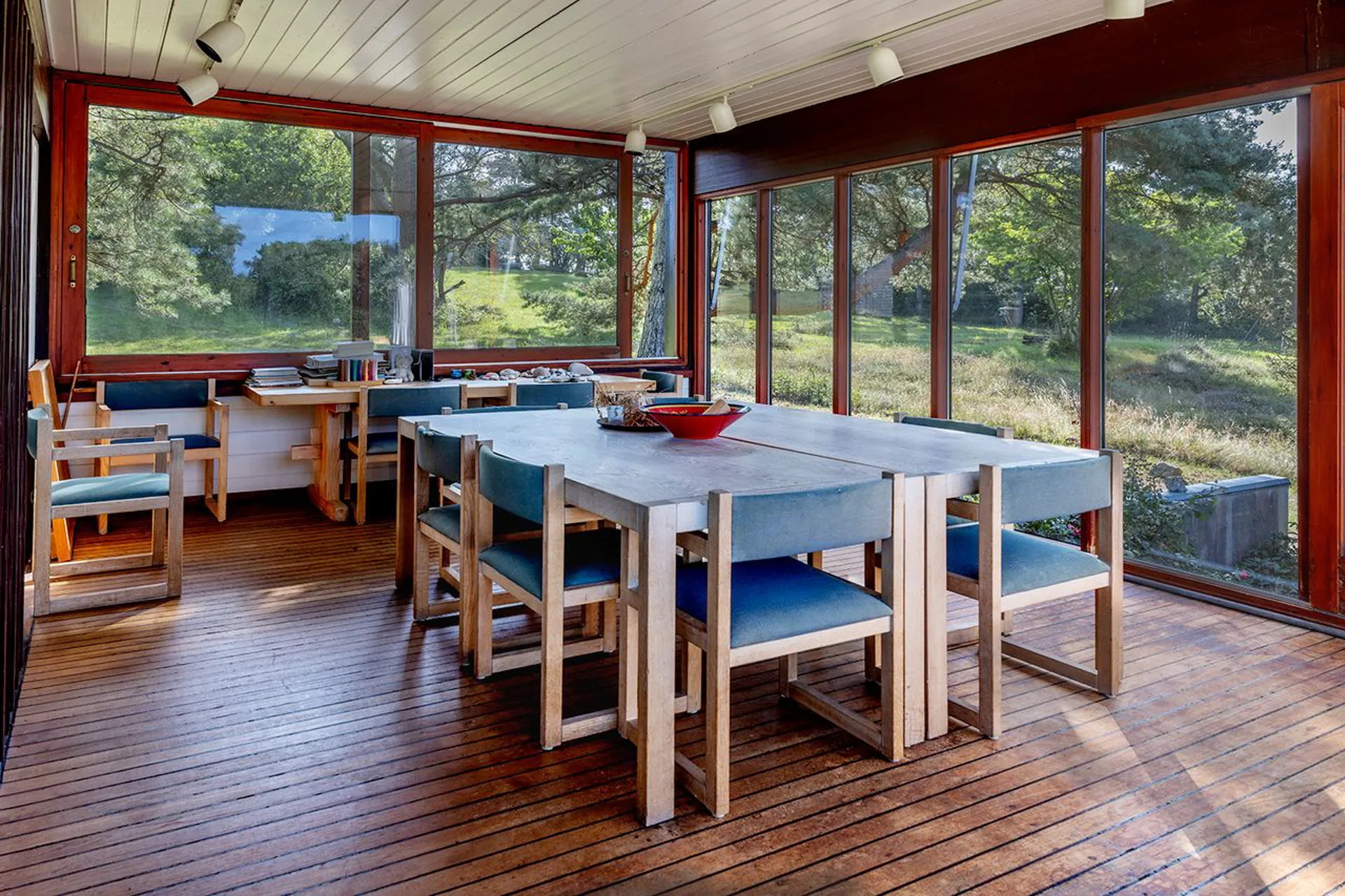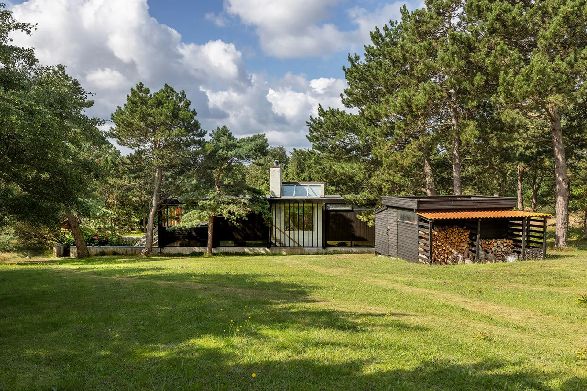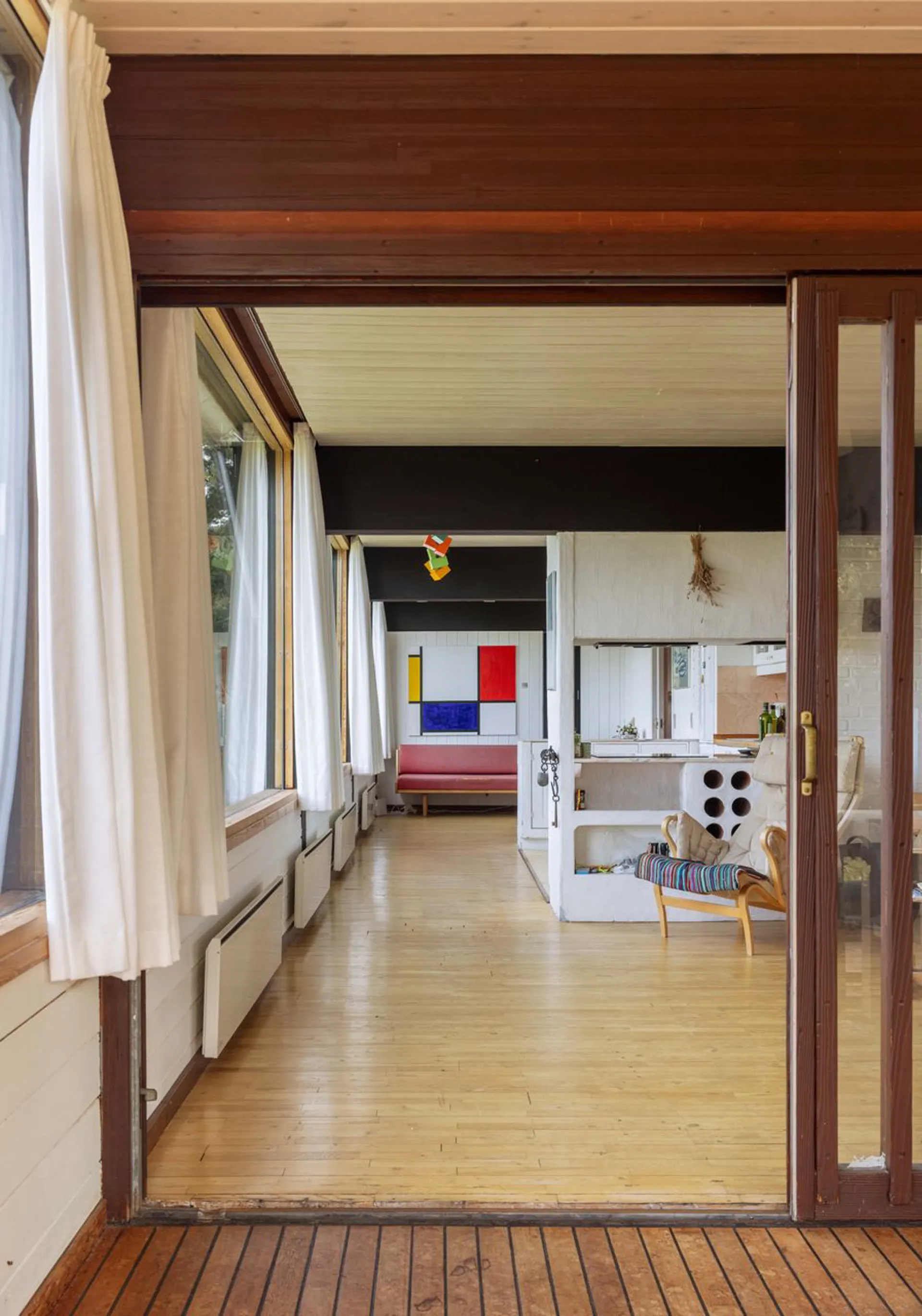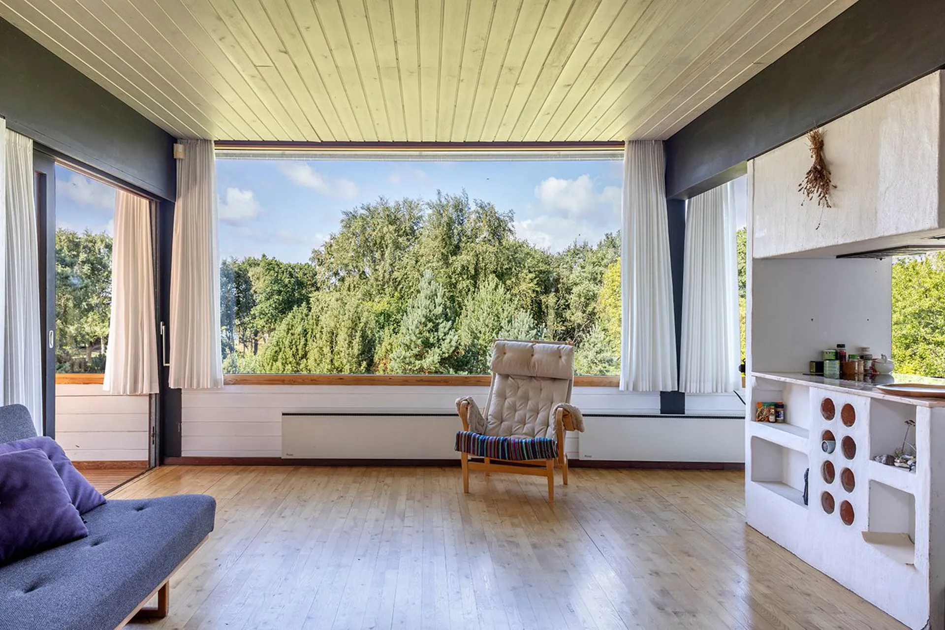 Og det står lige så smukt, som da det blev tegnet. Planløsningen og materialerne består, fordi det gennem årene er blevet passet på og elsket. Hævet over terrænet, vendt mod syd, med store vinduespartier, der fanger solen hele dagen. Naturen tillades at blive en nærgående gæst i huset. Lige der. Lige foran - og lige rundt om. Sådan er det her - naturligt naturrigt.