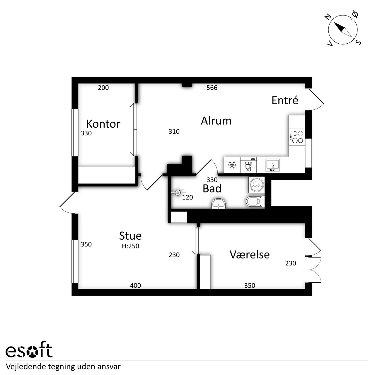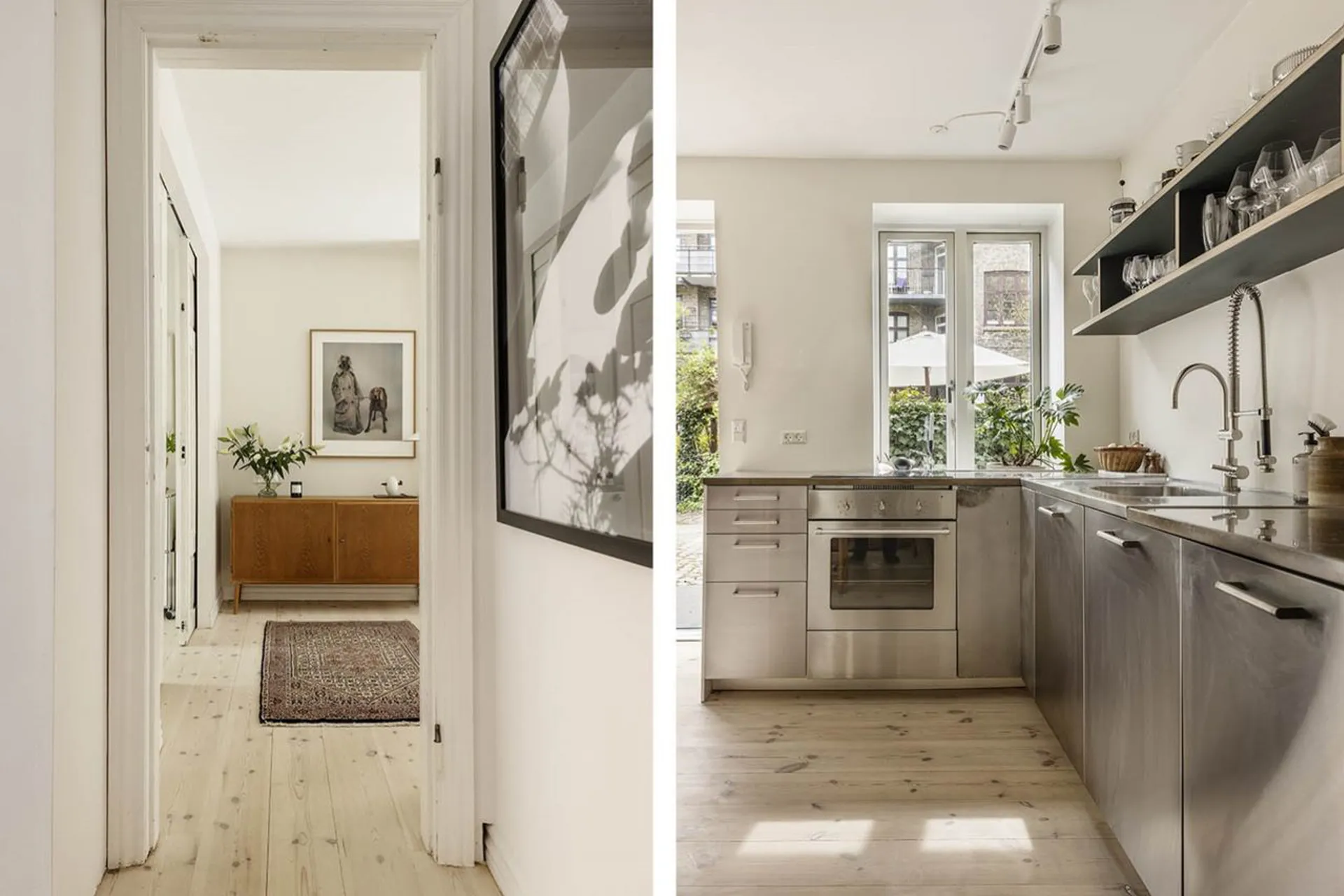 Indretning: Entré til moderne og funktionelt indrettet køkkenalrum med elementer i stål, herfra åben forbindelse til kontor/værelse. I forlængelse en rummelig stue, hvor gården kan tilgås direkte fra. Herudover soveværelse og badeværelse.