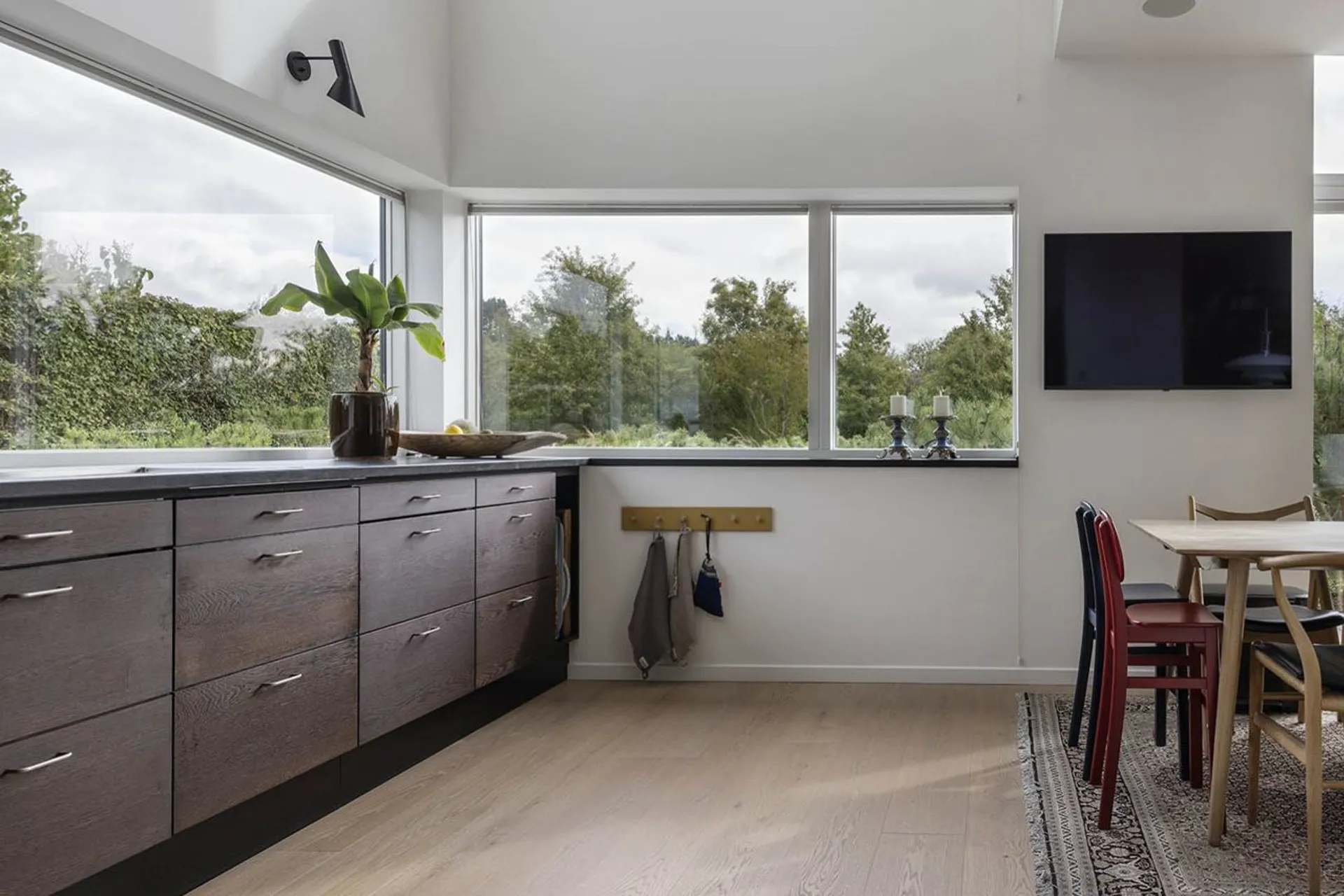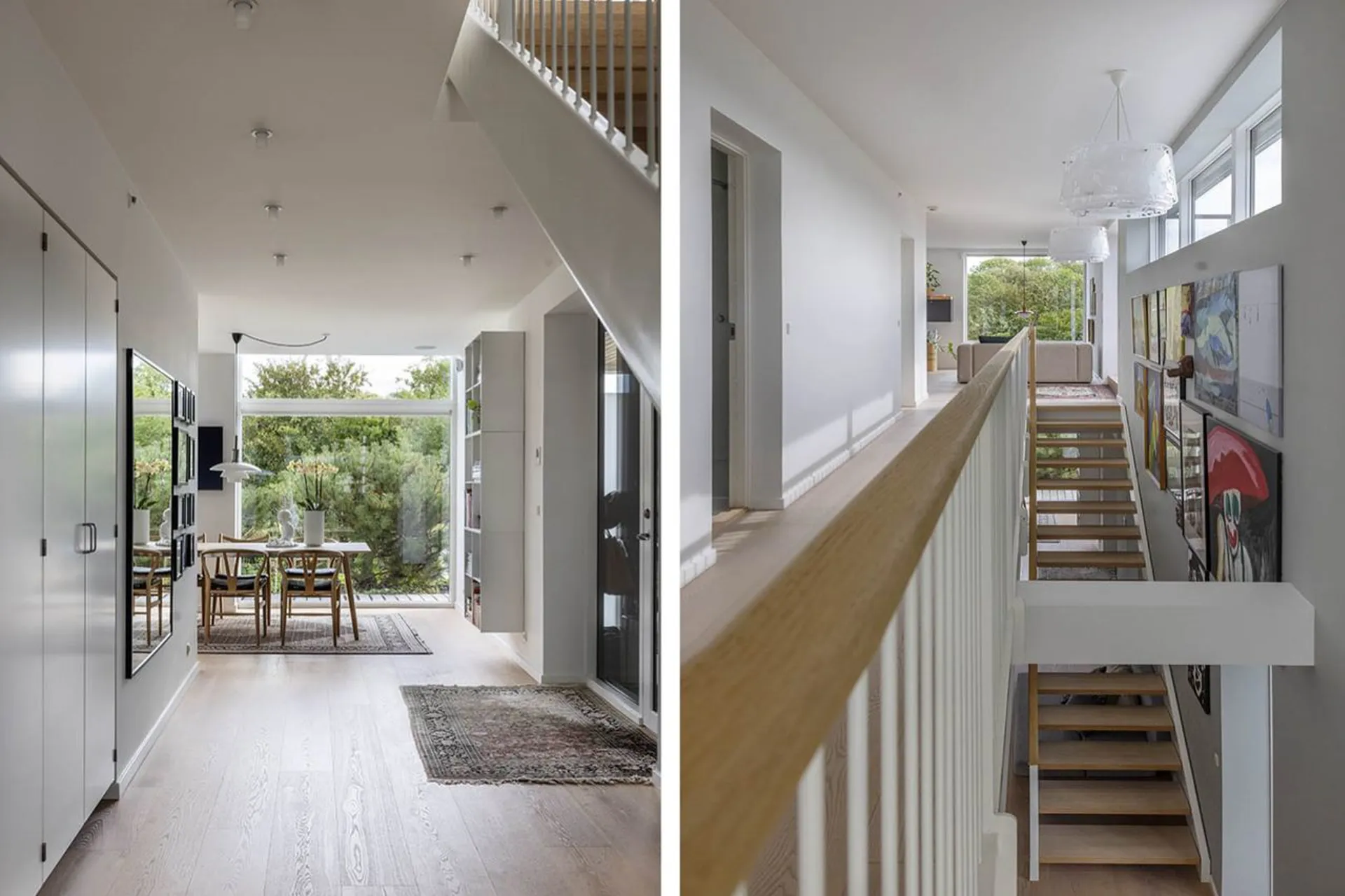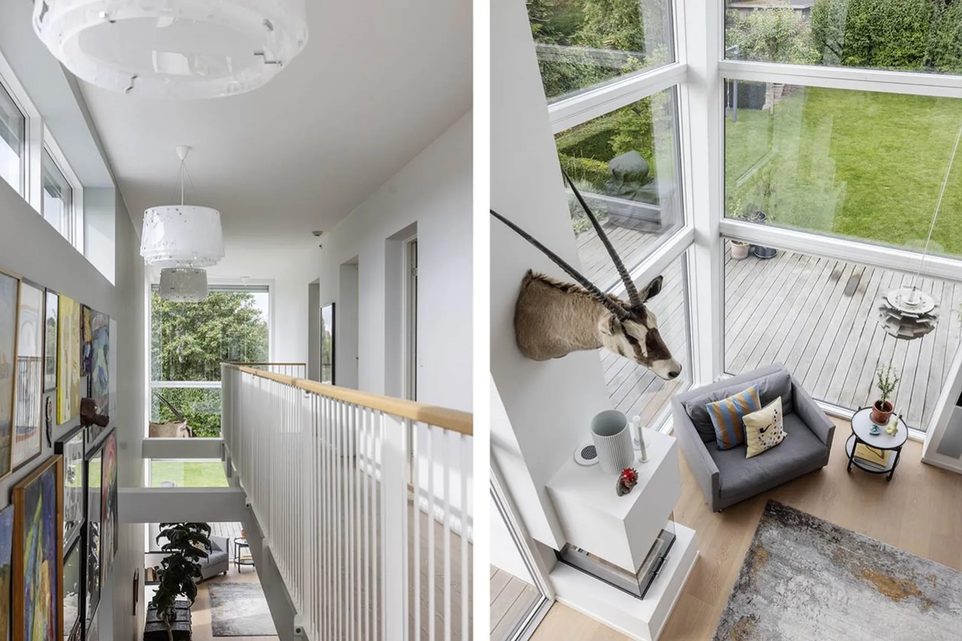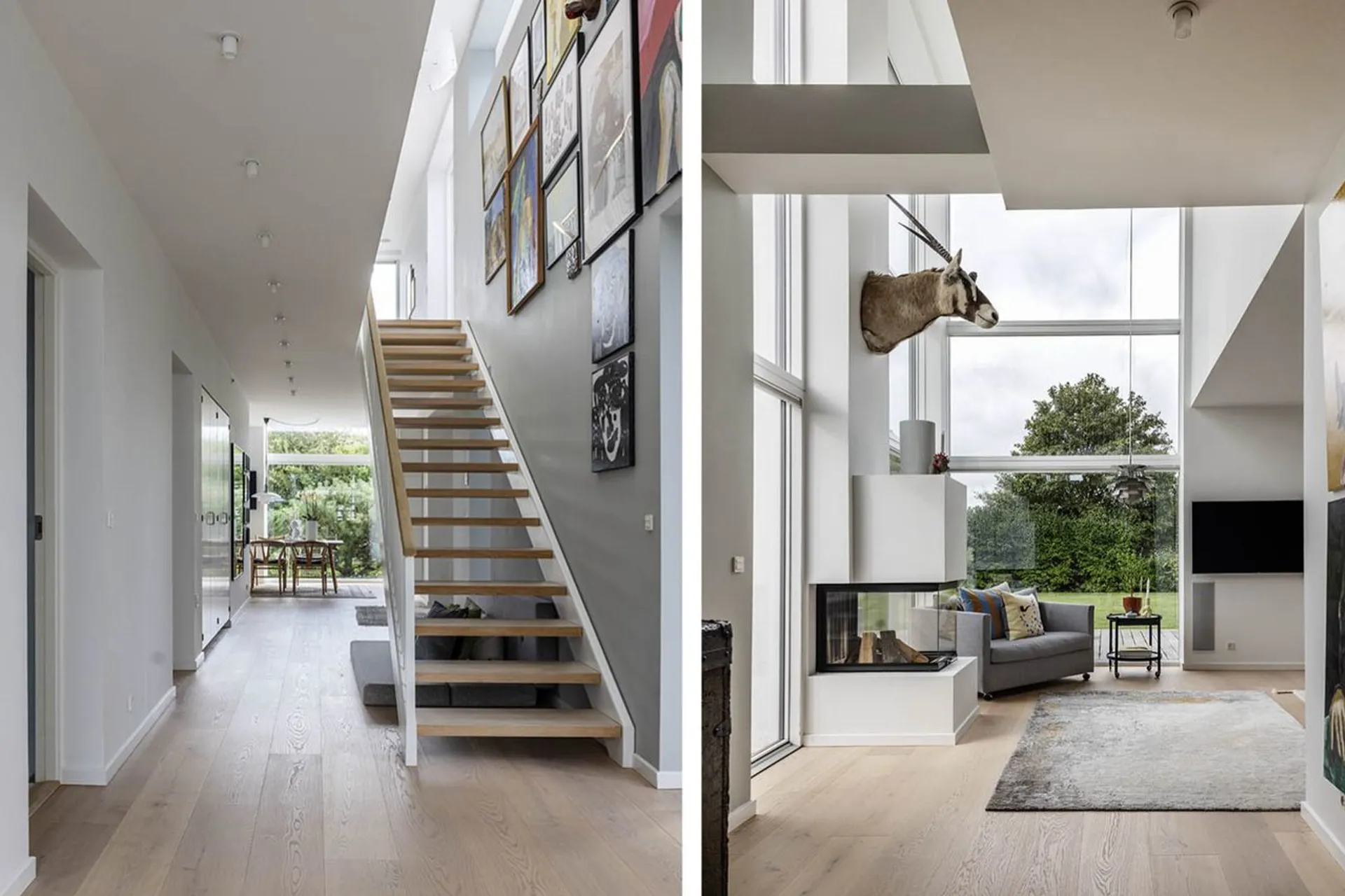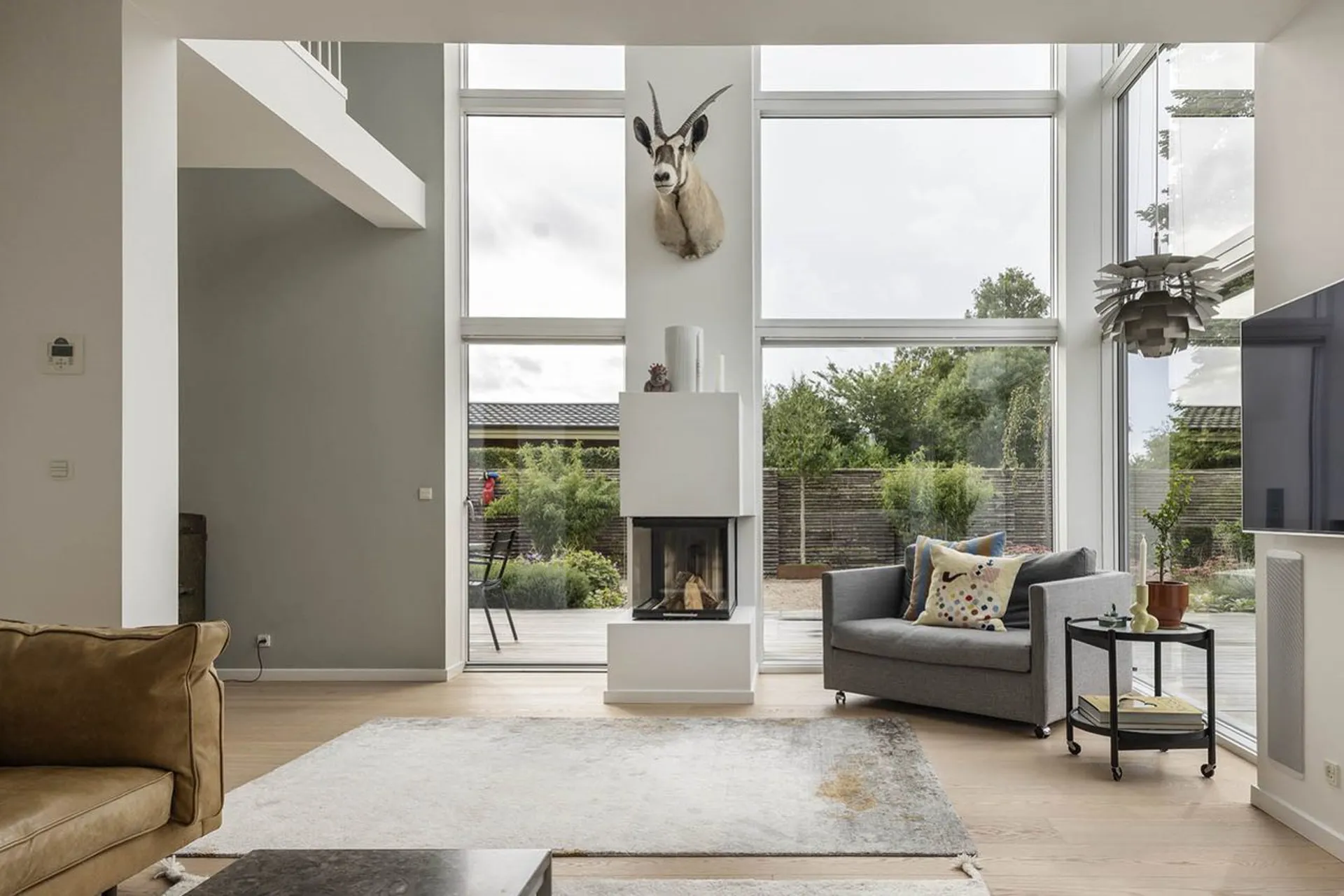 Huset er skabt i en balance mellem funktion, de skønneste lysindfald og udstrakte rumligheder med kig på 20 meter i husets længde med op til 5,5 meters loftshøjde. Fra husets enorme vinduespartier er der fra alle steder en generøs kontakt med det elegante haveanlæg, der omgrænser husets. Staude- og Rododendronbede står side om side med æbletræer, klematis, roser, haverum, solterrasser og intet mindre end egen petanquebane.