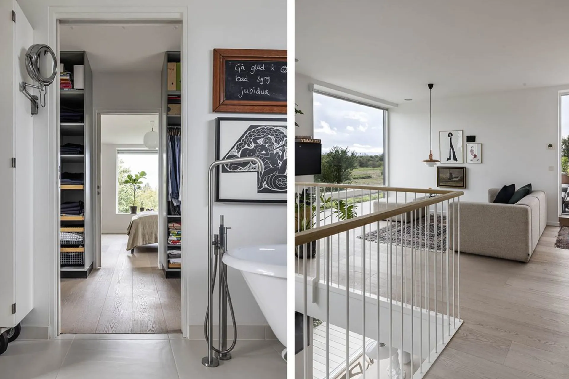 Stueetagen er indrettet med enormt køkkenalrum mod øst og opholdsstue med pejs mod vest – forbundet af gallerigang med udgang til et skønt anlagt orangeri og elegant trappeløb til 1. sal. Desuden soveværelse, badeværelse med brus og bryggers med egen indgang fra nord. 1. salen er indrettet med elegant svalegang, hvorfra der er adgang til yderligere to soveværelser – det ene med walk-in og badeværelse med kar. Fra stort åbent repos/udsigtområde er der udgang til sydvendt tagterrasse på godt 50 m2, hvorfra der er frit udsyn over Kystagerparken.