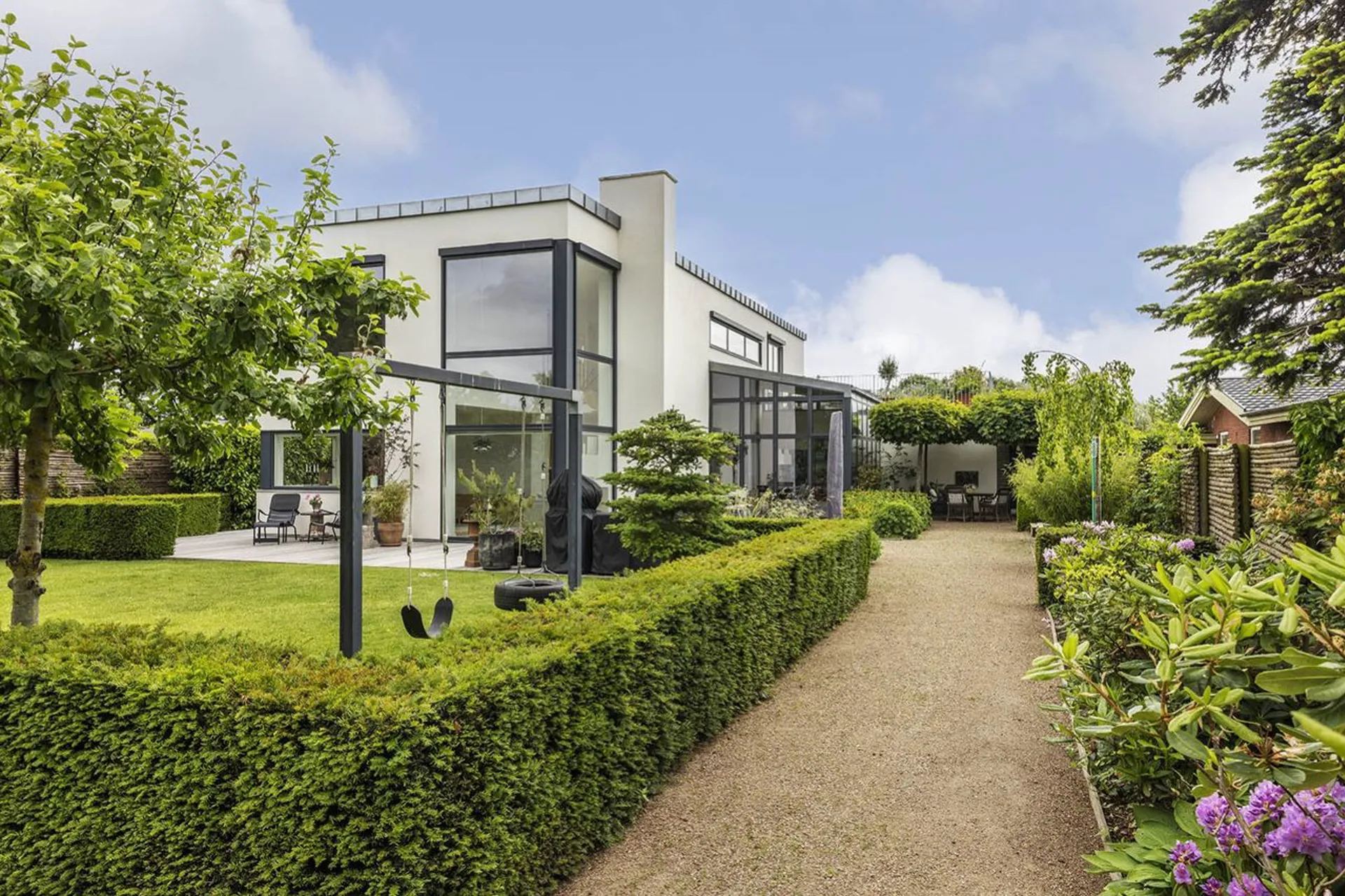 Huset er skabt i en balance mellem funktion, de skønneste lysindfald og udstrakte rumligheder med kig på 20 meter i husets længde med op til 5,5 meters loftshøjde. Fra husets enorme vinduespartier er der fra alle steder en generøs kontakt med det elegante haveanlæg, der omgrænser husets. Staude- og Rododendronbede står side om side med æbletræer, klematis, roser, haverum, solterrasser og intet mindre end egen petanquebane.
