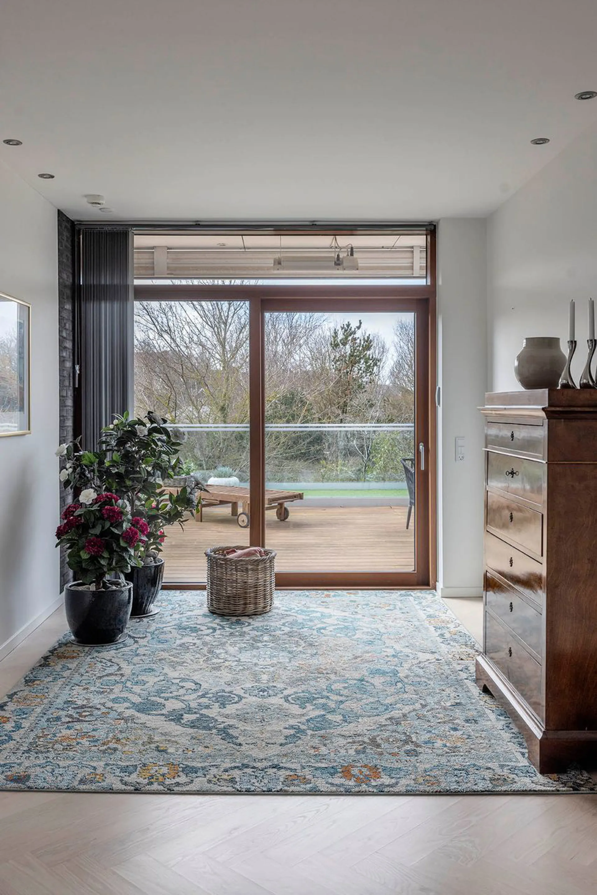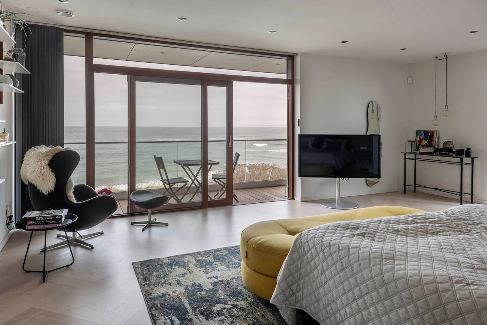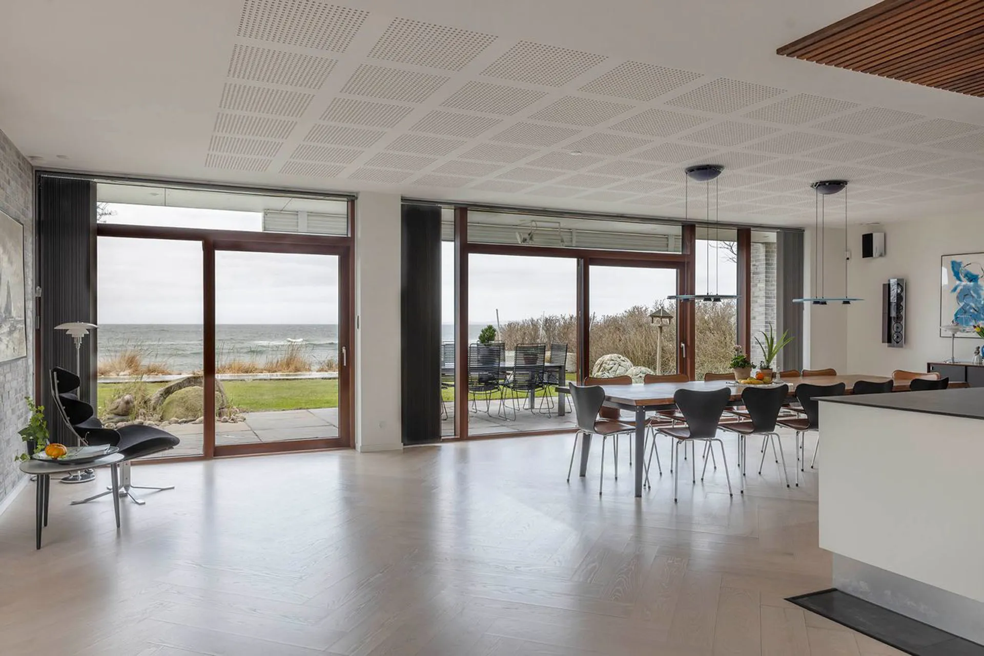På Nordre Strandvej 18 vågner man ikke bare op, man bliver vækket blidt af bølgernes rytme. Lyset ændrer sig i løbet af dagen, driver ind gennem huset, rammer gulvene, væggene, materialerne. Og om aftenen ligger solen lavt over vandet og spejler sig direkte ind i hjemmet. Det er ikke noget, man kigger på. Det er noget, man lever i.