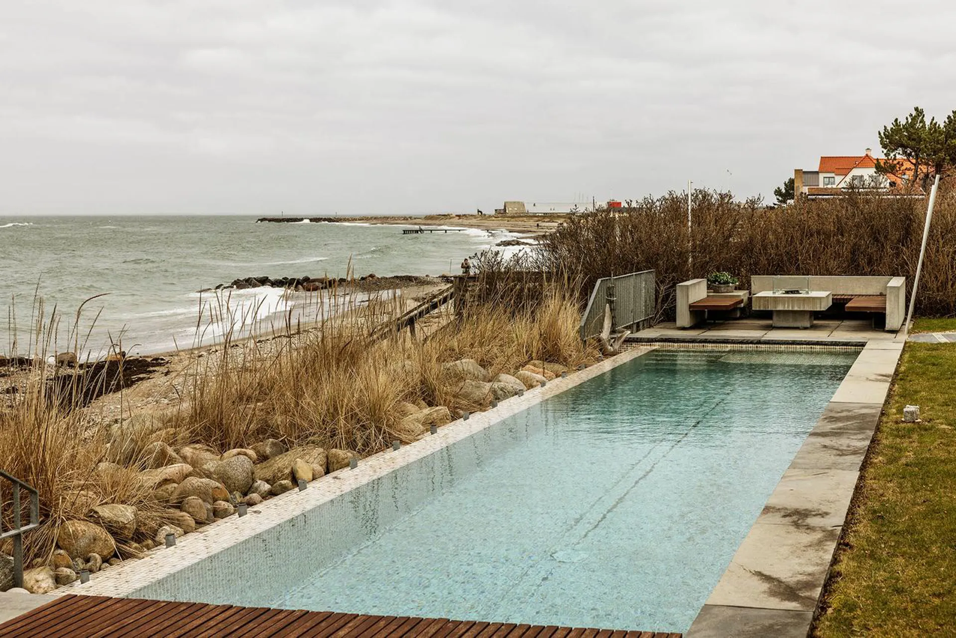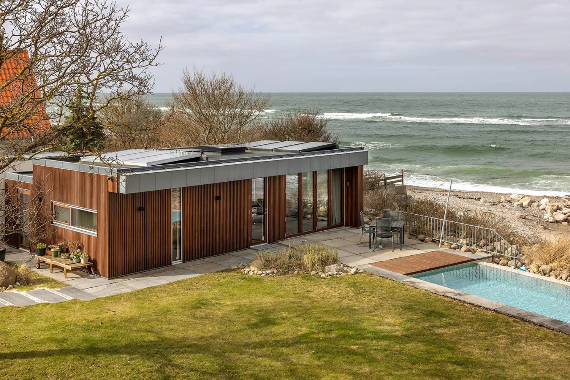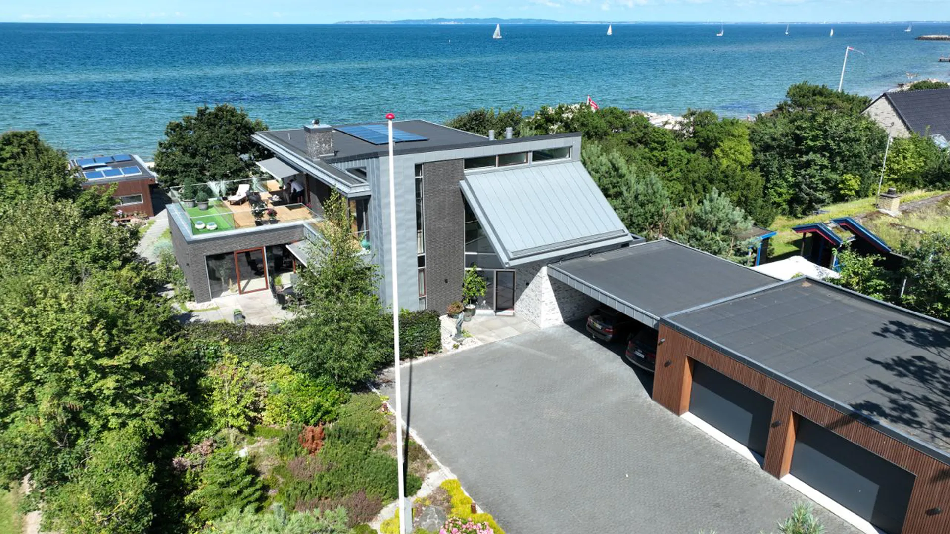 Bag det bølgende hegn gemmer der sig noget, man ikke forventer. En arkitekttegnet villa fra 2019, diskret placeret i terrænet og skærmet af en smukt beplantet forhave. Fra vejen fornemmer man kun en antydning. Men så åbner huset sig. Mod vandet. Mod lyset. Mod horisonten.