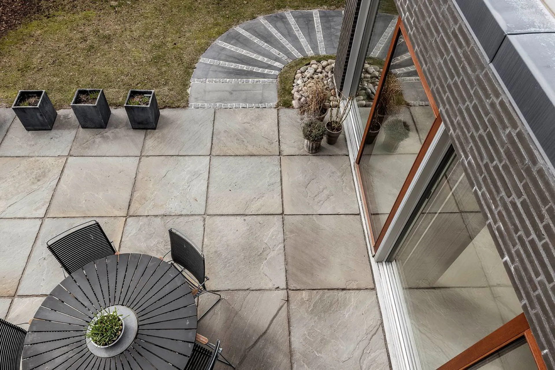 Haven er ikke bare anlagt. Hver plante, hvert træ, hver linje er tænkt ind. Store naturstensterrasser skaber zoner rundt i haven, placeret efter solen, efter vinden, efter udsigten. Her bliver man siddende lidt længere, end man egentlig havde planlagt.
