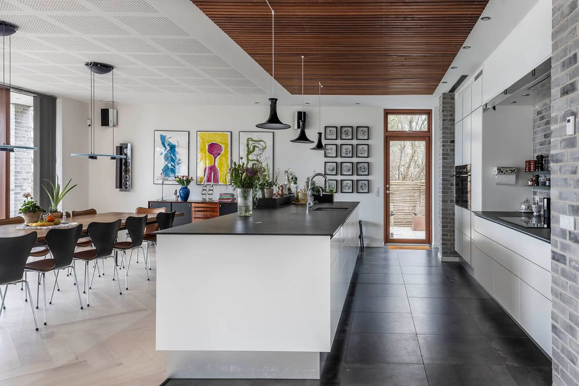 Køkken-alrummet og stuen. Ét stort, åbent rum, men stadig opdelt i zoner, i stemninger, i “rum i rummet”. Her leves livet. Her samles man. Her er plads til både det stille og det sociale. Store vinduespartier på begge sider lader lyset strømme uhindret gennem huset i løbet af dagen. Ude og inde smelter sammen. Rummene bliver levende. Selv de store flader føles nærværende og varme. Blikket søger mod vandet – igen og igen – og stopper aldrig helt.
