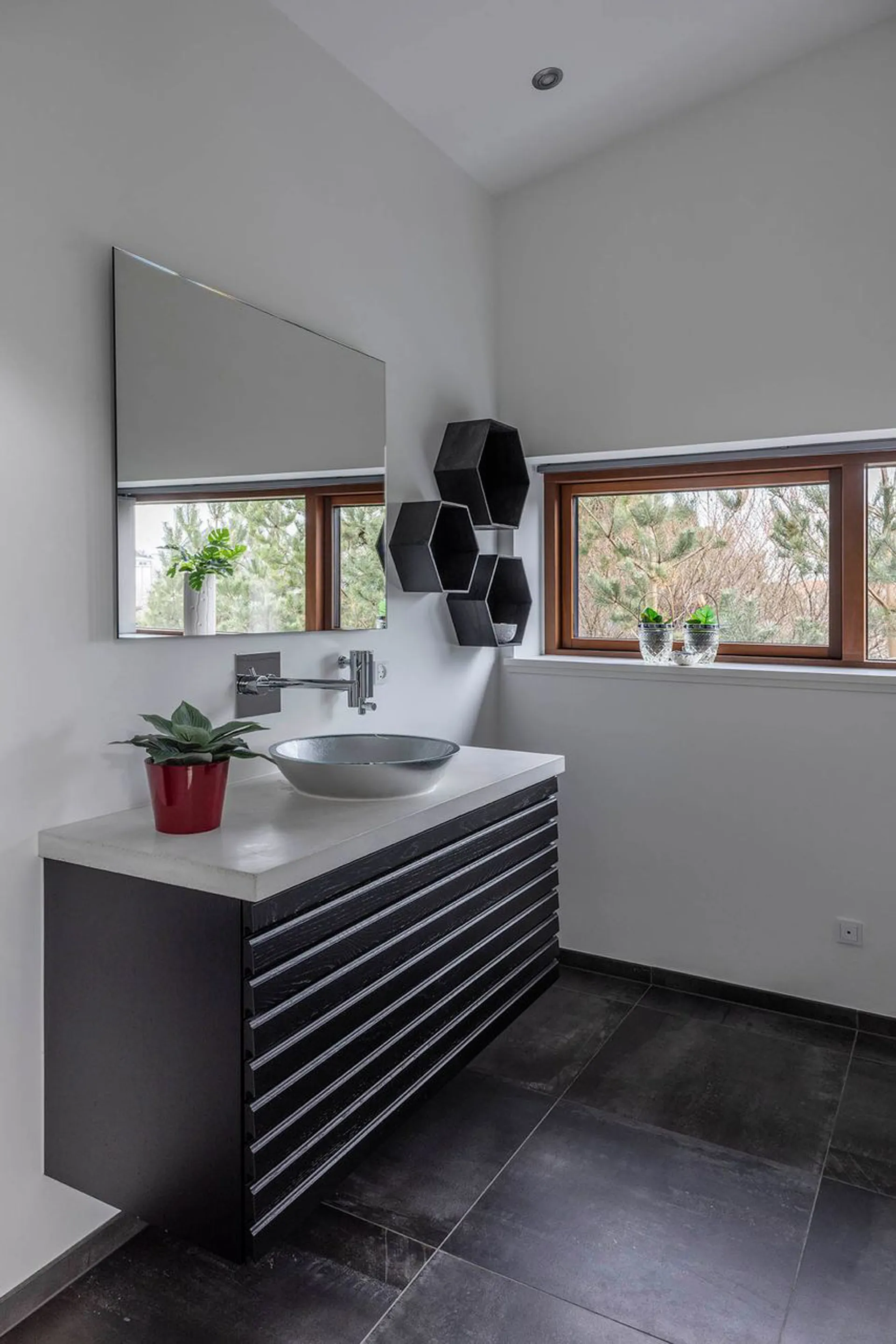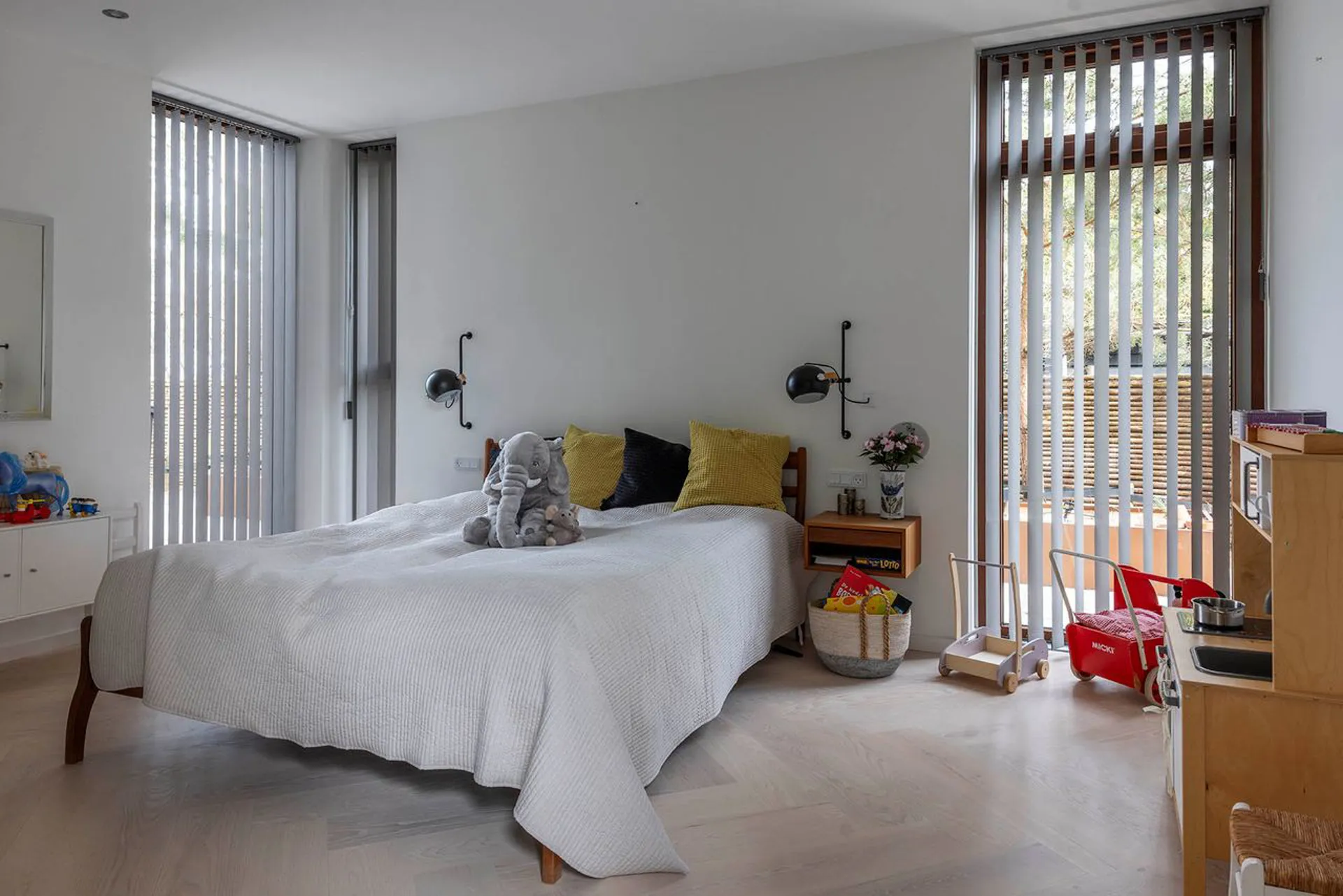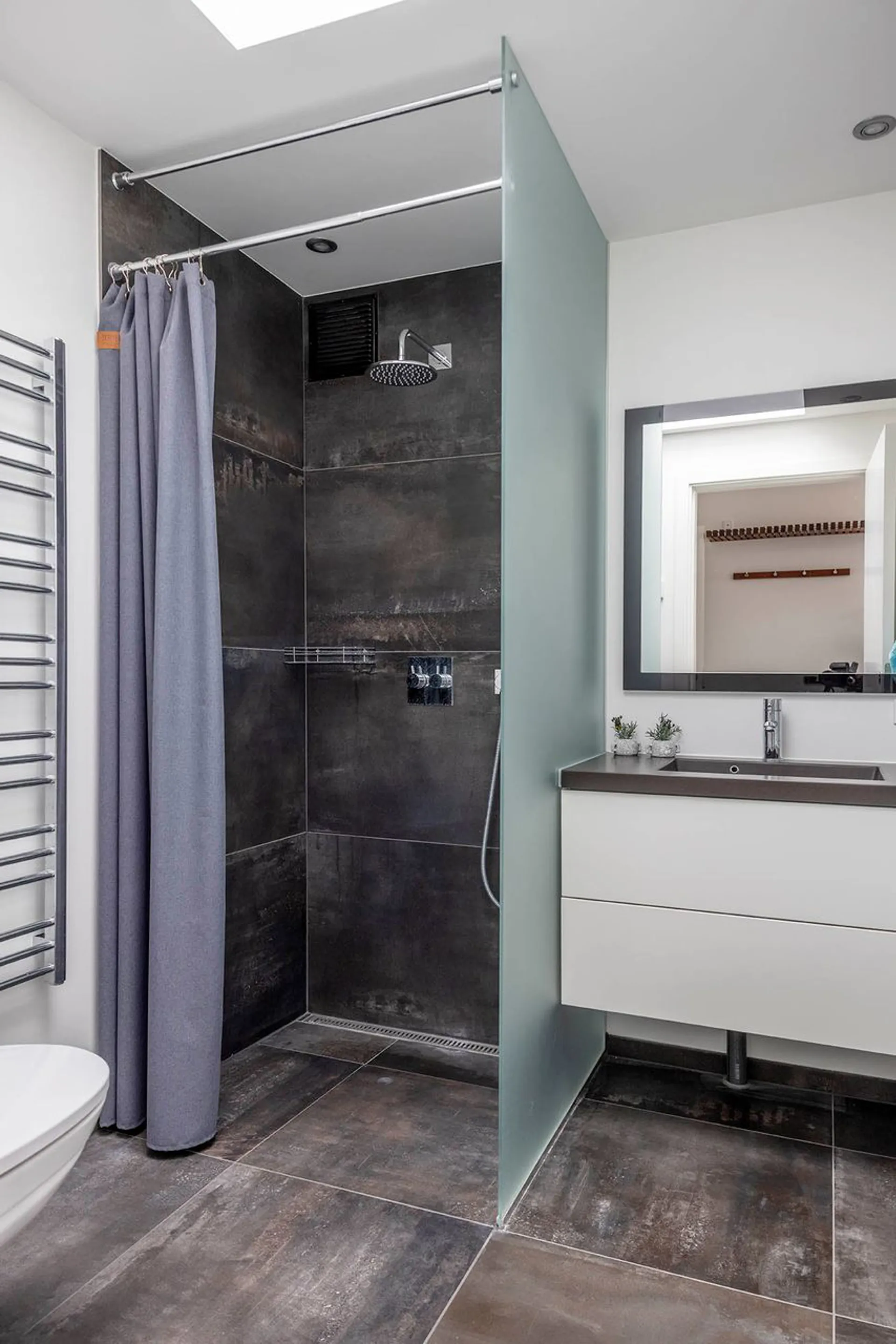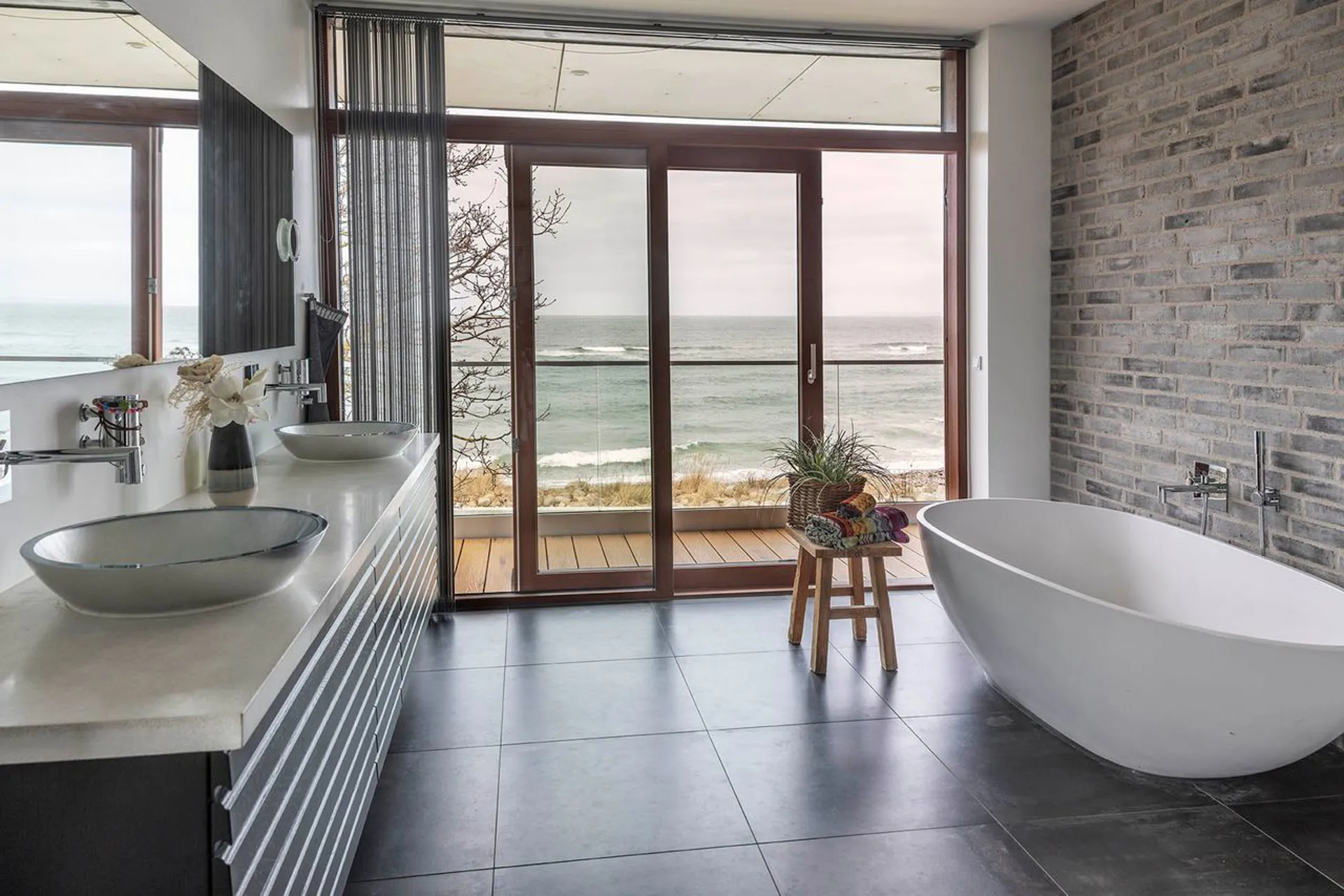 Alle soveværelser har udsigt til vandet. Det er ikke tilfældigt. Det er en prioritet. Tre badeværelser, udført i samme materialer, samme stil, gennemført, roligt og smagfuldt