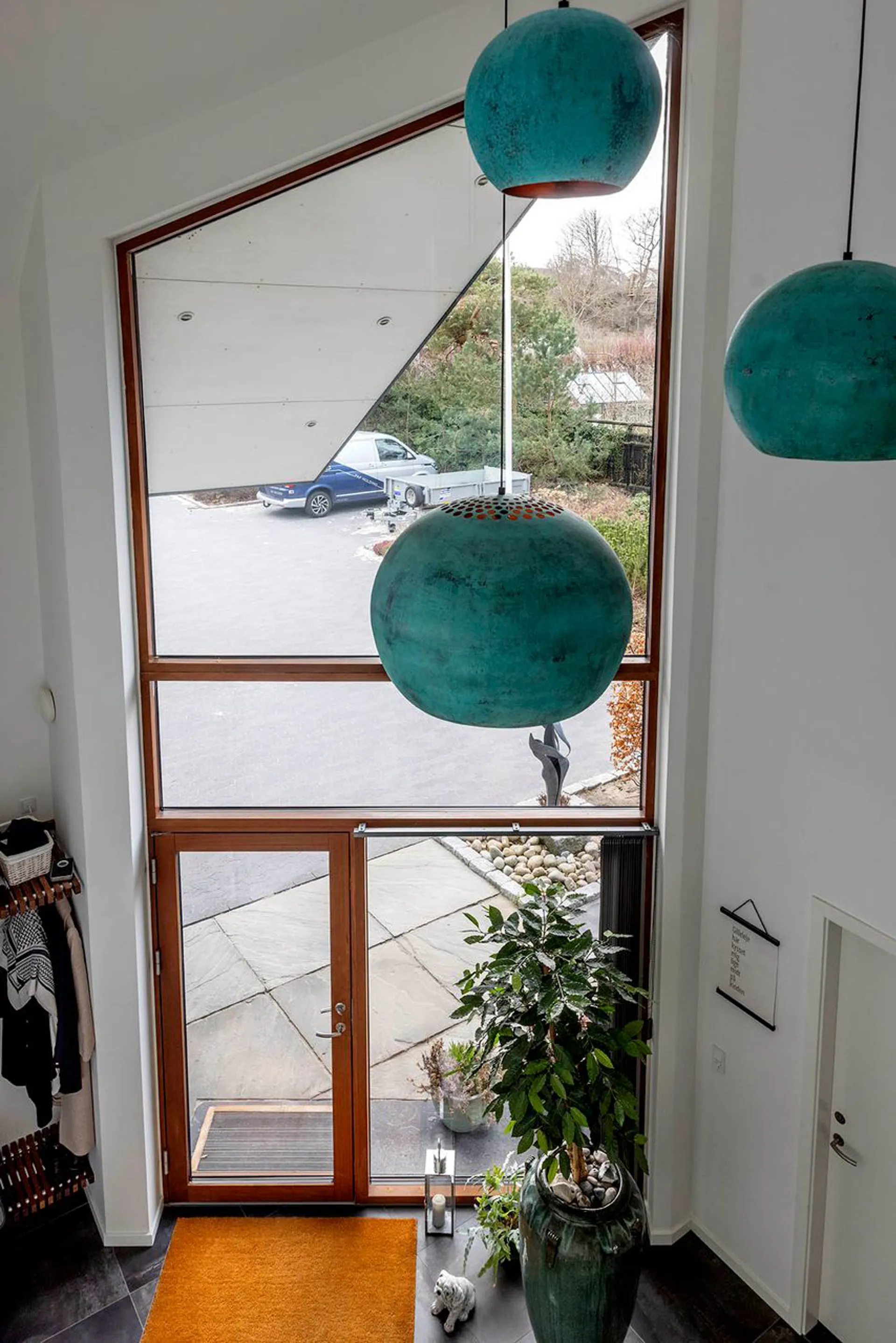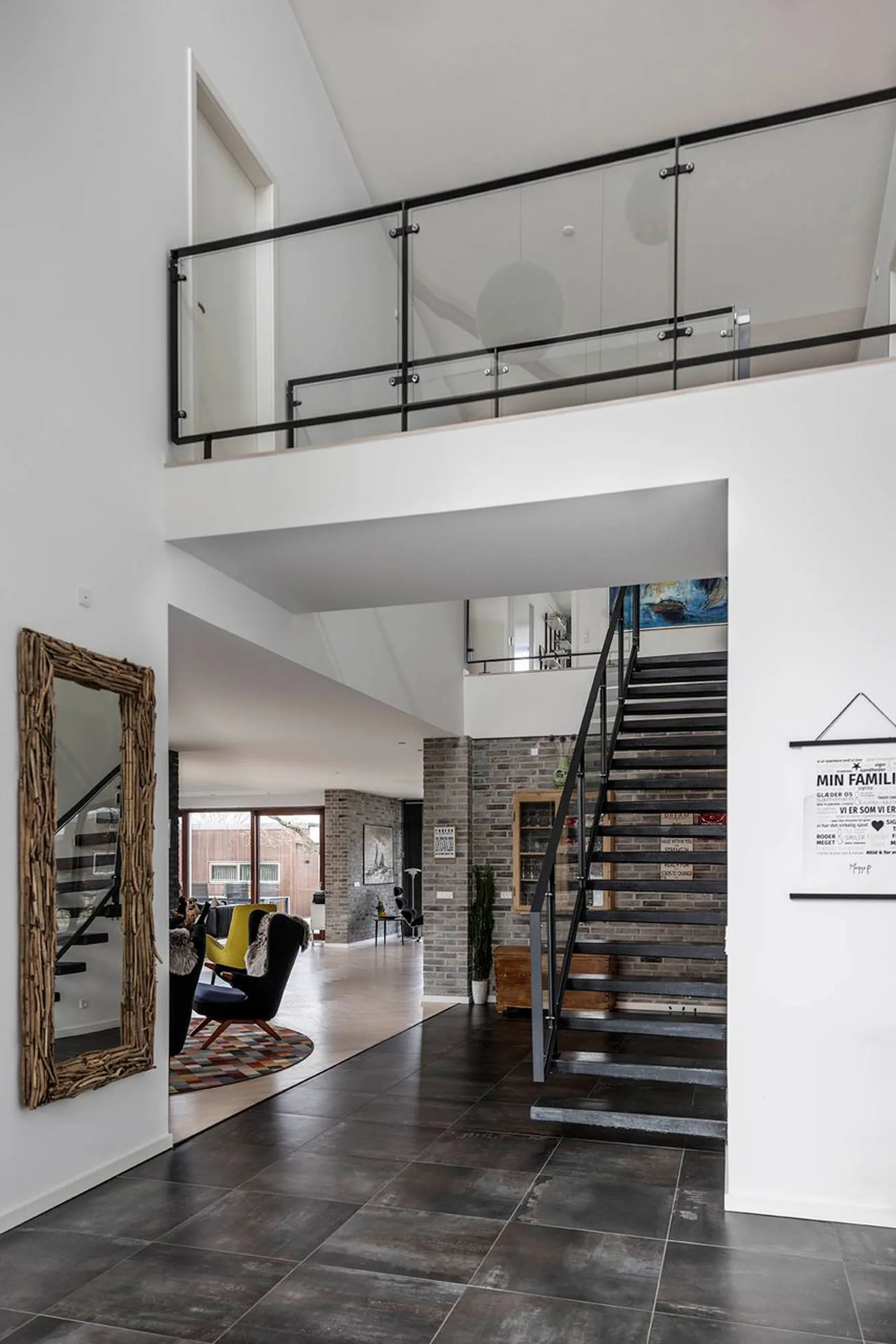 Man træder ind i en entré, hvor loftshøjden strækker sig 7,4 meter op. Det er her, man mærker det første gang. Fornemmelsen af rum. Af sammenhæng. Underetage og førstesal smelter sammen i ét greb, bundet sammen af en let, svævende betontrappe, der næsten opløser sig i rummet.