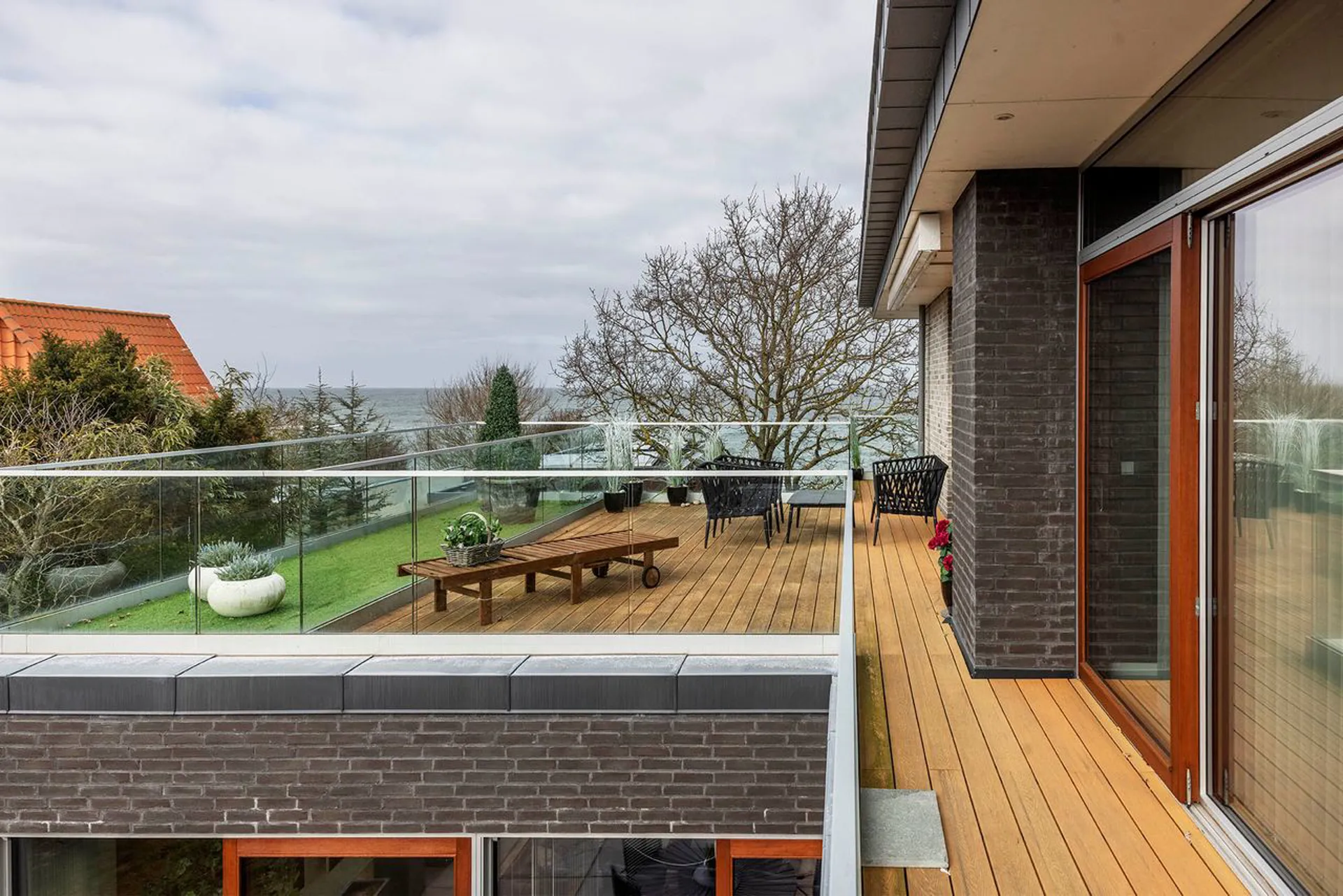 Langs hele vandsiden løber en svalegang på 1 etage. Her drikker man sin kaffe. Her trækker man vejret lidt dybere. Den leder videre til en stor tagterrasse, hvor udsigten får endnu mere plads.