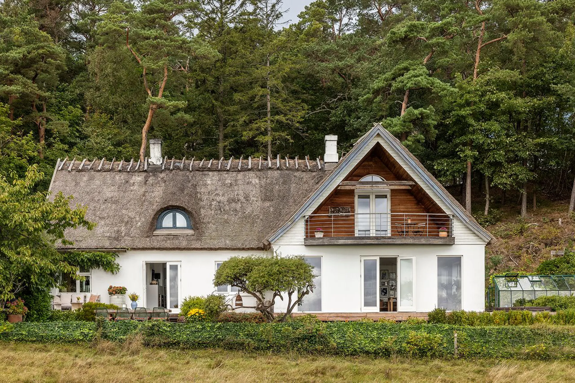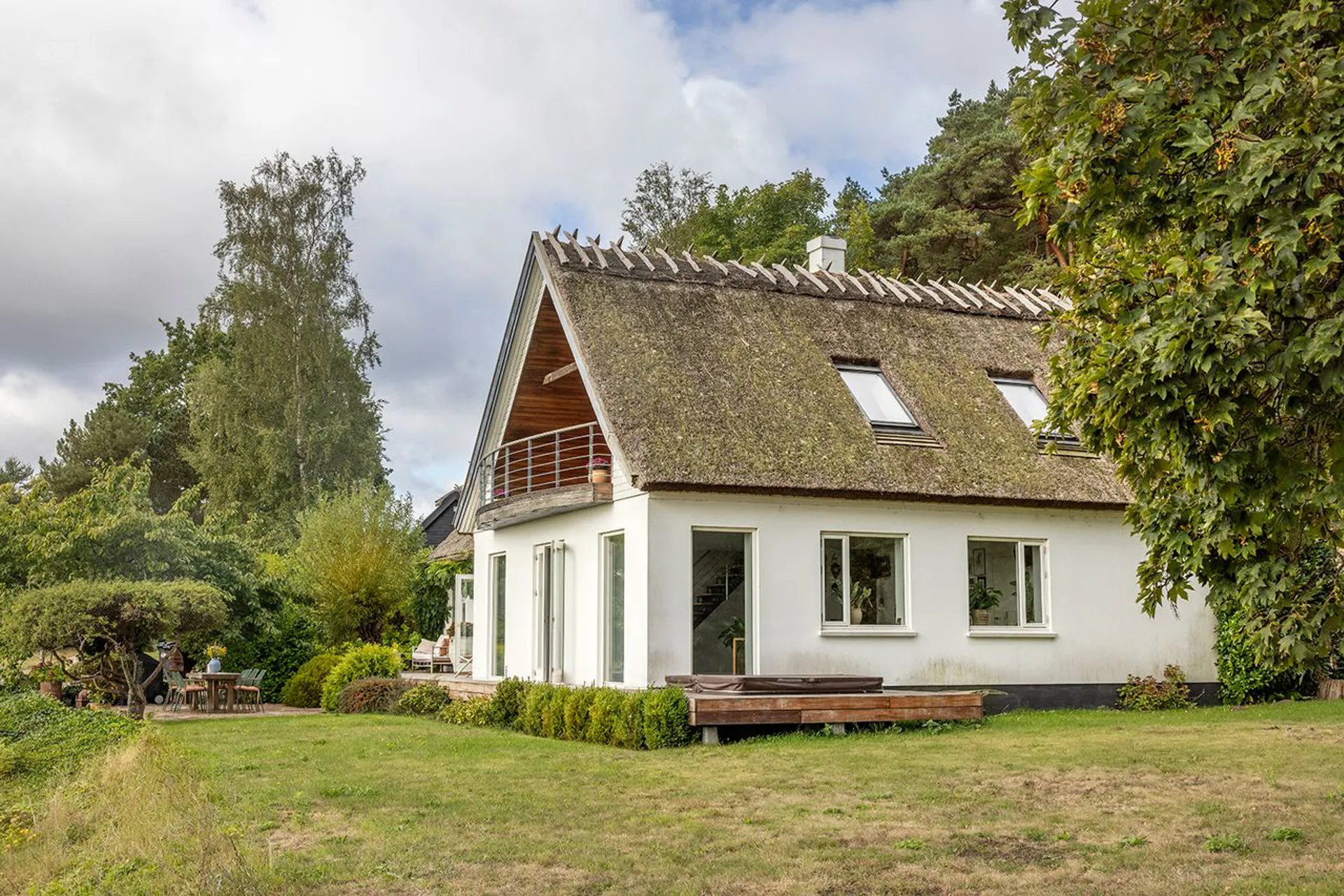 Det moderne stråtækte hus er bogstaveligt talt omringet af natur og ren idyl mellem skov og sø. Den kuperede grund tilbyder udsigt på flere niveauer og er fuld af hyggekroge, charmerende hjørner, små fremspring og er i virkeligheden ét stort sweet spot med læ i et fuldendt, velkomponeret virvar. Fra hver en krog er der de skønneste kig – både ind i huset og ud mod den omkringliggende natur.