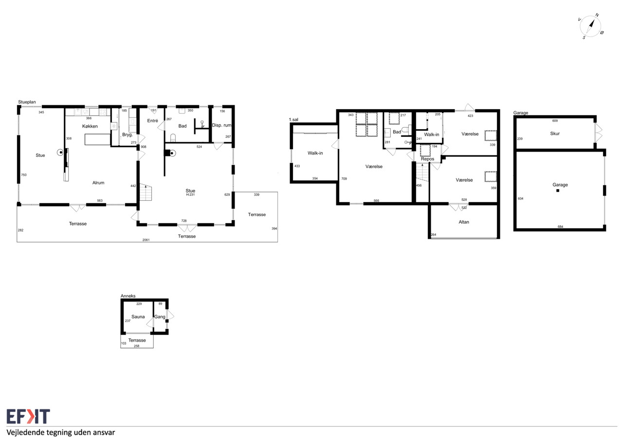 På 1. salen findes stort opholdsrum, som naturligt fordeler overetagen i de 4 værelser og badeværelse.