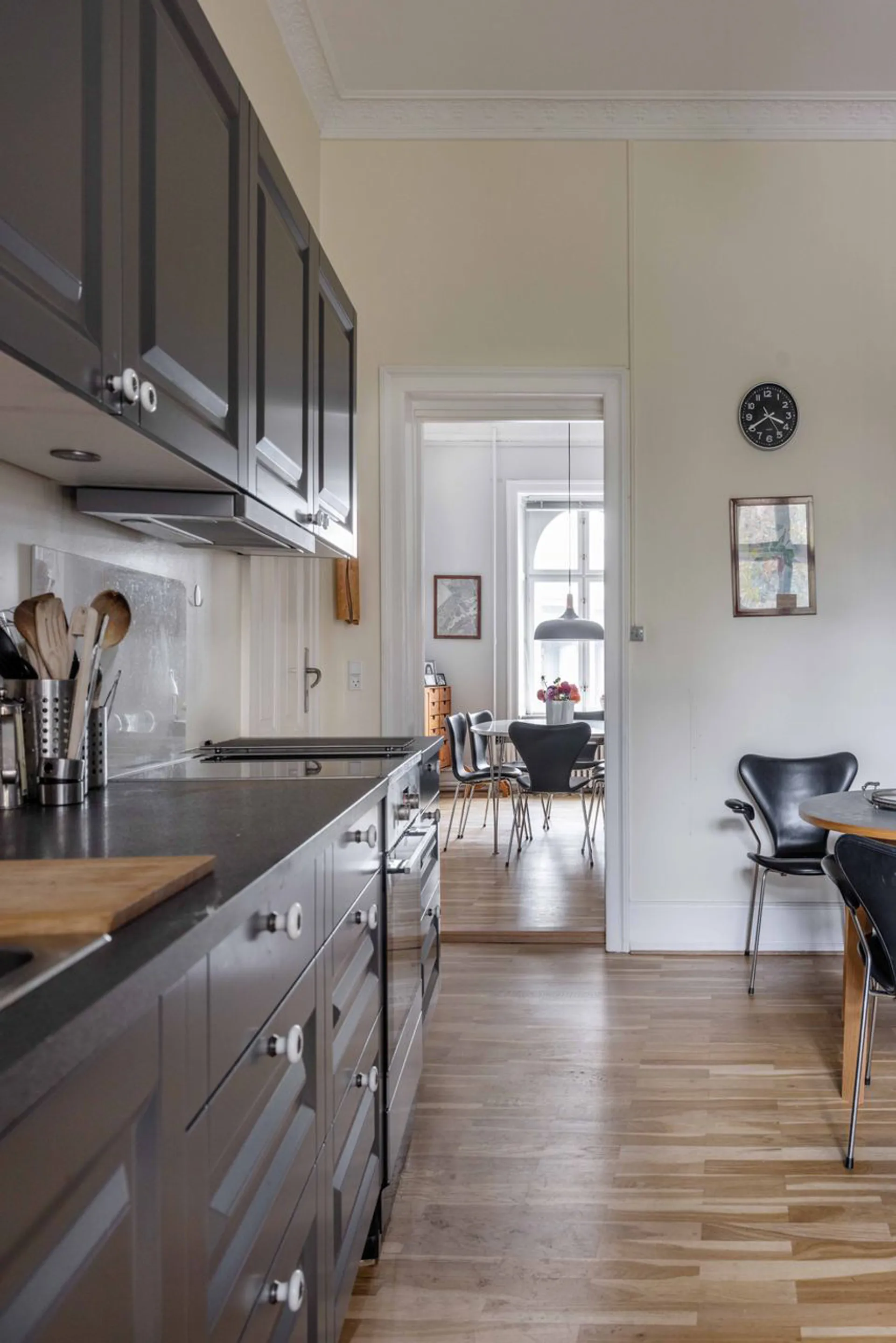 Lejligheden er blevet nænsomt restaureret efter at have tjent som lægepraksis i adskillige år. Der er blandt andet blevet etableret et badeværelse og køkken, som begge fremstår smagfulde og i nydelig stand. Lejligheden fortjener helt rimeligt den sidste opdatering for at nå sit fulde potentiale, og den giver i udgangspunktet nogle unikke og fantastiske rammer for at etablere sig i en af de mest vidunderlige boliger på Østerbro.