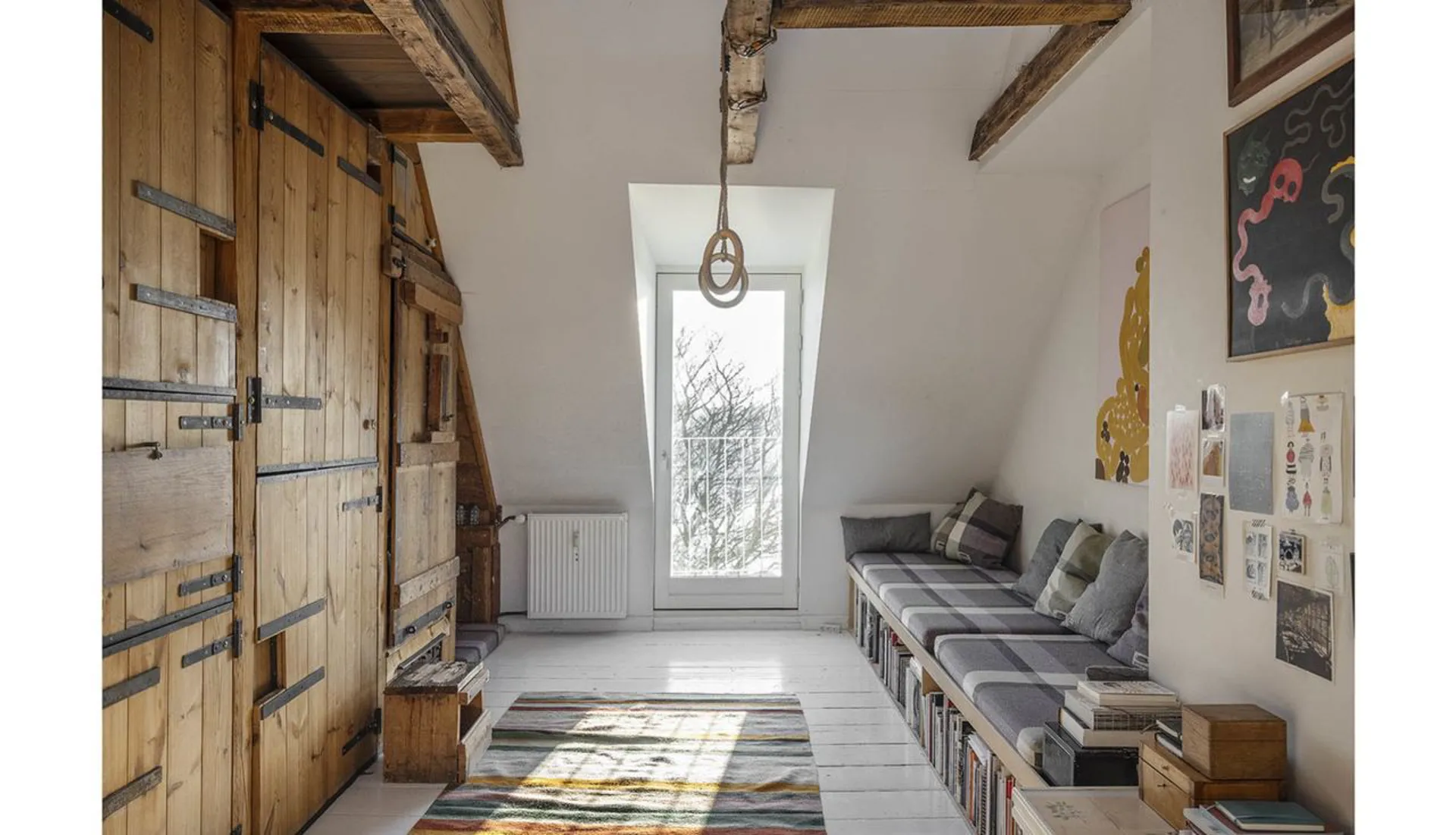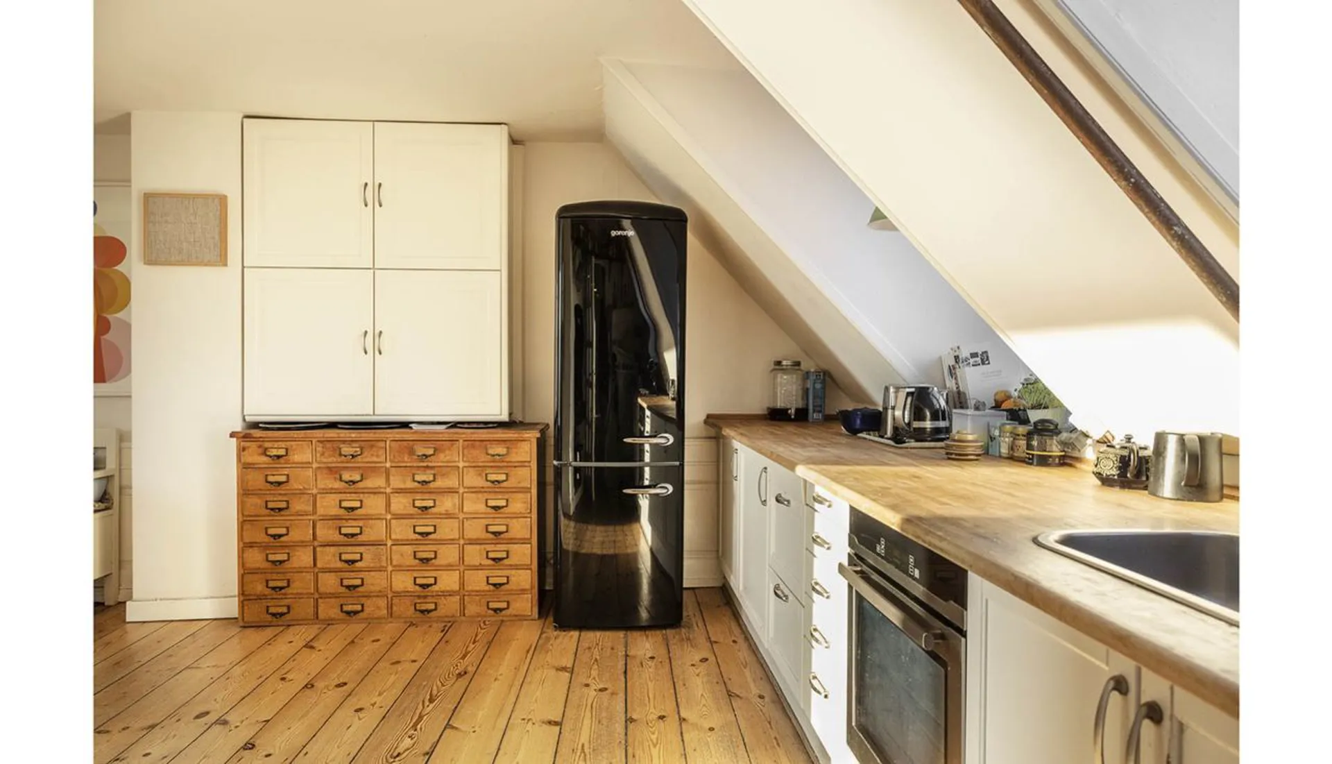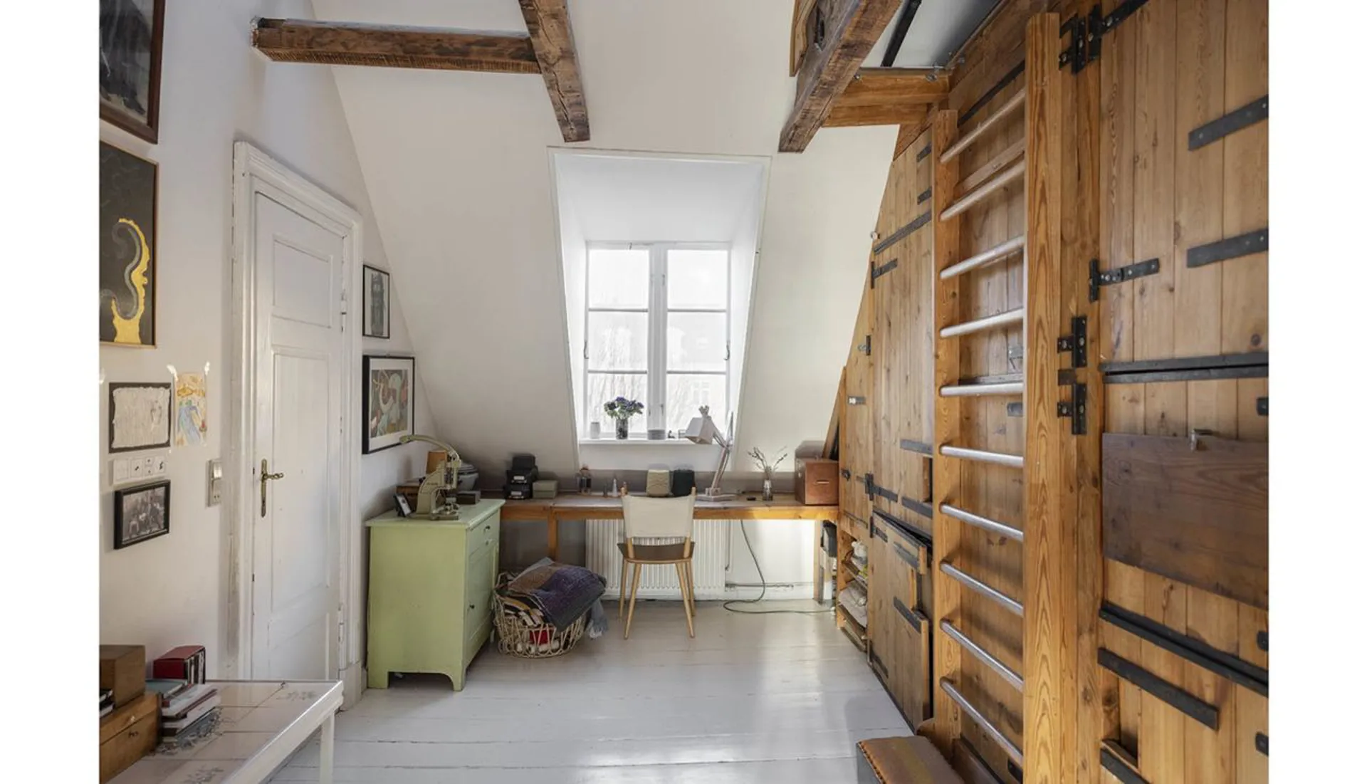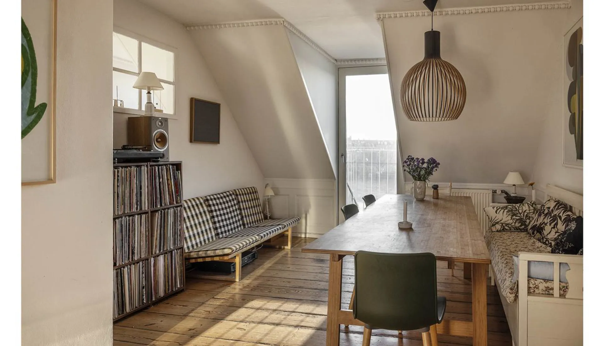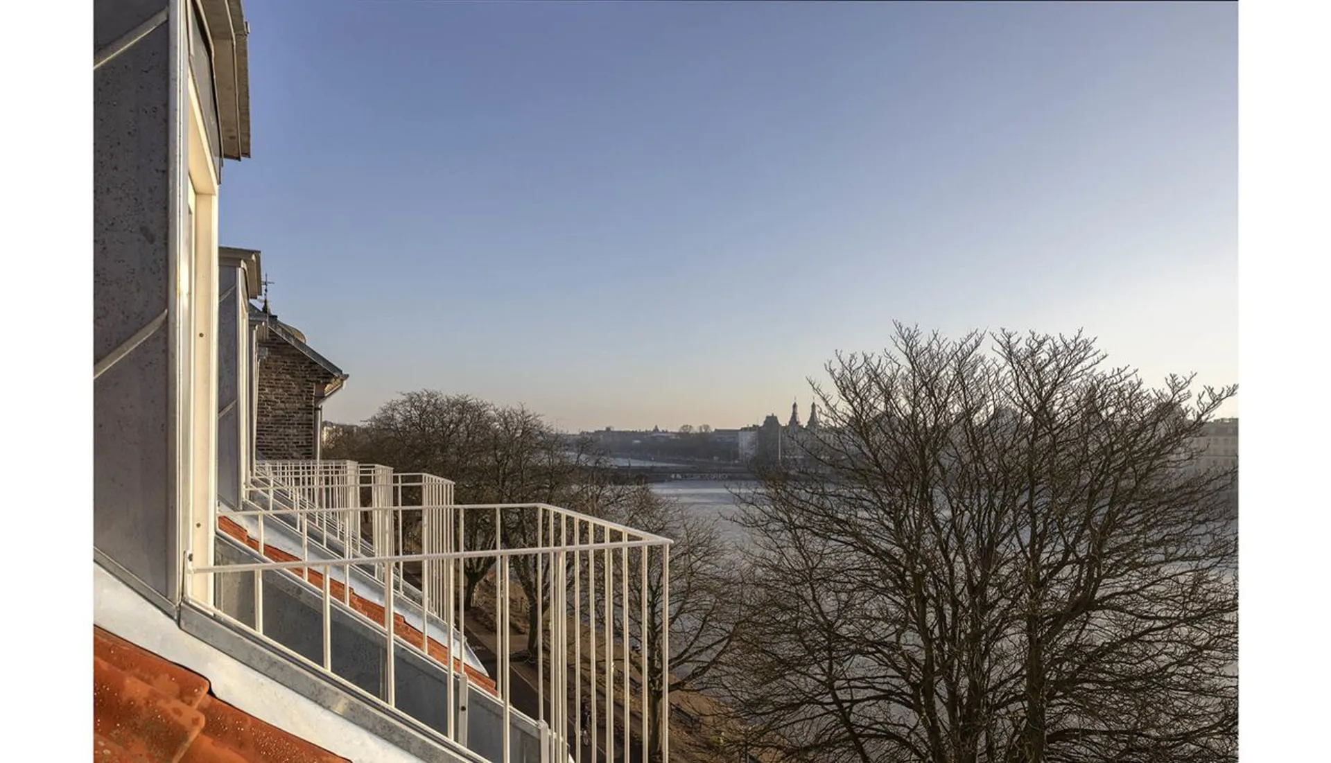 Denne lejlighed repræsenterer i sin særegne form og fine kvalitet noget af det mest internationale København kan byde på, og henvender sig til det pladskrævende par eller mindre familie, som ønsker at bo stille trukket tilbage med fantastisk udsigt midt i København.