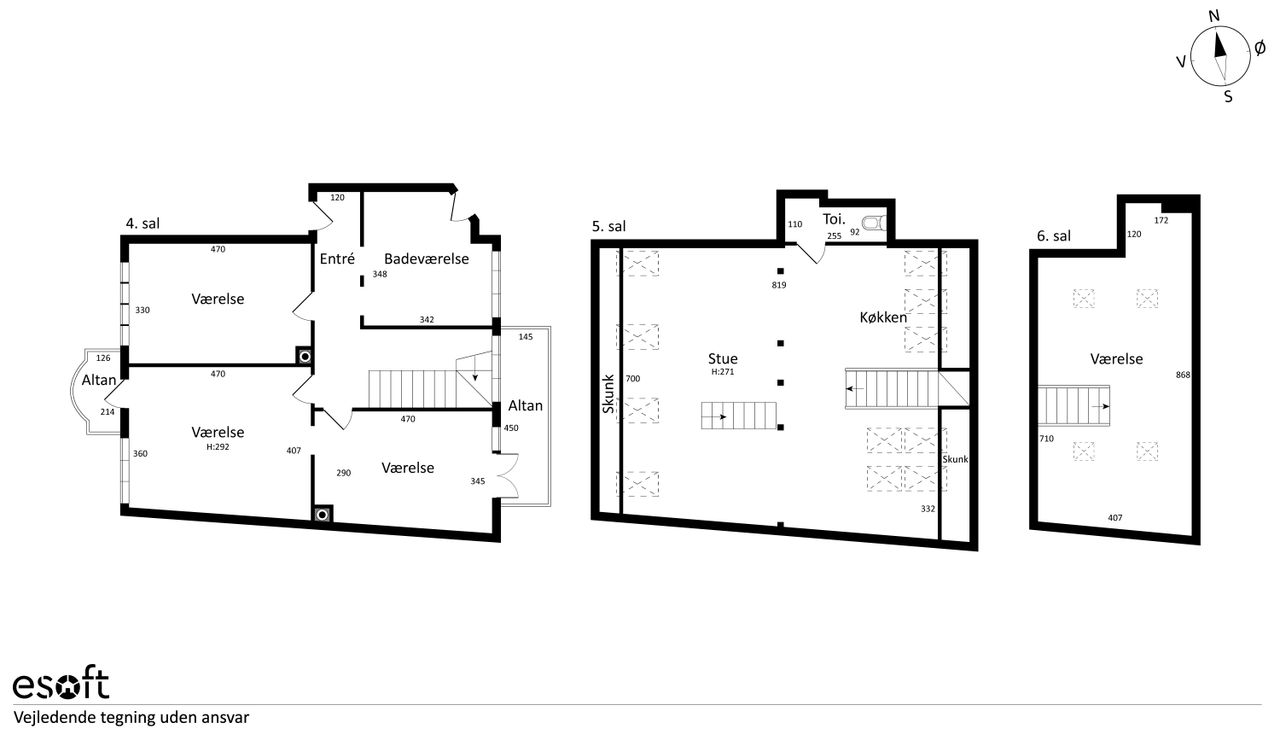 Indretning: Entré til fordelingsgang som giver adgang til lejlighedens stueplan, hvor de tre rum kan indrettes som soveværelser/stuer. Fra begge sider er der udgang til altan. Herudover stort rum, hvor der kan etableres badeværelse. Elegant trappeløb til 1.sal som består af stort alrum og ekstra toilet. Trappe til 2.sal som byder på 32 m2 disponibelt rum som kan indrettes efter behov. Lejligheden henvender sig til det pladskrævende par eller familien, som ønsker at bo i en udsigtslejlighed hævet over byen, på en af Frederiksbergs mest populære adresser.