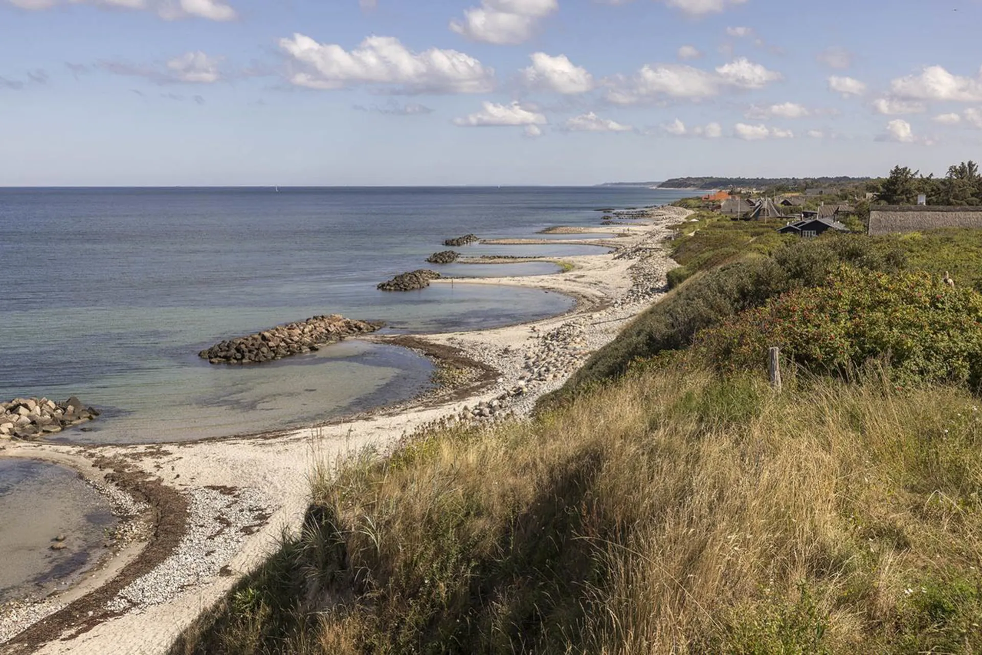 Udsigt så langt øjet rækker – mod den endeløse horisont, mod strandens bugtede landskab med den skulpturelle bølgebrydere og deres lommer, hvor man kan bade i noget nær det skønneste vand, vi kan tilbyde i dette land. Og lige om hjørnet ligger det naturskønne område med Skodsbjerg Fyr og det ikoniske Knud Rasmussens Hus, mens man i cykelafstand når Hundested Havn og Ullerup Skov.