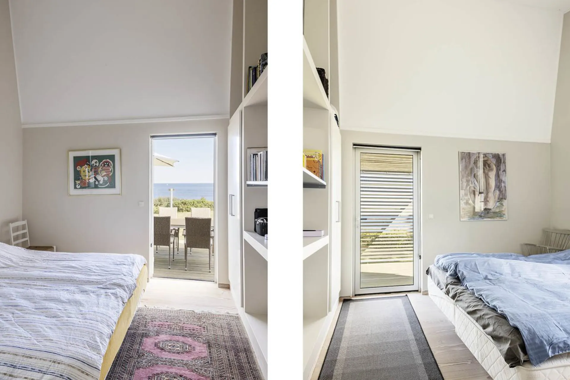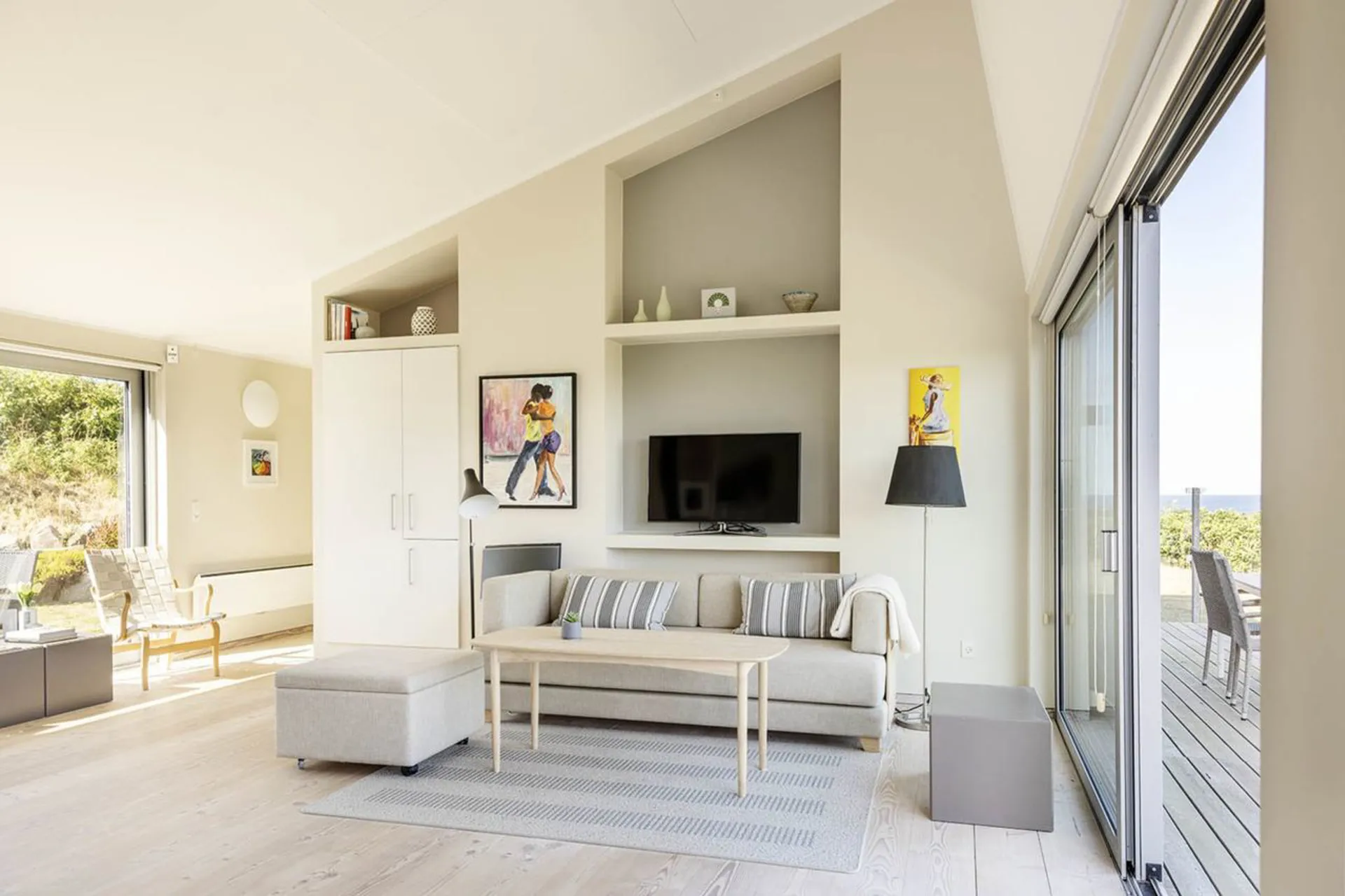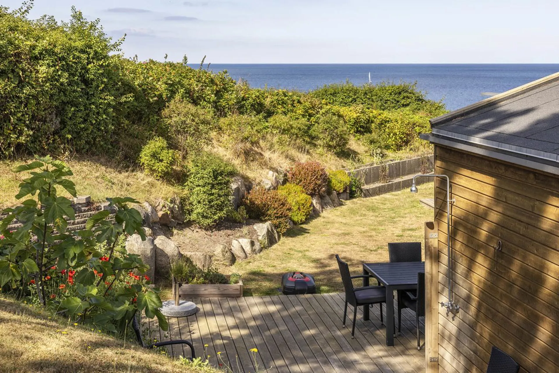 Indretning: Entré til stort alrum, der fordeler funktionelt indrettet køkken med spisestue og opholdsstue med brændeovn – det hele med udgang til det omkringliggende terrasseområde – i ét med haven, som ligger højt løftet for Kattegat, der virker som et spektakulært baggrundtæppe for hele sceneriet. I hver side af huset er der indrettet soveværelse med hvert sit tilknyttet badeværelse med brus og toilet.
