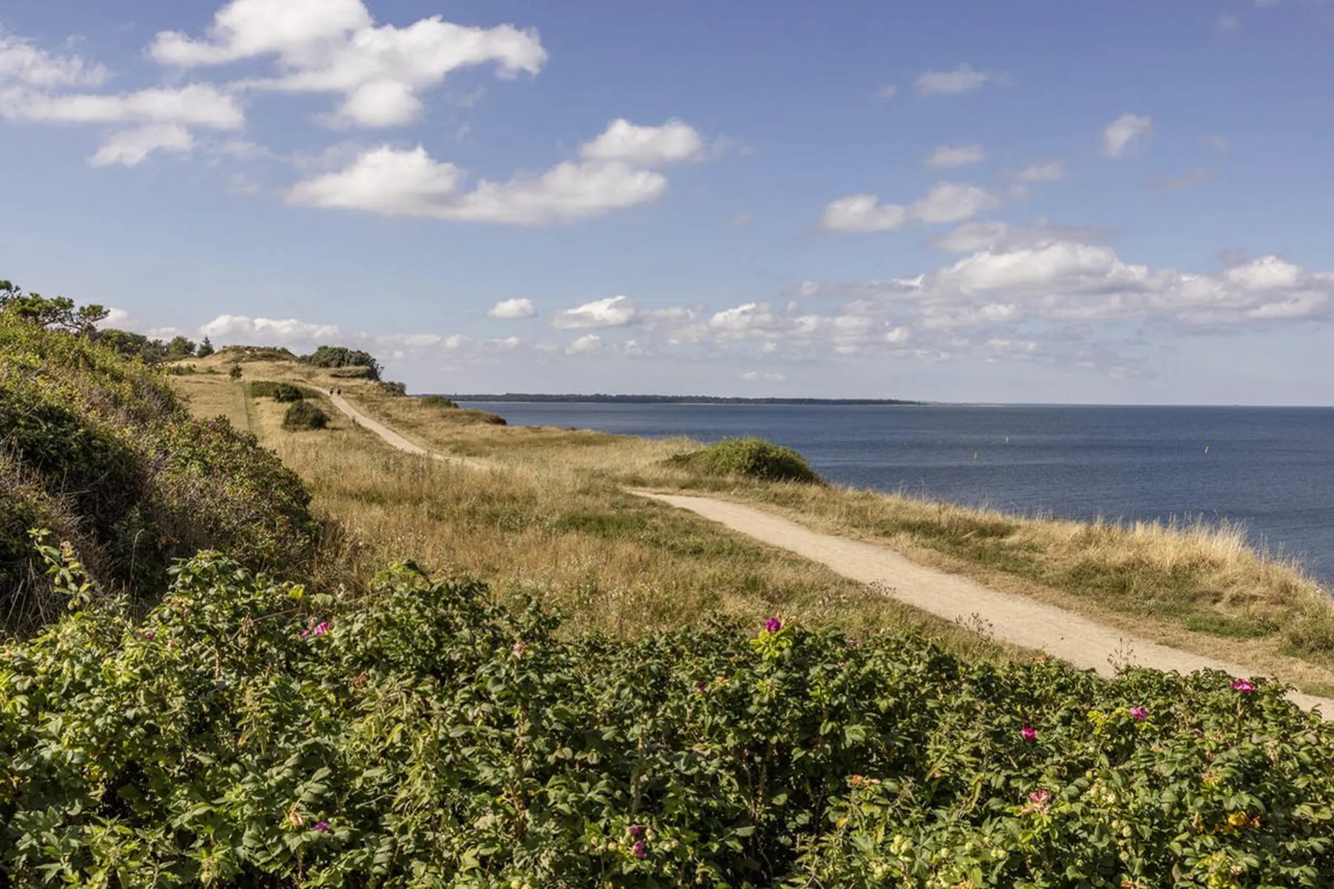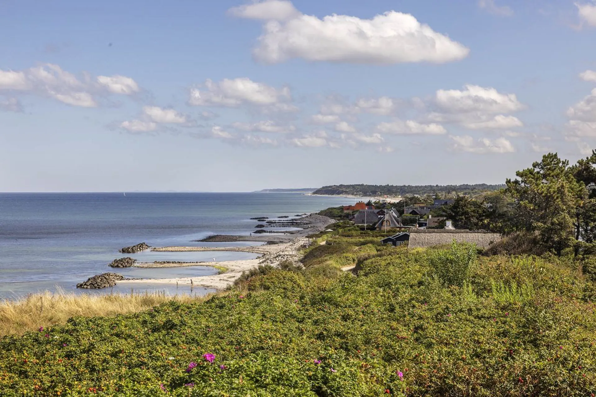 Udsigt så langt øjet rækker – mod den endeløse horisont, mod strandens bugtede landskab med den skulpturelle bølgebrydere og deres lommer, hvor man kan bade i noget nær det skønneste vand, vi kan tilbyde i dette land. Og lige om hjørnet ligger det naturskønne område med Skodsbjerg Fyr og det ikoniske Knud Rasmussens Hus, mens man i cykelafstand når Hundested Havn og Ullerup Skov.