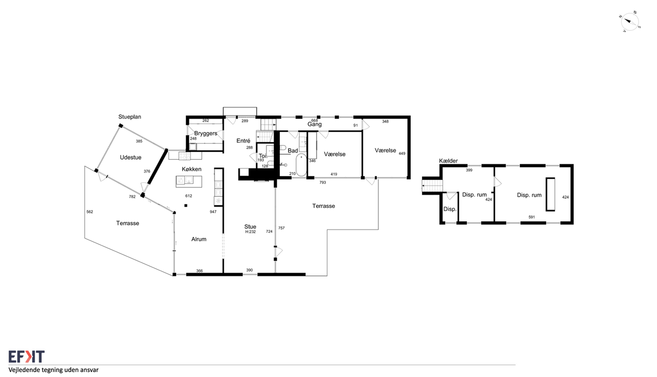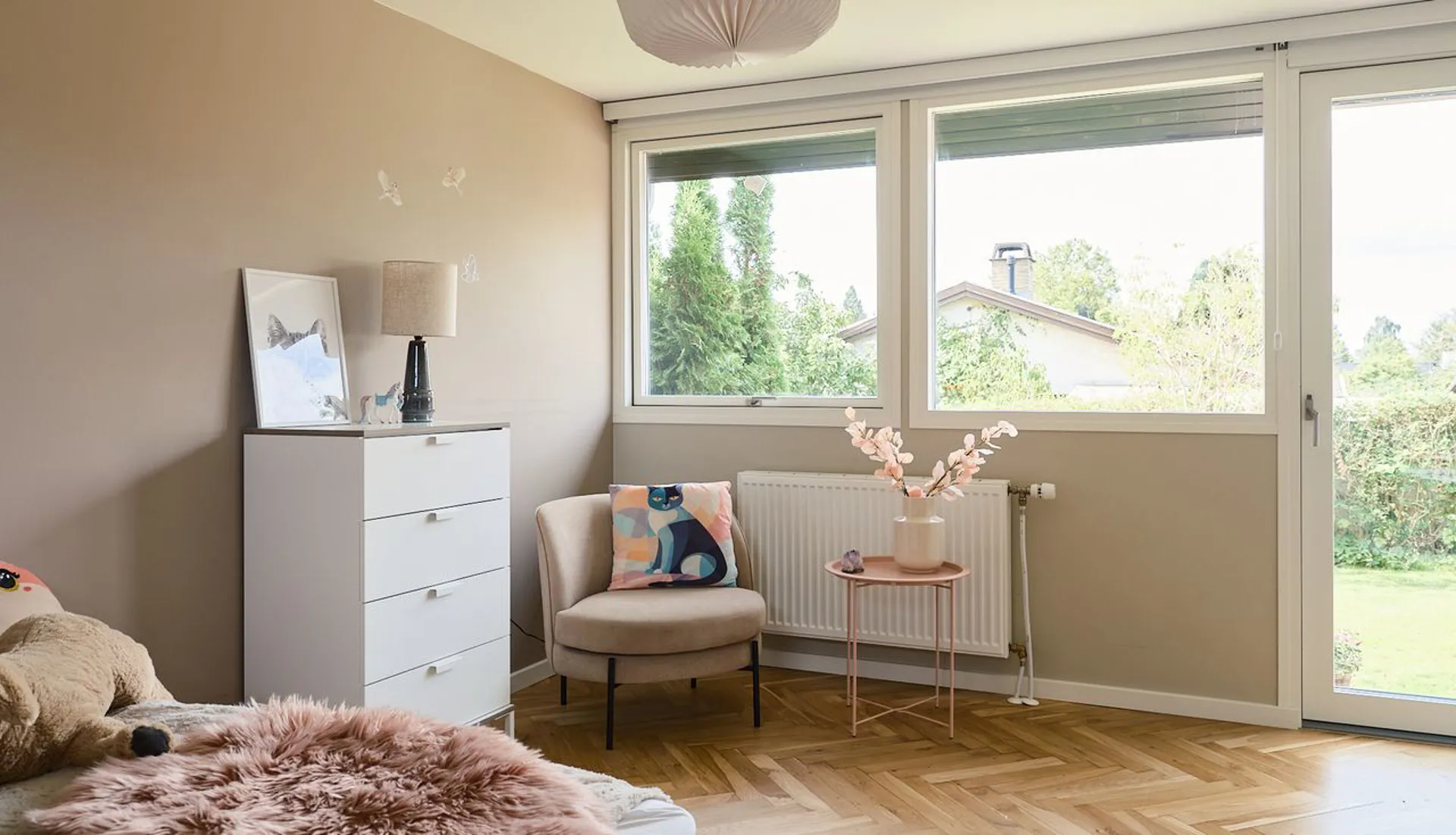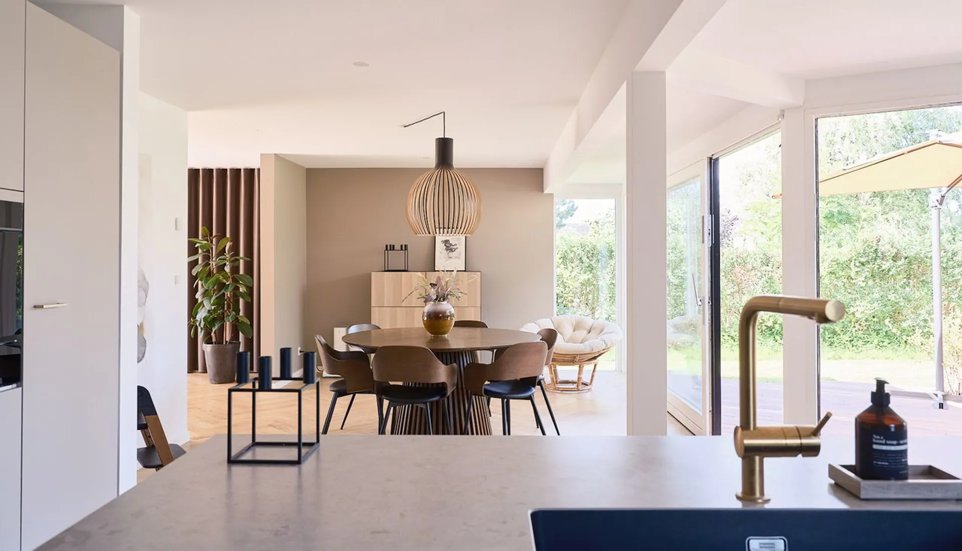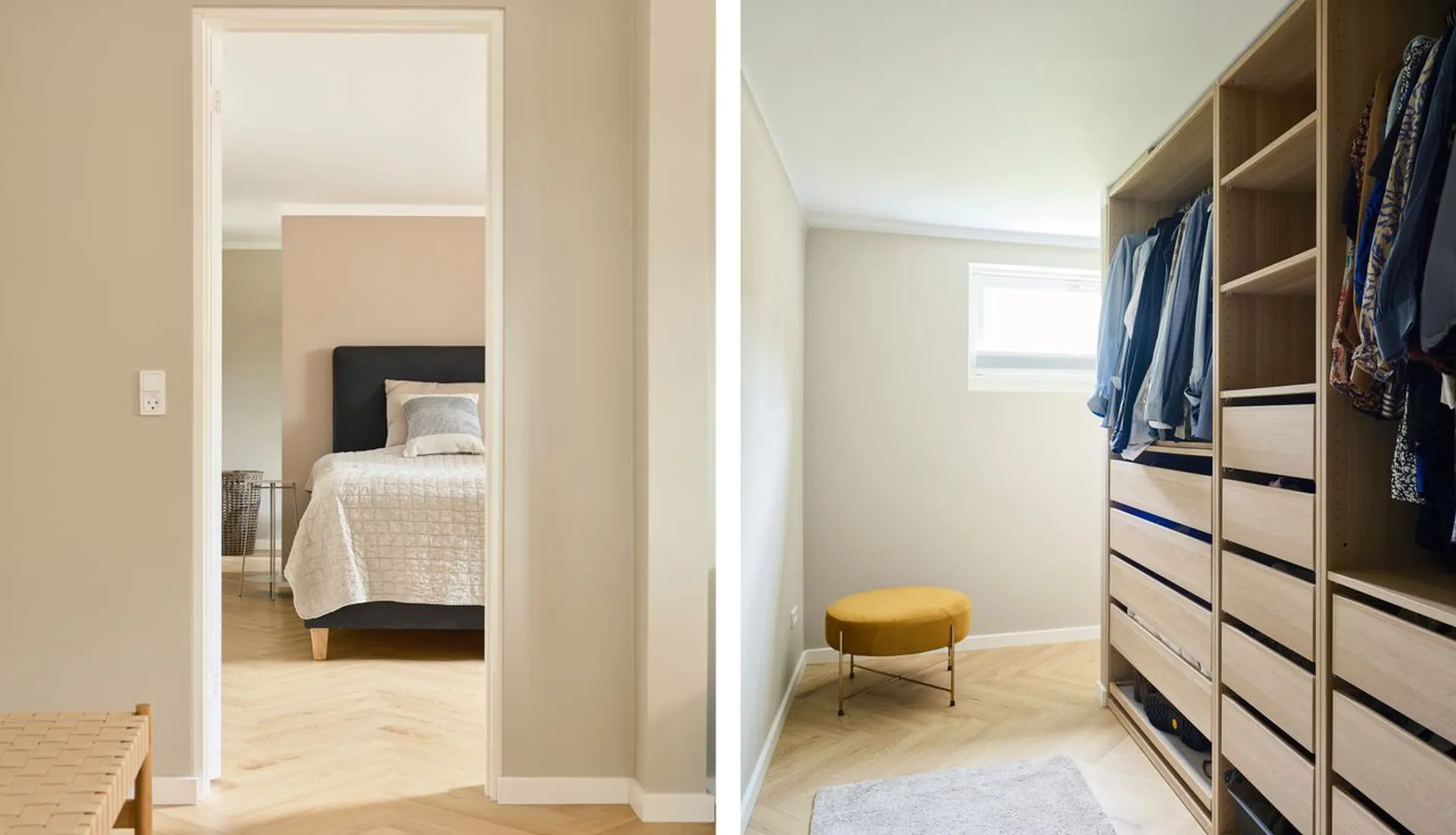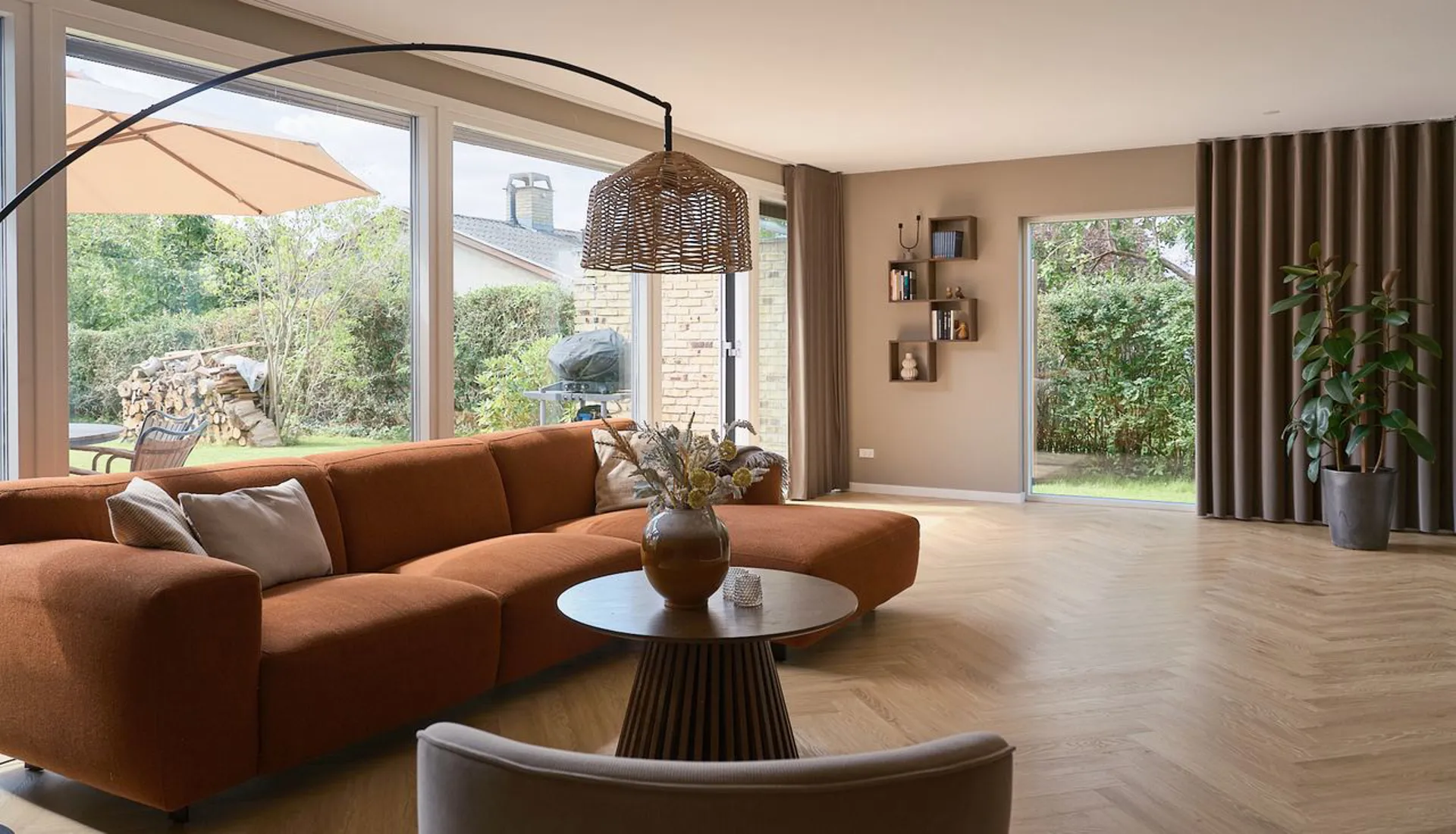 To store opholdsrum danner hjertet – tæt forbundet, men med mulighed for at være hver for sig. Køkkenet åbner sig mod et lyst køkkenalrum, hvor et stort glasparti kan foldes til side, så sommerens dufte og lyde glider lige ind. Stuen ligger på den anden side – tæt nok til, at snakken kan fortsætte, men med mulighed for ro, når det er dét, man trænger til.