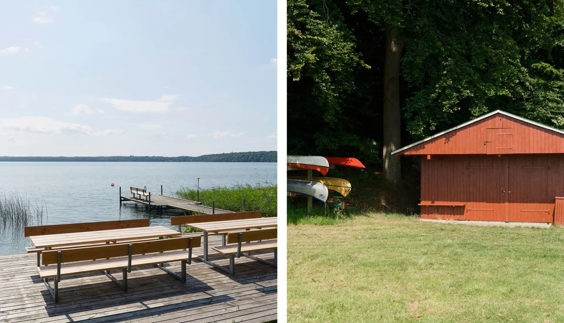 Få skridt fra hoveddøren fører en lille sti til den private og aflåste badebro, som kun medlemmer af grundejerforeningen, Søgaarden, kan benytte sig af. Her kan en dukkert tages både sommer og vinter eller kajakken kan glide stille ud i morgendisen. På Skovbakken 69 lever man lige så meget udenfor som indenfor.